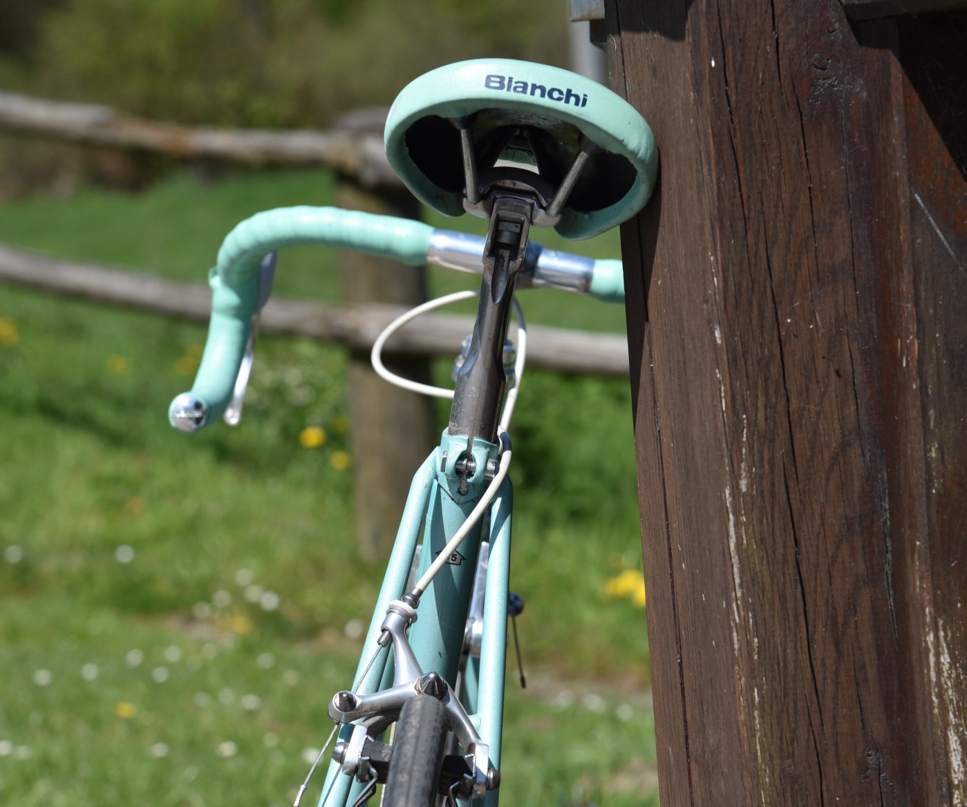 Nachdem mein Sohn nun ein Bianchi in Celeste besaß wurde natürlich auch mein Blick auf Marke und Farbe gelenkt. Natürlich kam nur eine Farbe in Frage: Celeste. nach einiger Zeit wurde ich fündig. Ein Rekord 925 mit kompletter Campagnolo-Ausstattung.