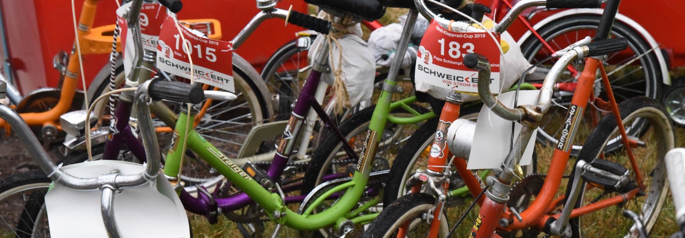 Irgendwann im letzten Jahr stieß ich auf die Internetseite des Pfälzer-Klappvereins. Welch skurriler Verein, der sich zum Ziel gesetzt hatte, dem Kult des Klapprades aus den 70ern zu frönen. Die Mitglieder taten dieses mit einem so ernst gemeinten Humor, dass ich tiefer in die Seiten eindrang. Vom Pfälzer Klappverein ist es nur eine Kettenblattumdrehug zum Kalmit Klapprad Cup. Jedes Jahr am ersten Wochenende im September startet eine immer größer werdende Gemeinde von Klapprad-Jüngern und – Verehrerinnen um mit den Juwelen der Radbaukunst, Klappräder ohne Gangschaltung auf 20“-Bereifung, einen Vergleich der Fahrkunst auszutragen. War es eine gewisse Scham, in Zeiten aufkommender Carbon-Hightech-Renner mit zwei Dutzend Gängen auf Rädern mit Reifen in Kinderkarrengröße zu fahren oder einfach der Wunsch, über die Preise für Schnelligkeit hinaus noch die Fantasie der Fahrerinnen herauszufordern? Jedenfalls musste ein Motto für das Rennen her, dass in Zeiten der digitalen Farbfotografie dem Bilderrausch der Betrachter keine Grenzen setzt. Kurzum: Bilder und Videos waren einfach zu köstlich um sich dieses Ereignis entgehen zu lassen. Nach Themen wie „Rotkäppchen strampelt sich einen bösen Wolf“, „Menschen, Tiere und Scharniere“ oder „Junge schalt nie wieder“ war die Entscheidung klar: da wollten wir dabei sein.