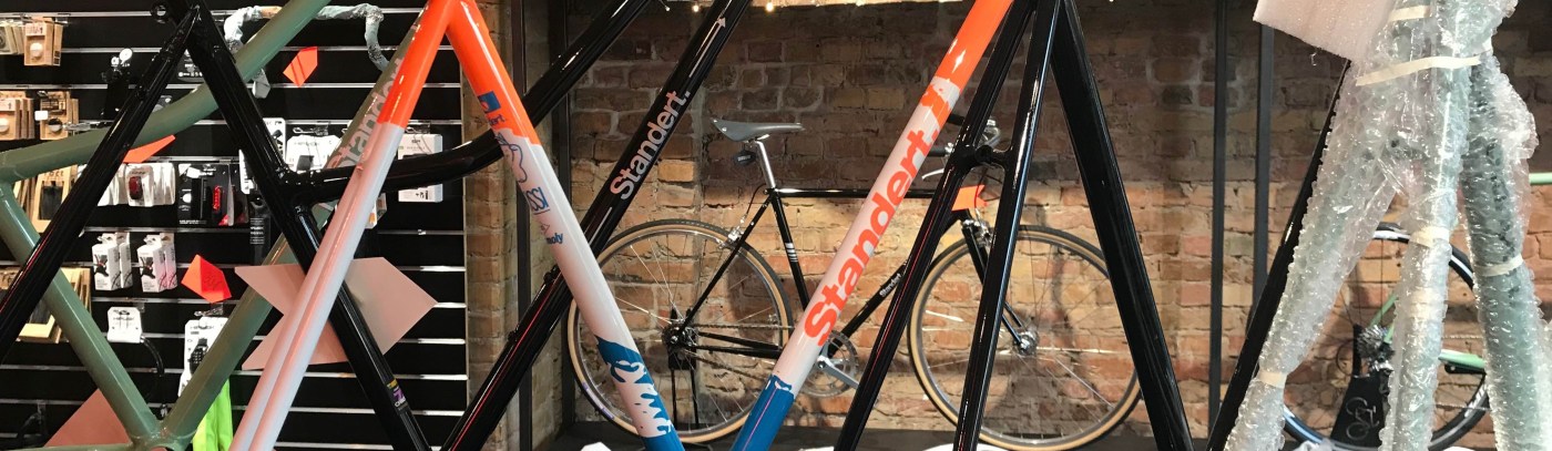 Die Rahmen in und auf den schwarzen Regalen vor der ungeputzten Ziegelwand, das war das Bild, das ich immer im Kopf hatte, wenn ich an Standert dachte. Bei meinem letzten Besuch in 2018 stand mitten im Laden ein schwarzer Stahlrenner in klassischer Rahmengeometrie. Viele Blicke galten den Maschinen mit der modernen Geometrie und den geraden, breiten Gabeln. Doch mein Faibel sind einfach die klassischen Stahlrenner.