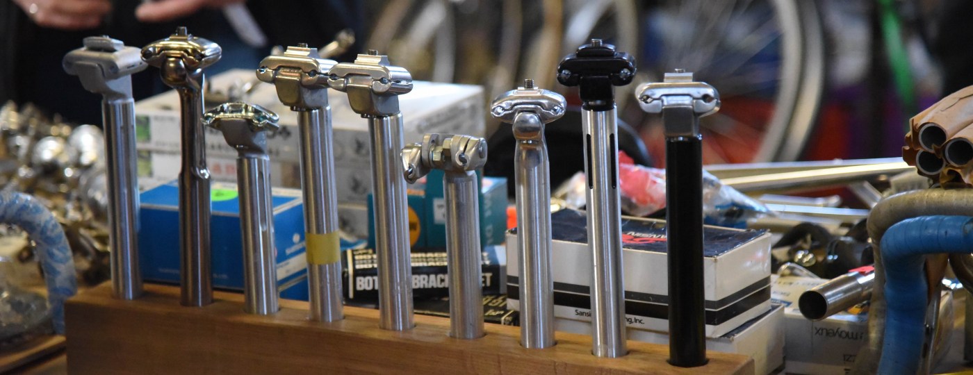 10.05 rollen wir auf den Parkplatz, der nur noch wenige freie Plätze aufweist und die lange Schlange vor dem Gemeindezentrum in Wittgoor zeigt uns, dass wir genau zur rechten Zeit eingetroffen sind. Die drei Euro entrichtet, das schicke Einlassband um damit man die Beute zwischendurch ins Auto bringen kann und dann geht’s ins Gewühle. Werner sacht noch: “verabreden brauchen wir uns nicht, hier läuft man sich ja ständig über den Weg“ und schon haben wir uns am ersten Stand aus den Augen verloren. Schon bald stelle ich fest, dass es heute anstrengender wird als bei meinem letzten Besuch. Meine Liste ist genauso lang wie vielfältig. Französische Teile für das CNC Spezial, Gerry Burgess Bauteile und Campa-Komponenten vom Beginn der 60er für das Holdsworth und Campagnolo Schaltungen vom Beginn der 80er für das TI Raleigh und den Mike Mullett-Rahmen. Mir war natürlich bewusst, dass ich nur einen kleinen Teil würde finden können, vor Allem, wenn das Budget auch noch begrenzt ist.