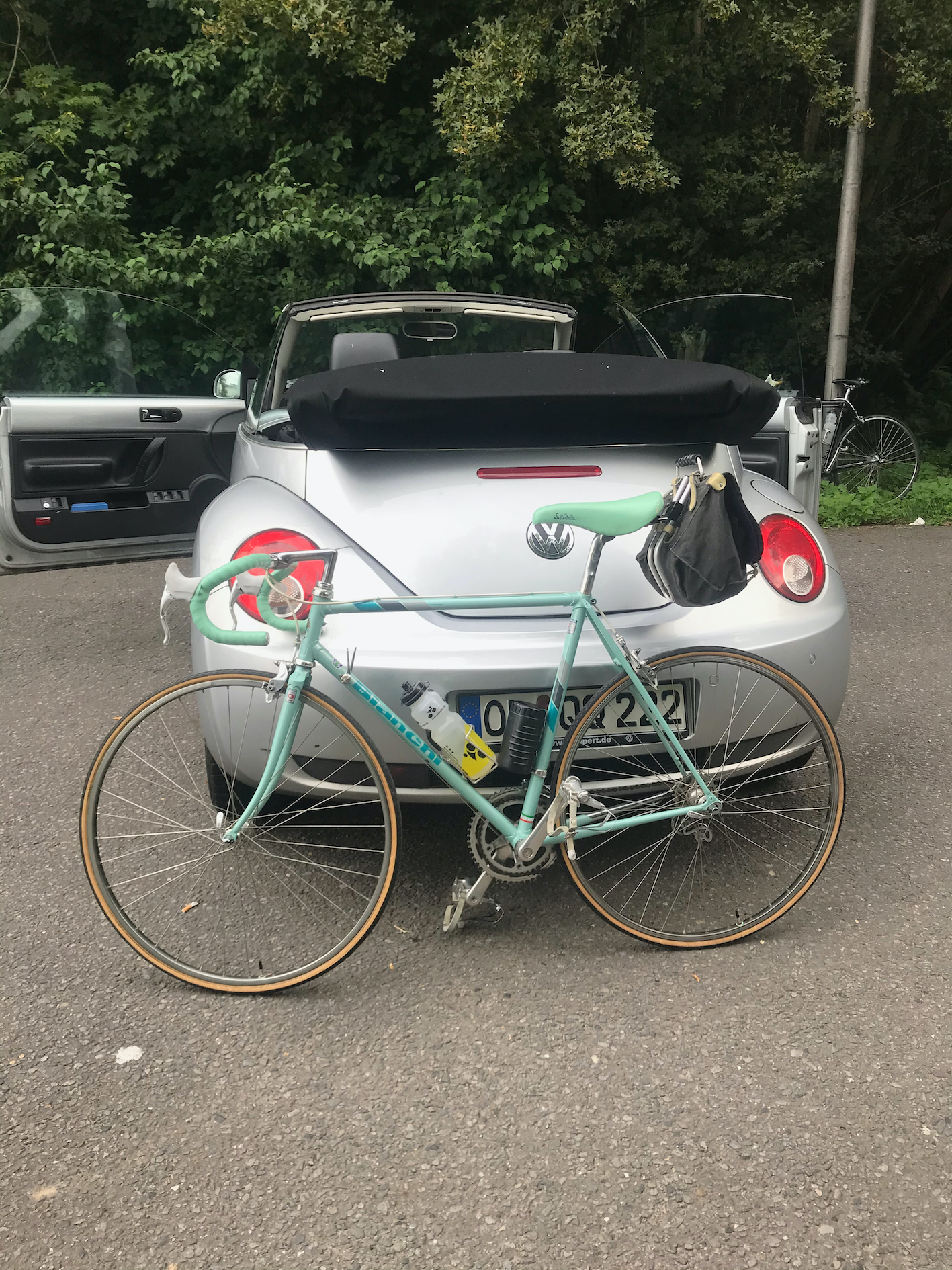Lang ist‘s her dass Jürgen im Sommer 2020 zur Rennradrunde durch das Osnabrücker Land geladen hatte. Im Rennradforum waren einige Empfindlichkeiten voran gegangen, da es zu Termindoppelungen kam aber jetzt war alles geklärt und dass wichtigste lag vor uns: eine flotte Runde durch den Osten des Osnabrücker Umlandes. Ich war schon etwas angespannt, da ich nicht den Ehrgeiz und den Leistungsstand der anderen Teilnehmer kannte. Schließlich wollte ich ja nicht die Rote Laterne bekommen oder gar vom Besenwagen eingesammelt werden. Am Vortag war dann noch die wichtigste Frage zu klären: Welches Radel hättens denn gern (frei nach Robert Lemke). Eigentlich hatte ich mir vorgenommen das gerade angekommene Holdsworth Cyclone von 68 zu wählen, aber bei der Critical Mass zwei Abende zuvor machte die Schaltung noch Probleme. Also besser auf bewährtes Material zurückgreifen. Dass Bianchi Rekord 925 hatte bisher keinerlei Mucken gemacht und passt wie angegossen. In seinem Farbton „Mint“ ist es trotz der Fehlfarbe für echte Bianchi-Fans immer wieder ein Hingucker. Also die Laufräder ausgebaut, alles gut verpackt (ich sollte mir doch mal Laufradtaschen zulegen) und hinten ins Cabrio verstaut.