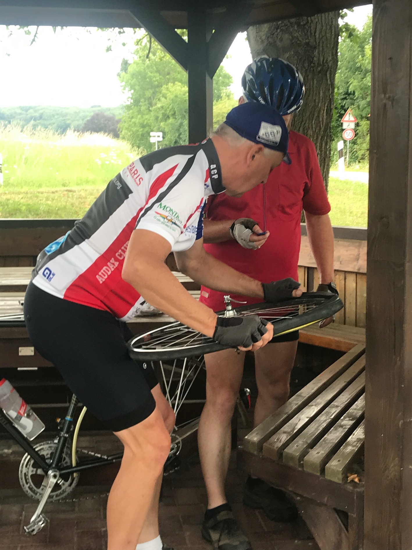 Am vereinbarten Treffpunkt in Gesmold hatten schon einige Teilnehmer ihre Räder startklar gemacht. Wartet jetzt alles auf mich? Und wie es dann so ist, klemmt man sich die Finger, weil man das Hinterrad nicht in der vorzeigbaren Geschwindigkeit und Eleganz reingefummelt bekommt. Endlich sitzt es und ich bin startklar. Aber alle sind noch am fachsimpeln, ein paar Nachzügler treffen noch ein und dann schwingen wir uns auf die Räder.