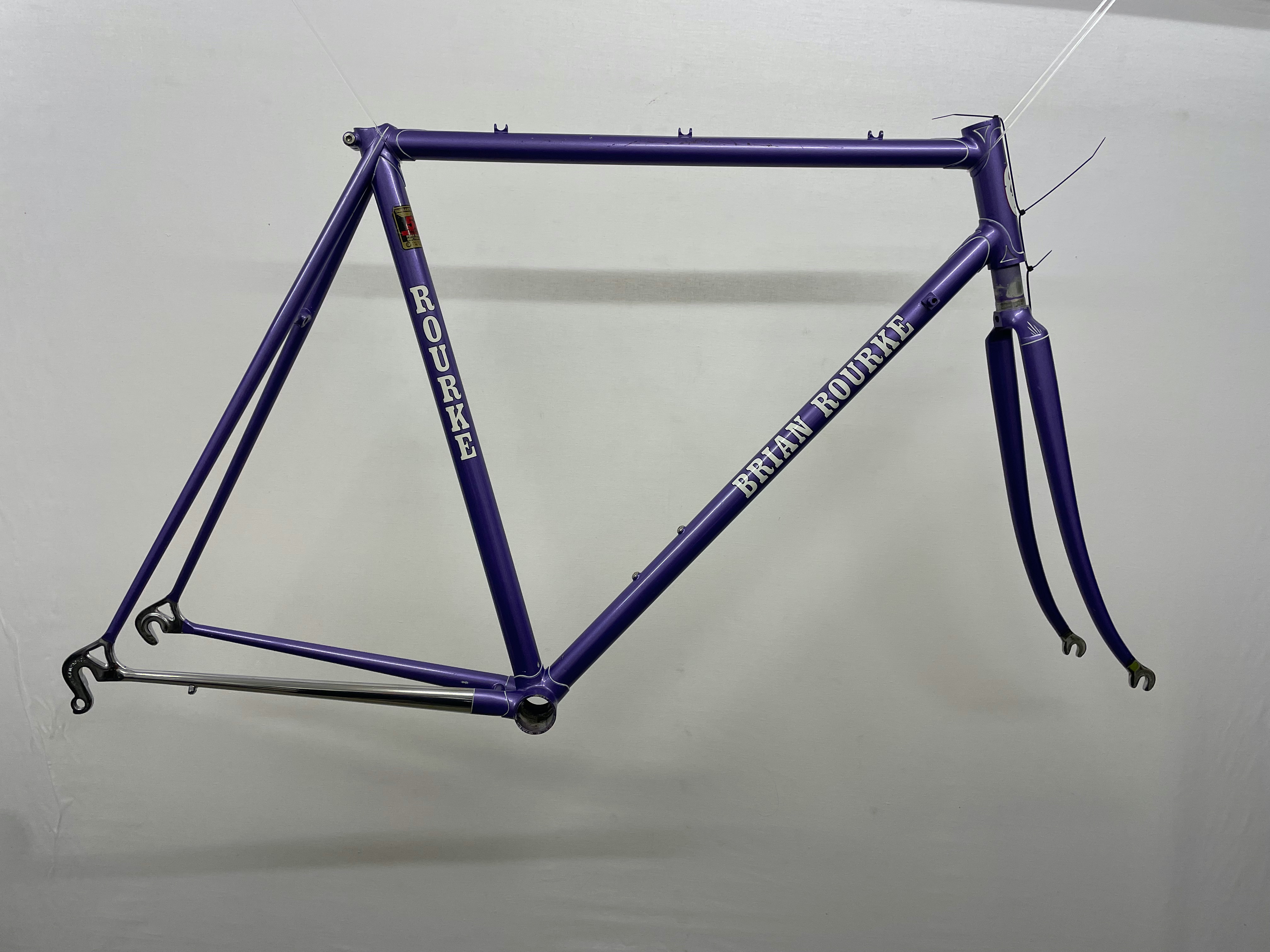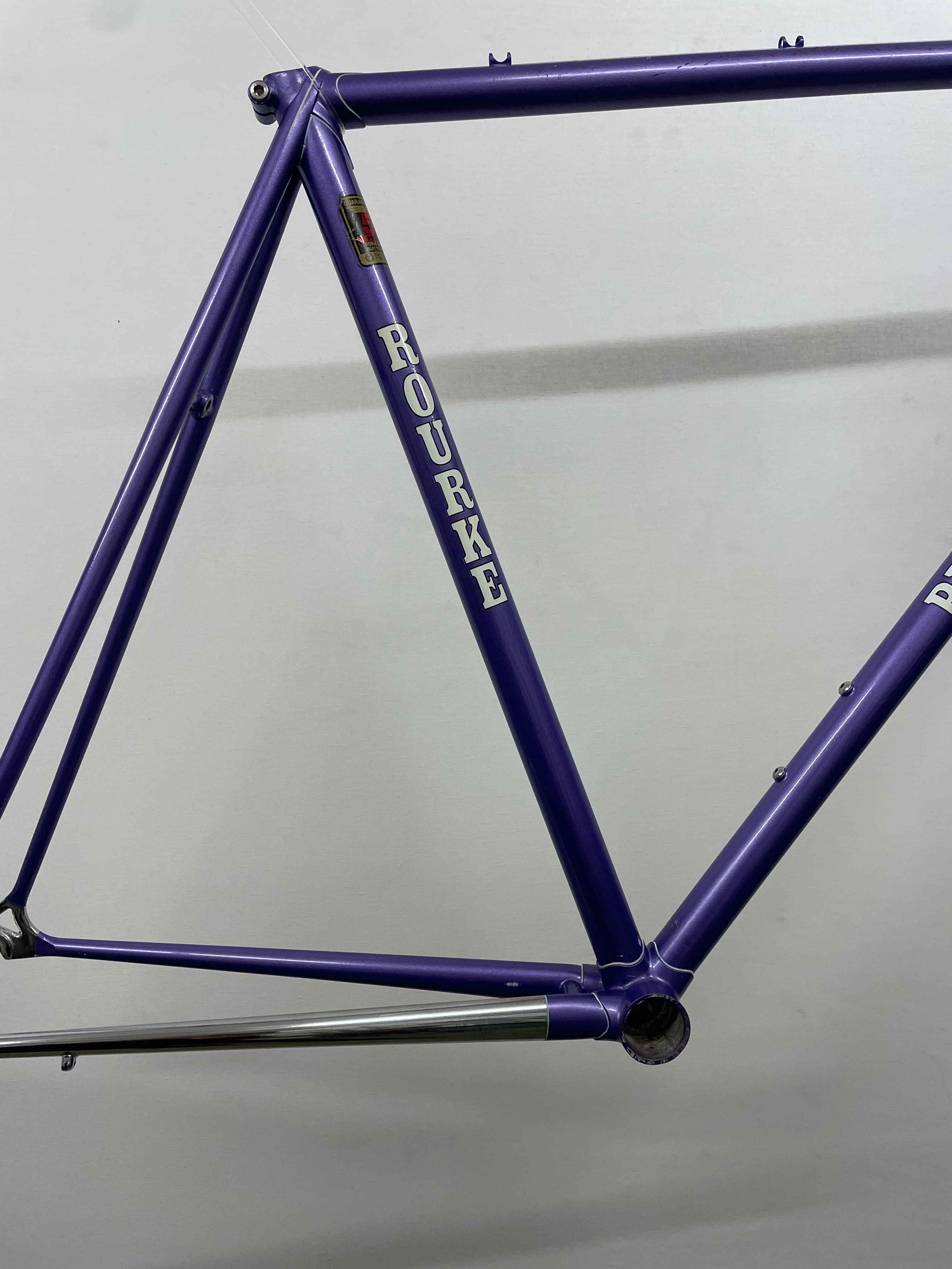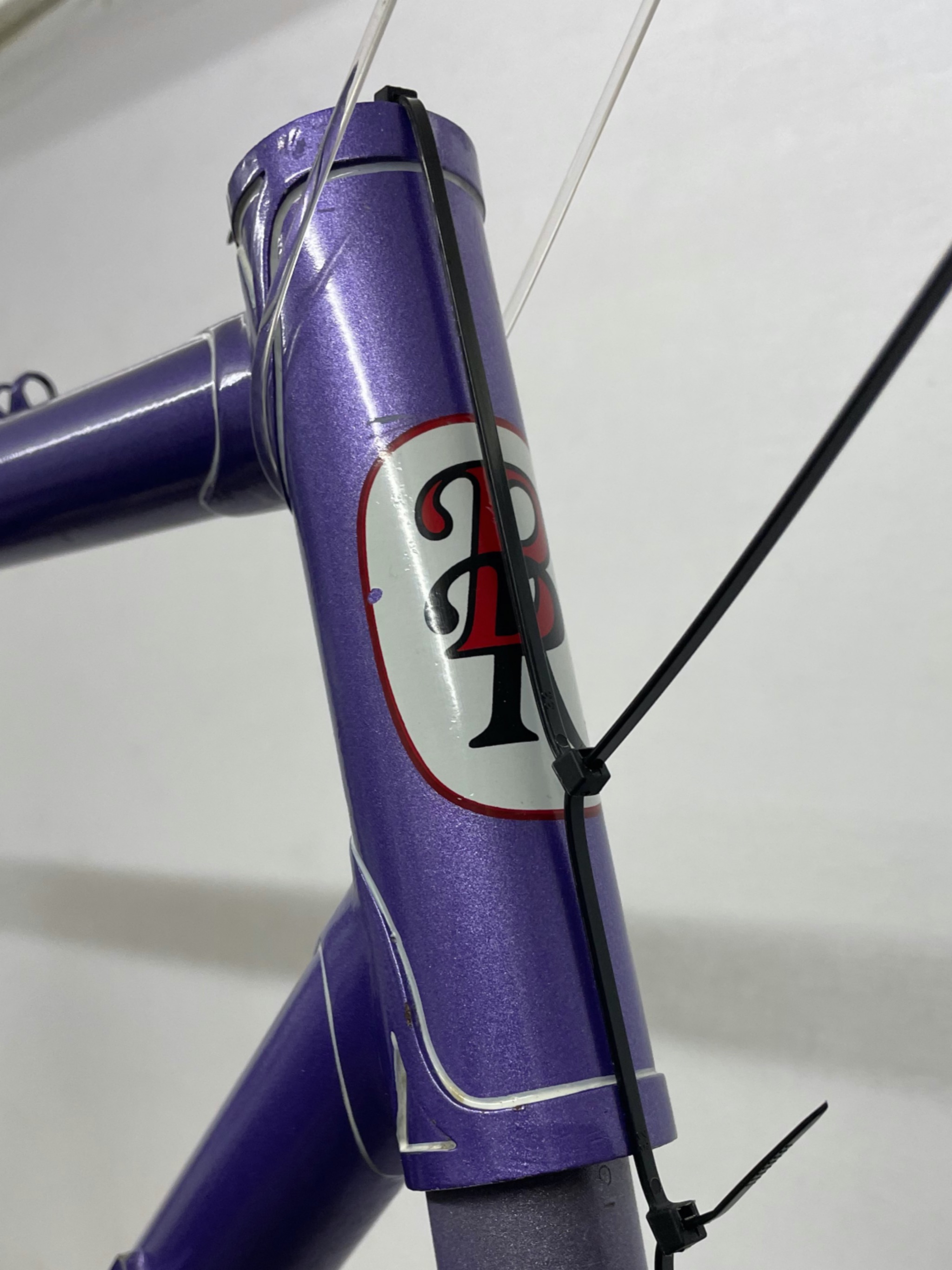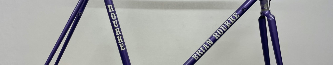 A Brian Rourke-Frame on the Internet catch my eye because of the 531c tubes and the strong violet. It fits into my collection of british cycles made from Reynolds tubing. Brian Rourke was a cyclist himself and has won numerous titles. Among others he drove the milk race. He has been building custom-made frames since 1972. In the meantime, his son Jason has taken over the frame production. Famous cyclists have achieved numerous victories with his frames. My frame has the frame number 1306 and could be from 1983/84. It has the typical shape of the seat stays on the seat tube and the specialty of only having one base for the down tube gear lever. Designed in a strong violet with white lines, it immediately fascinated me. Robert Penn describes in his book “It’s all about the bike” how he has his frame built by Jason Rourke. Penn’s search for the dream bike was also filmed. At the end of the film, Rourke and Penn are looking for the right color and come across a paint pot with purple varnish. Should that be the color of my frame?