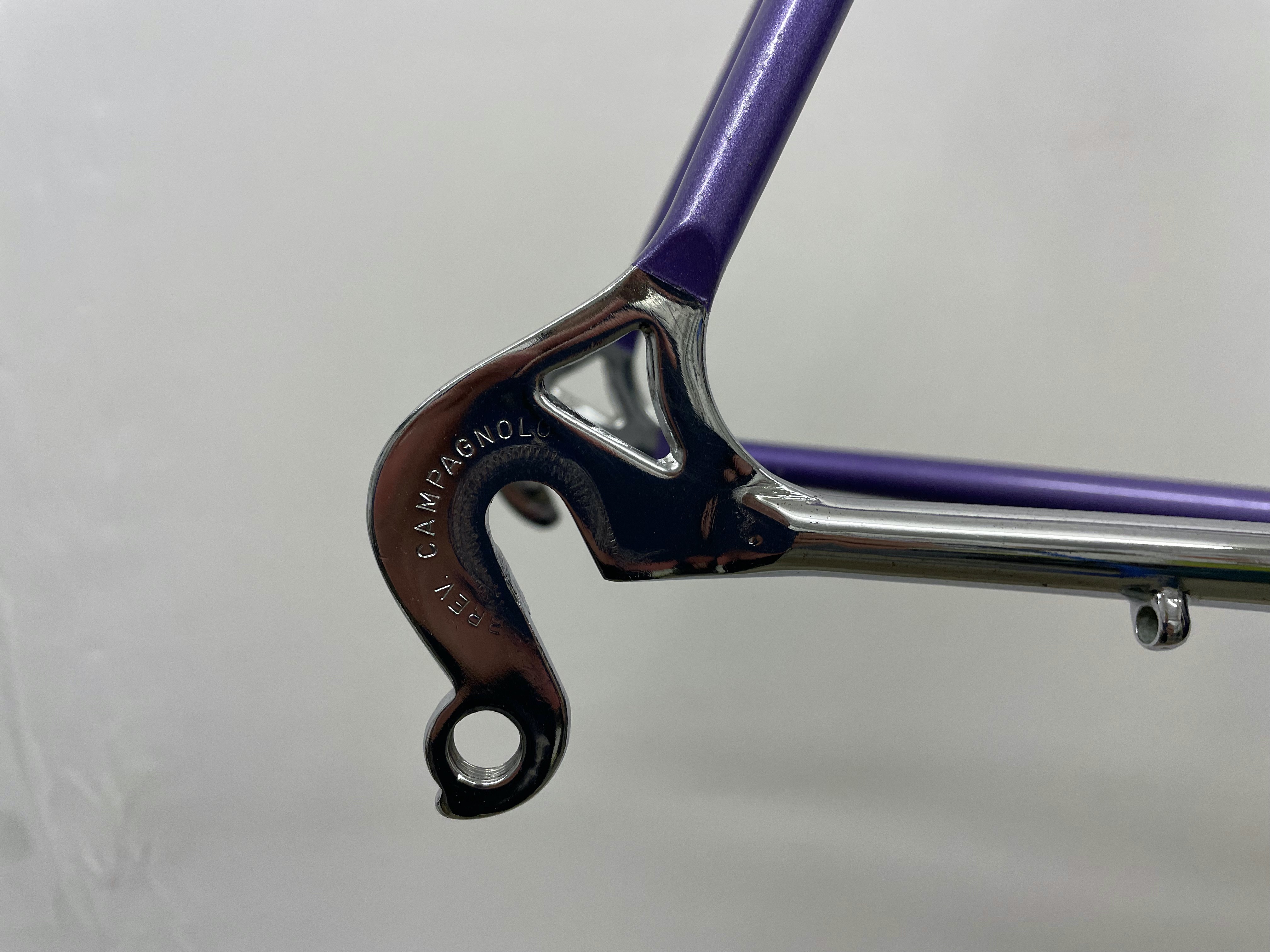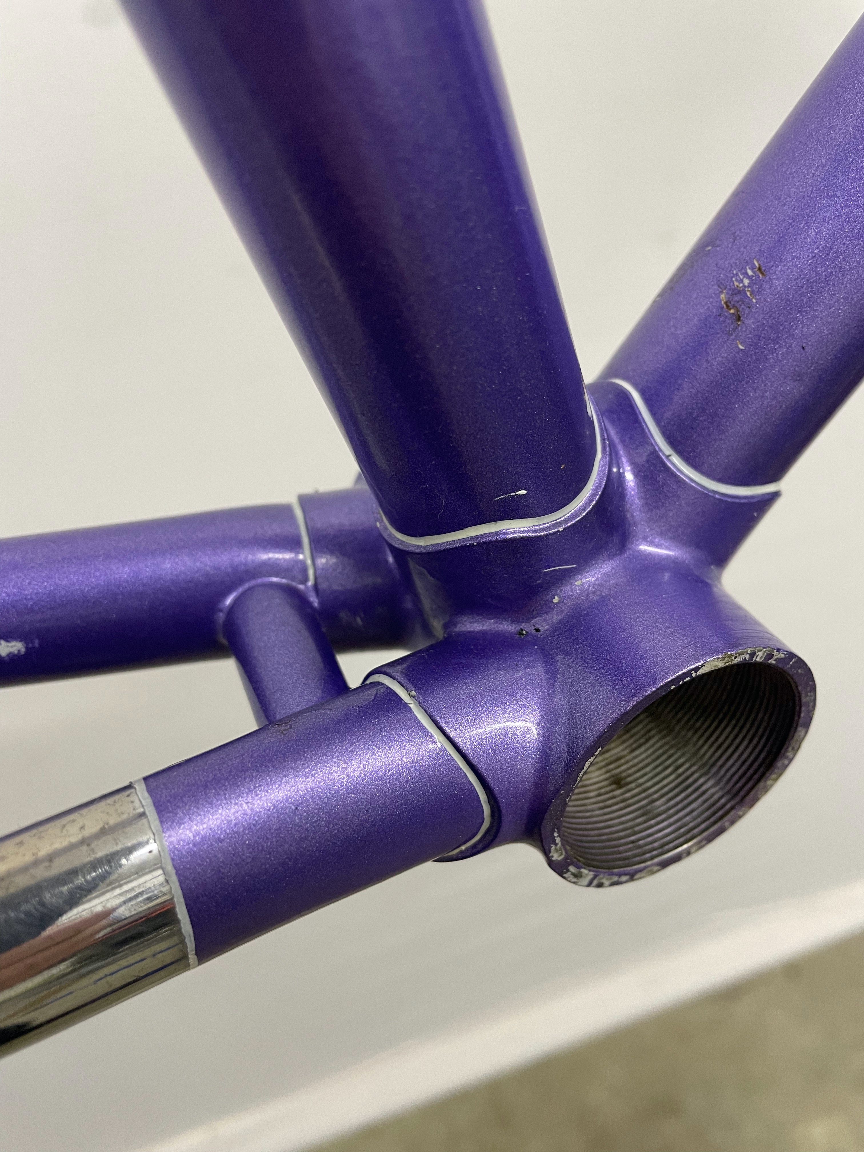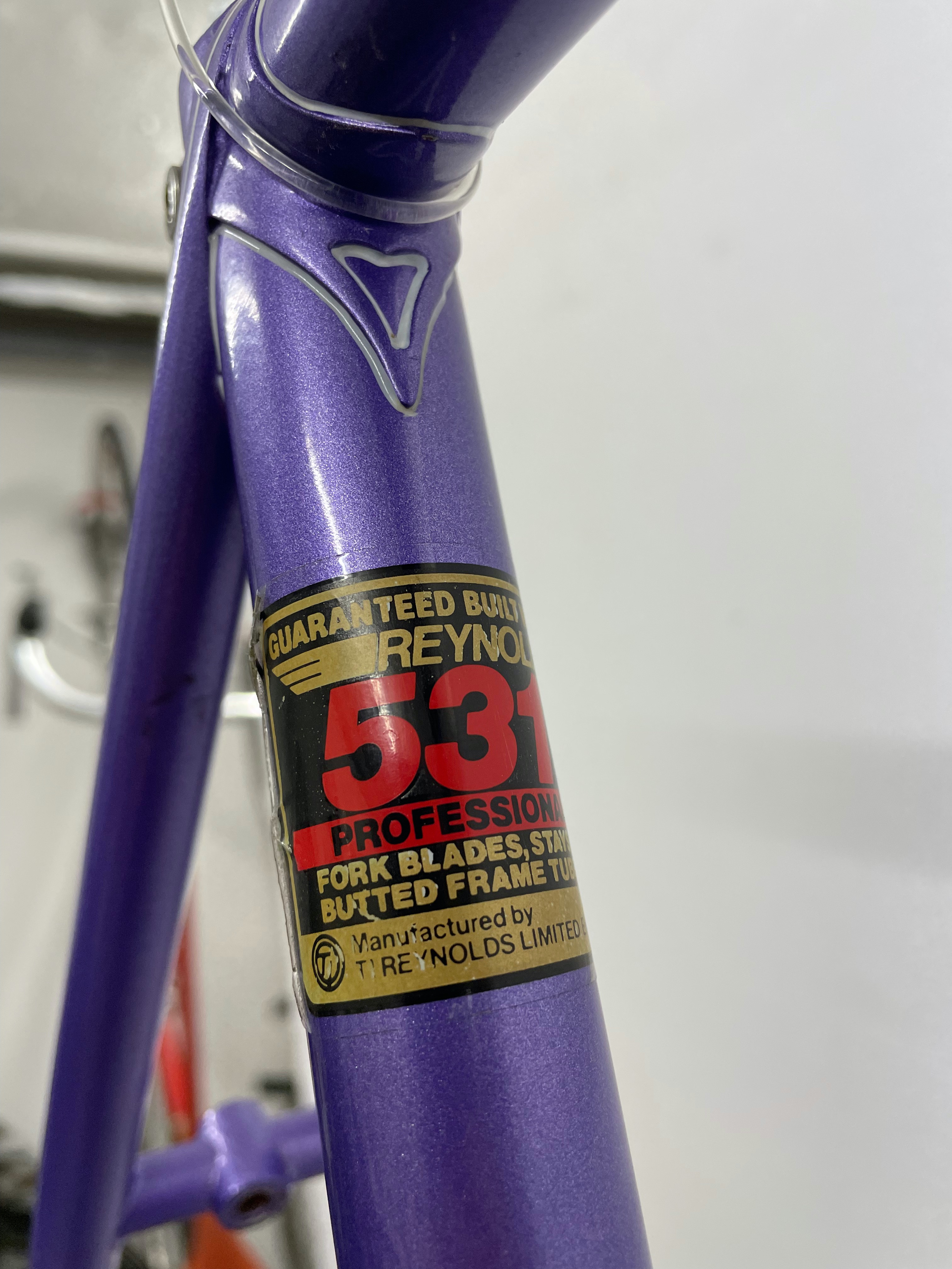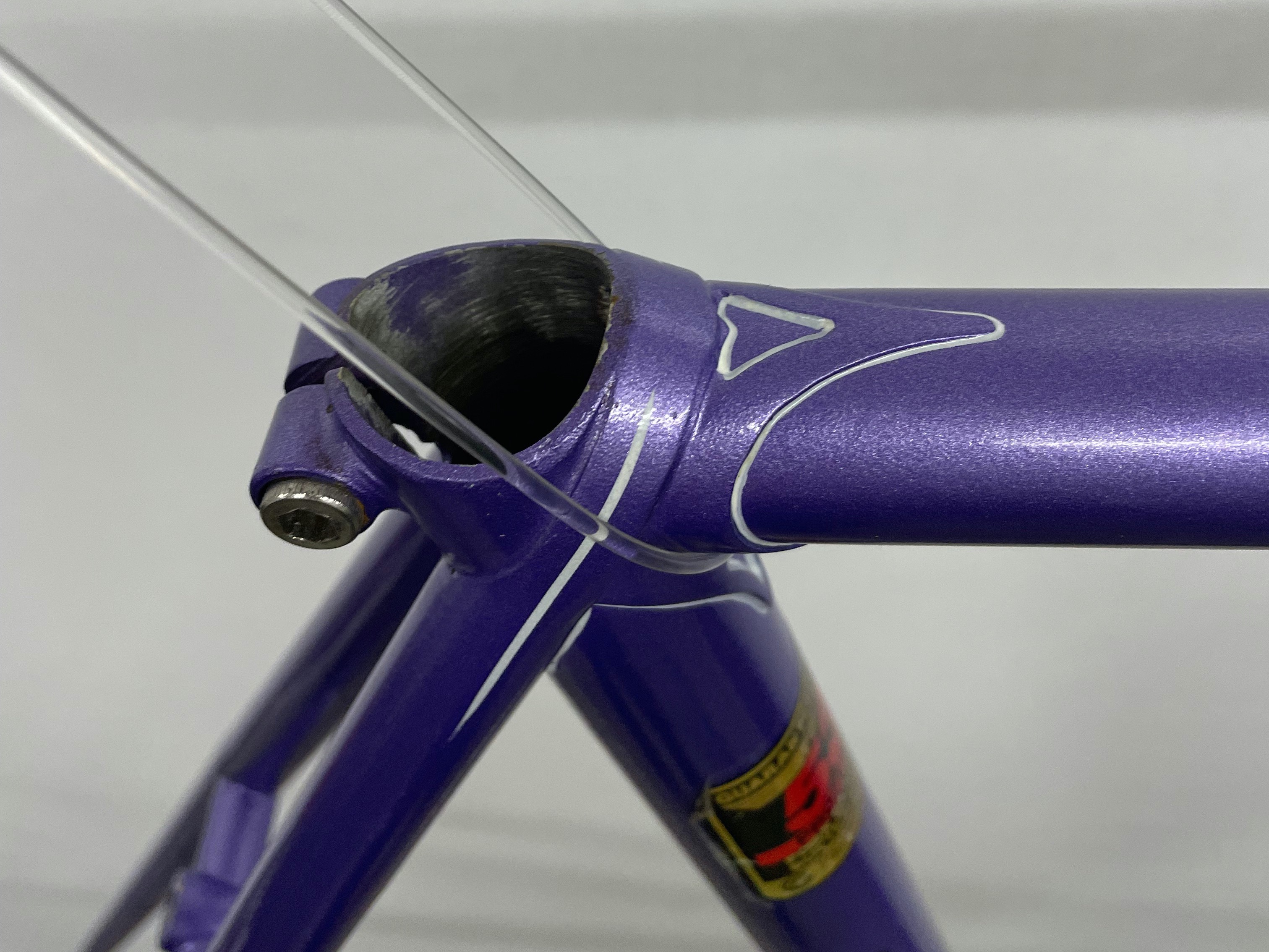 A Brian Rourke-Frame on the Internet catch my eye because of the 531c tubes and the strong violet. It fits into my collection of british cycles made from Reynolds tubing. Brian Rourke was a cyclist himself and has won numerous titles. Among others he drove the milk race. He has been building custom-made frames since 1972. In the meantime, his son Jason has taken over the frame production. Famous cyclists have achieved numerous victories with his frames. My frame has the frame number 1306 and could be from 1983/84. It has the typical shape of the seat stays on the seat tube and the specialty of only having one base for the down tube gear lever. Designed in a strong violet with white lines, it immediately fascinated me. Robert Penn describes in his book “It’s all about the bike” how he has his frame built by Jason Rourke. Penn’s search for the dream bike was also filmed. At the end of the film, Rourke and Penn are looking for the right color and come across a paint pot with purple varnish. Should that be the color of my frame?