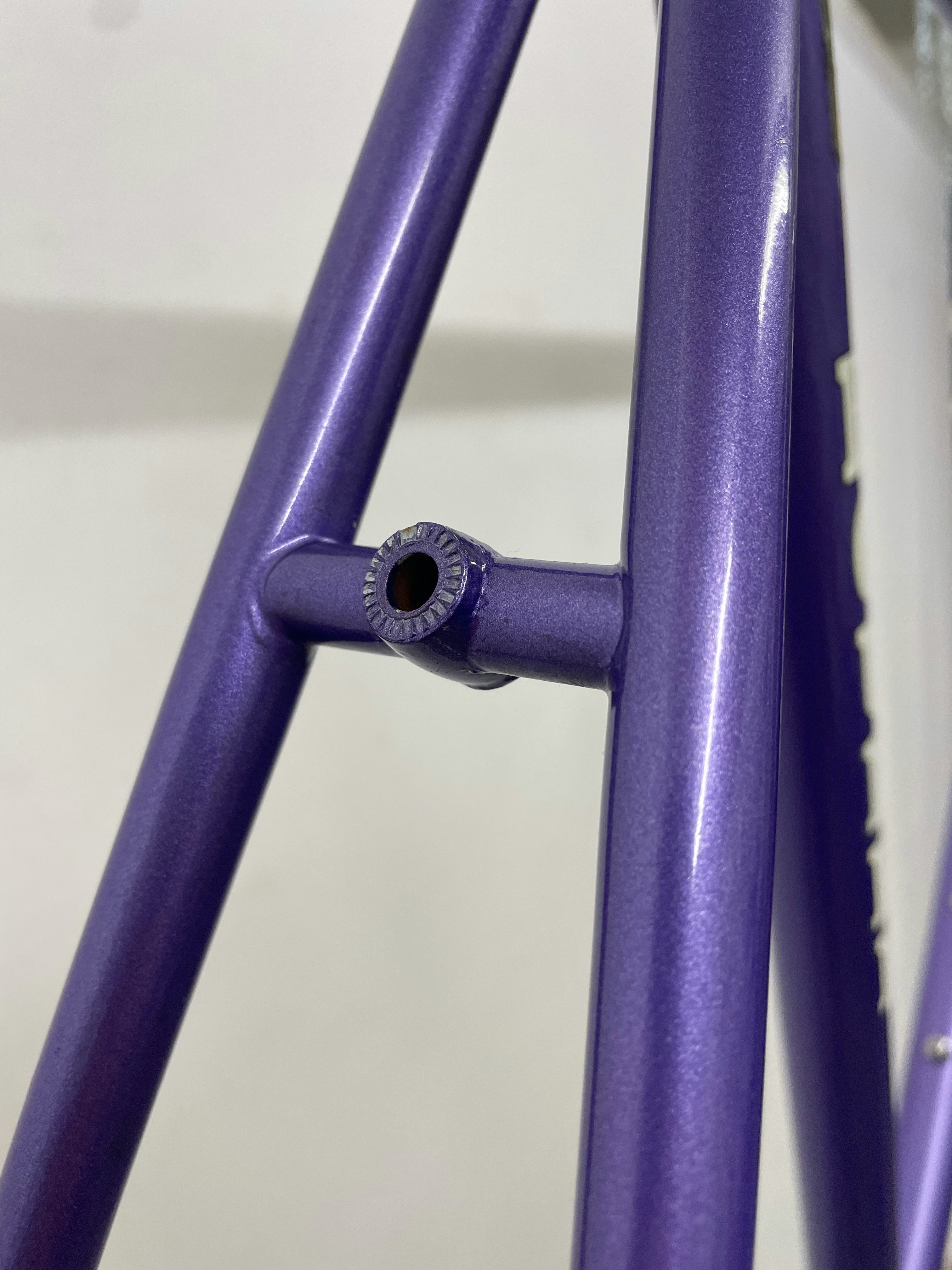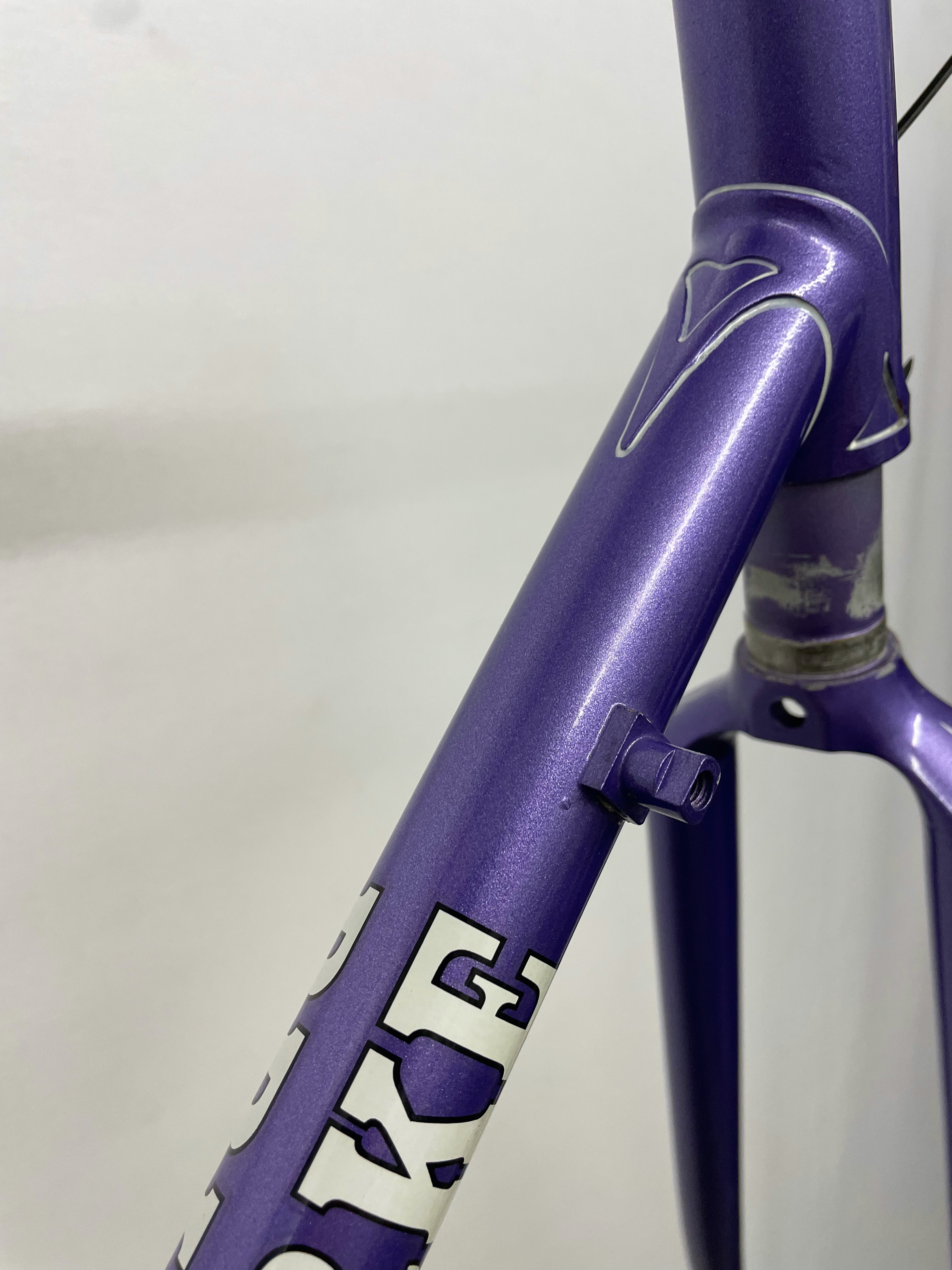 Auffällig war dann ja noch die Farbe. Der Rahmen kommt in einem kräftigen Violett mit Metallic-Effect daher und zeigt weiße Linierungen auf. Dazu der kräftige weiße „Brian Rourke“ Schriftzug auf Unter- und Sattelrohr. Nun bin ich absolut kein Fußballfan aber diese Farbkombination passt zum örtlichen Profiklub. Da ich beruflich ab- und zu mit dem Verein zu tun habe, wäre es natürlich schon ein netter Geck zum nächsten Termin mit einem Rad in Vereinsfarben vorzufahren. Also nach einigen Wochen des um die Anzeige Herumschleichens habe ich ihn gekauft.