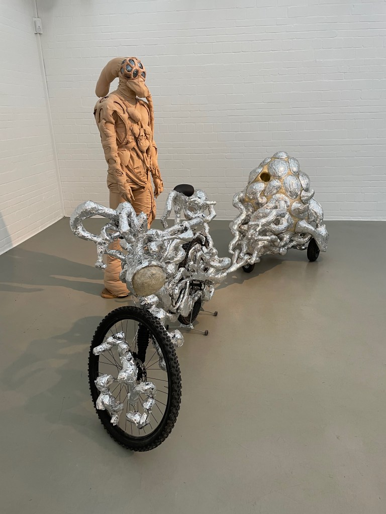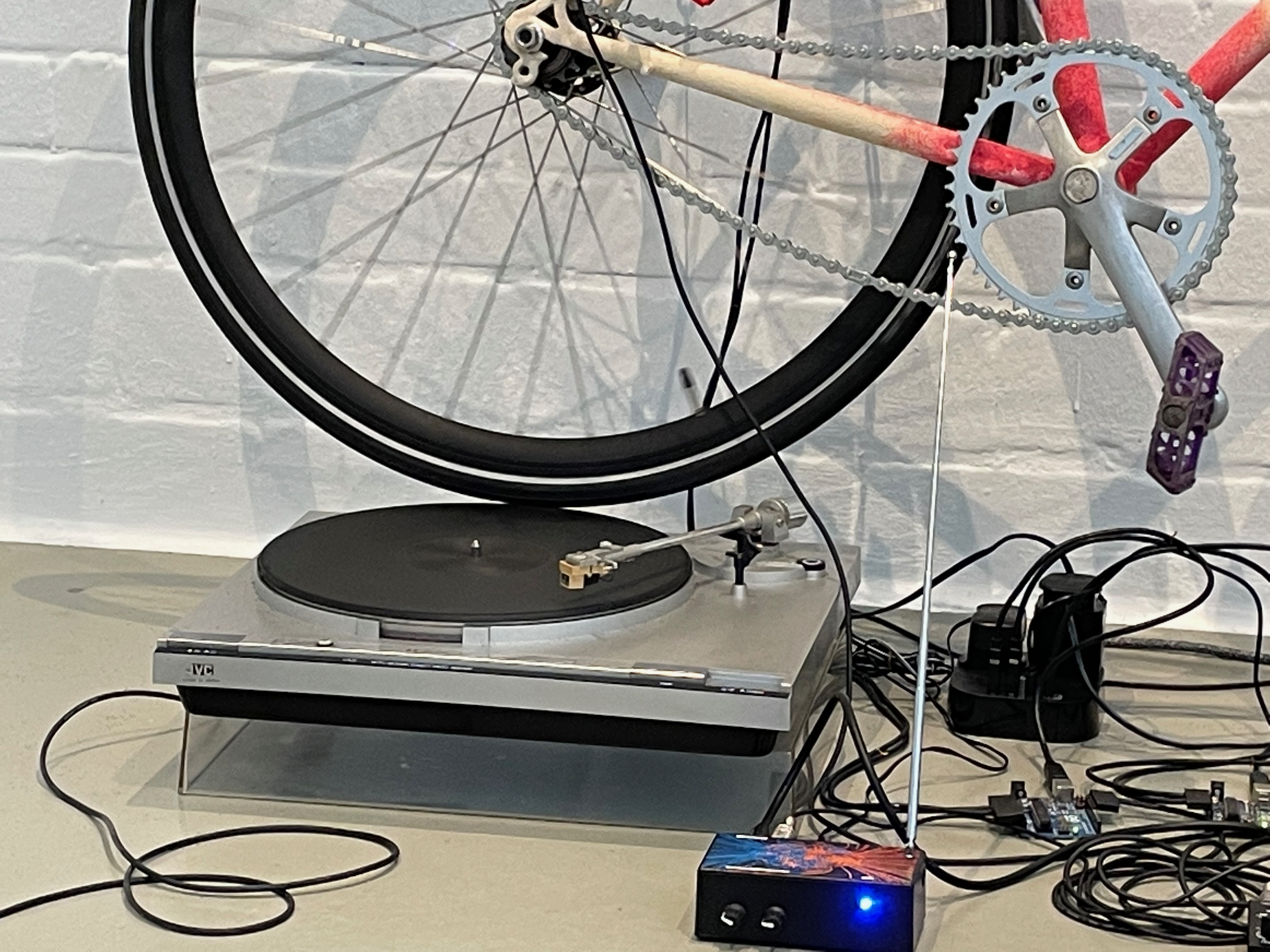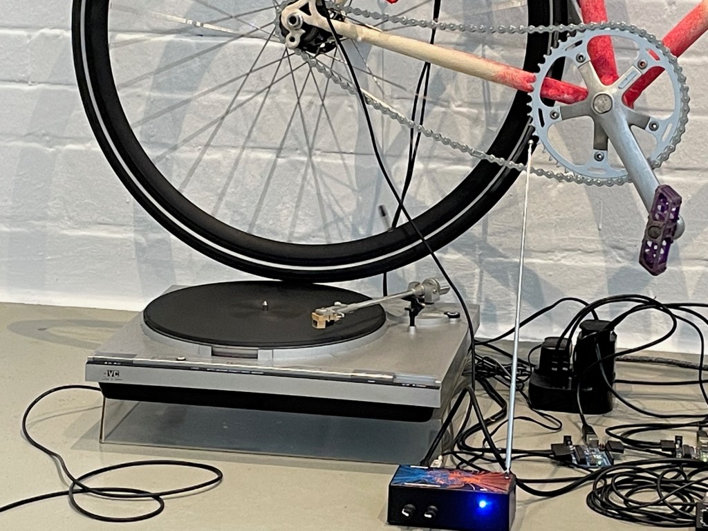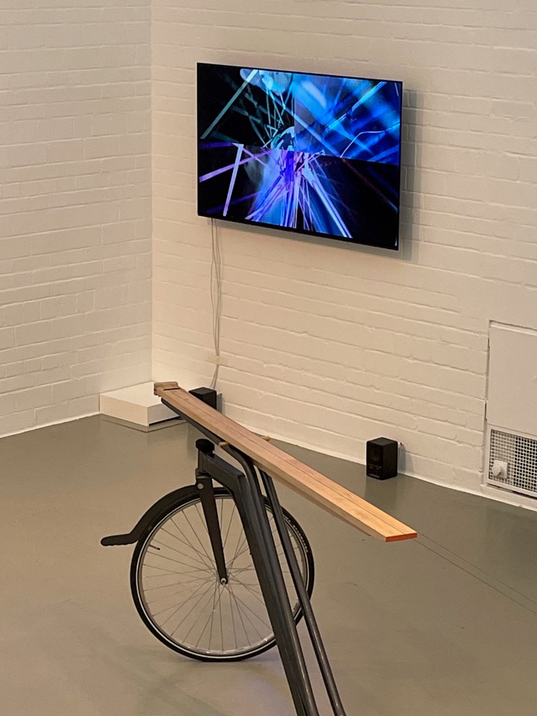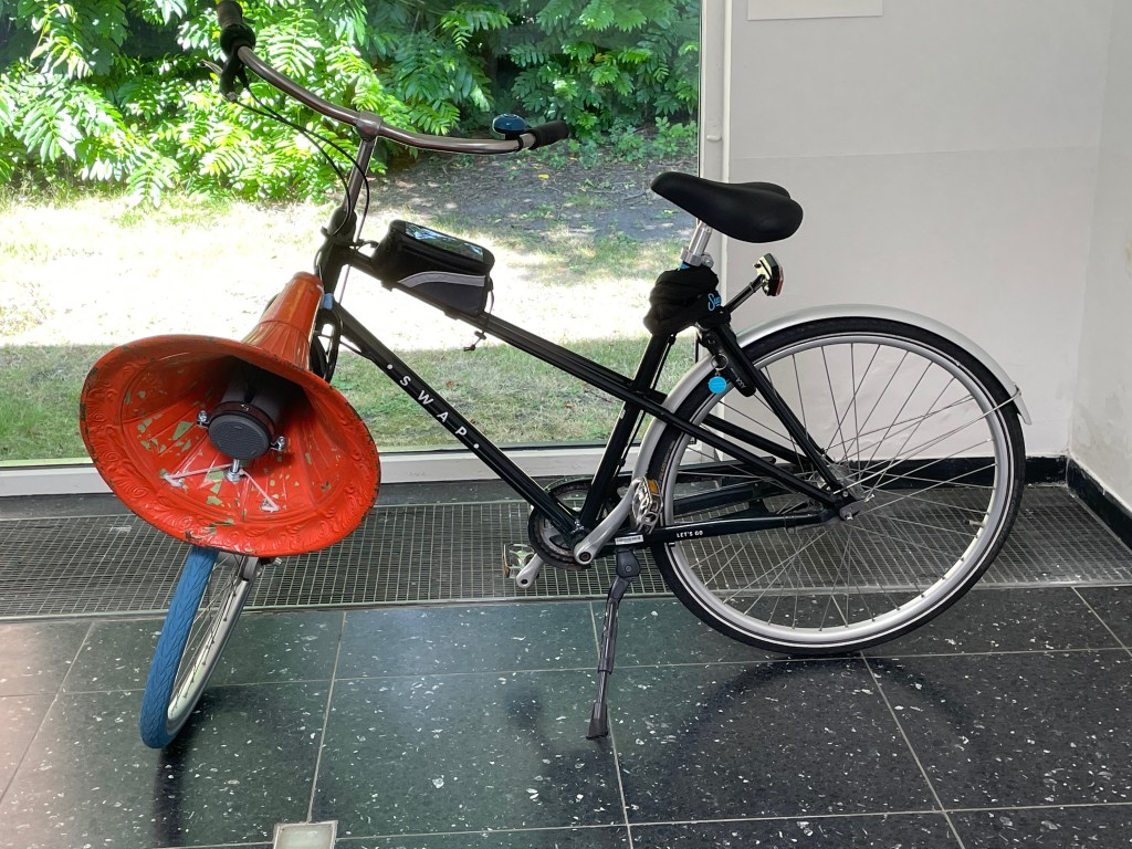 Ein paar Tage später konnten wir die weitere Ausstellung Cyclophelia, das Fahrrad in Kunst und Musik in der Kunsthalle Wilhelmshaven besuchen. Hier lag der Schwerpunkt auf der Kombination des Fahrrades mit der Musik, d.h. wie Künstler dieses Fortbewegungsmittel oder Teile dessen benutzen, um daraus Klanginstrumente zu machen. Auch diese Ausstellung entstand in Kooperation mit der städtischen Galerie Delmenhorst, die wie schon erwähnt, den Startpunkt dieser Ausstellungsreihe setzte. Insbesondere kinetische und zu Musikinstrumenten umgebaut Fahrräder, Skulpturen und Videoarbeiten, bildeten hier die Ausstellungsstücke.