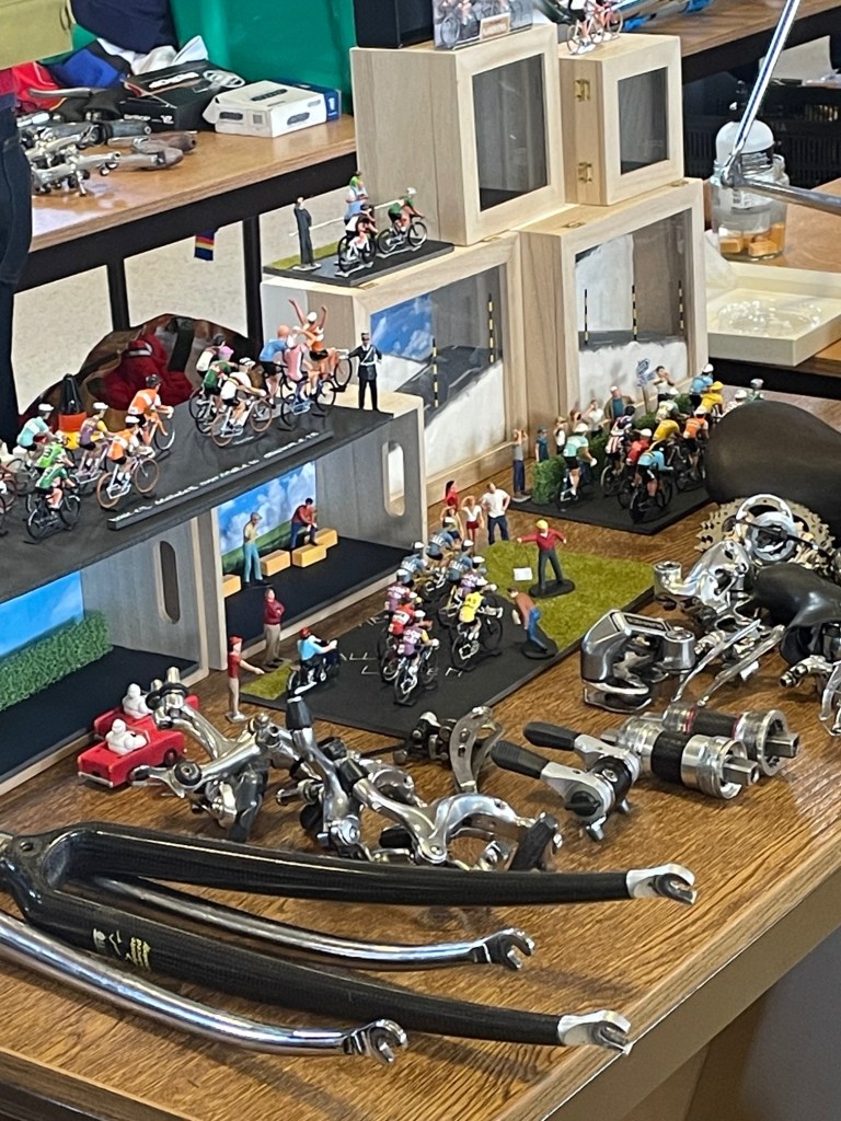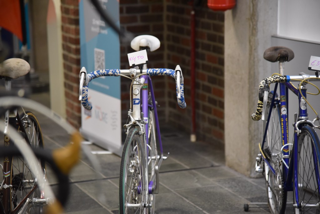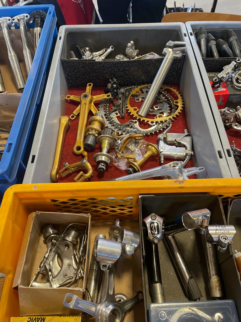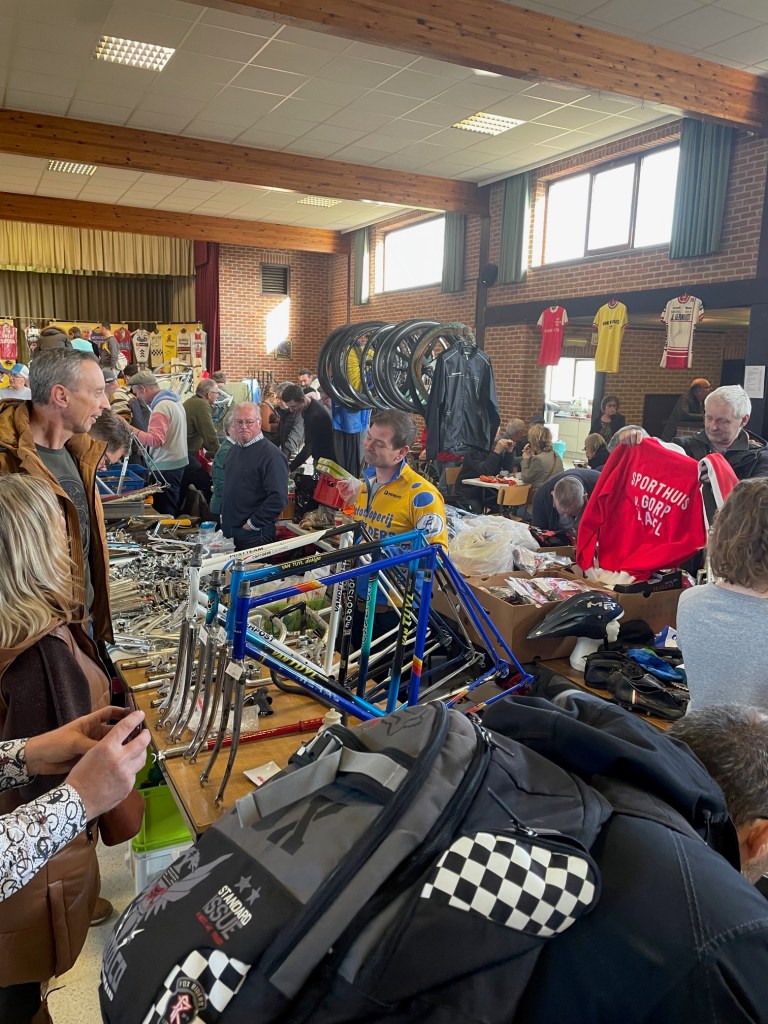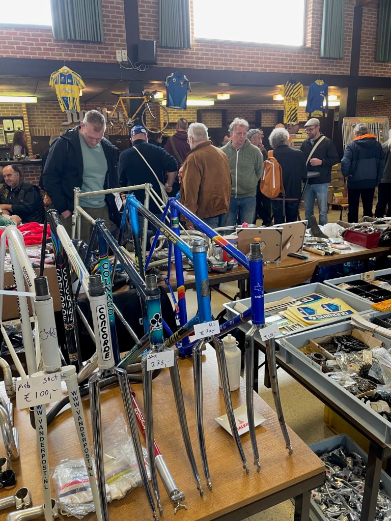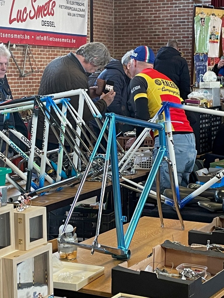 Werner wie immer unterwegs nach speziellen kleinen Teilchen, die mir beim durchstreifen der Gänge überhaupt nicht auffallen, Thomas öffnete den Blick auf das ein oder andere komplette Rad und ich versuchte, meine Einkaufsliste abzuarbeiten. Auf den Börsen ist es doch immer wieder so, wie bei IKEA. Das, was man sich vornimmt, ist nicht da und trotzdem hat man zum Schluss den Einkaufskorb voll. So arbeitete ich mich wieder nach dem gleichen immer wiederkehrenden Schema vor. Erst ein grober Überblick durch alle Stände, hier und da das ein oder andere im Blick behalten, hinterher dann doch wieder fluchen, weil man es nicht wieder findet und dann einige Teile erstehen, bei denen man sich dann hinterher fragt, ob sie nun an die Rahmen passen die man noch zu Hause hängen hat oder ob sie einen Weiteren benötigen, damit Komponenten und Rahmen die beste Harmonie ergeben. Ein komplettes Rad nach meinem Beuteschema (Britisch und aus Reynolds 531) war nicht in Sicht. So ein Schnäppchen wie in GeeL konnte ich in Dessel nicht finden. Allerdings hatte sich mein Rucksack zufrieden gefühlt und der Tag hat sich für mich gelohnt. Gab es vor Corona noch direkt neben der Halle, in der Börse stattfindet, die angeblich beste Pommesbude in der Region, so mussten wir diesmal mit Tomatensuppe vorlieb nehmen, da die angeblich beste Pommesbude der Region die Corona Zeit wohl nicht überstanden hatte. Das nächste Mal werden wir uns vorher informieren, wo wir den Börsenbesuch mit hervorragenden, belgischen Pommes krönen können.