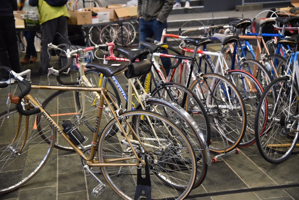 Ich brauche jedes Mal einige Runden, um den Blick auf etwas spannendes lenken zu können. Im ersten Rundgang komme ich zu der (voreiligen) Überzeugung, dass für mich nichts dabei ist. Aber mit jeder Runde entdeckt man doch das ein oder andere Teil, was zu den noch anstehenden Projekte passt. So in der zweiten oder dritten Runde fiel mir bei einem Händler ein Raleigh auf, das einen sehr guten Eindruck machte. Mit 120 € fiel es auch sehr günstig aus. Ich war mir nicht sicher, ob die Farbe original war. Es war ein Apricot-Metallic. Deshalb zögerte ich, mich näher mit dem Rad zu befassen. Zwischenzeitlich fand ich zwei recht günstige Felgen, die als Ersatz für eine zerstörte Weinmann Felge dienen sollten, da ich das Original in den zahlreichen Internetforen bisher nicht gefunden hatte. Auch das ein oder andere Bremsen-Set und Lenkerbänder hatten inzwischen den Weg in meinem Rucksack gefunden. Werner war auch mit seinen Beobachtungen sehr weit fortgeschritten und nun ging es darum, mich noch einmal mit dem Raleigh zu beschäftigen.