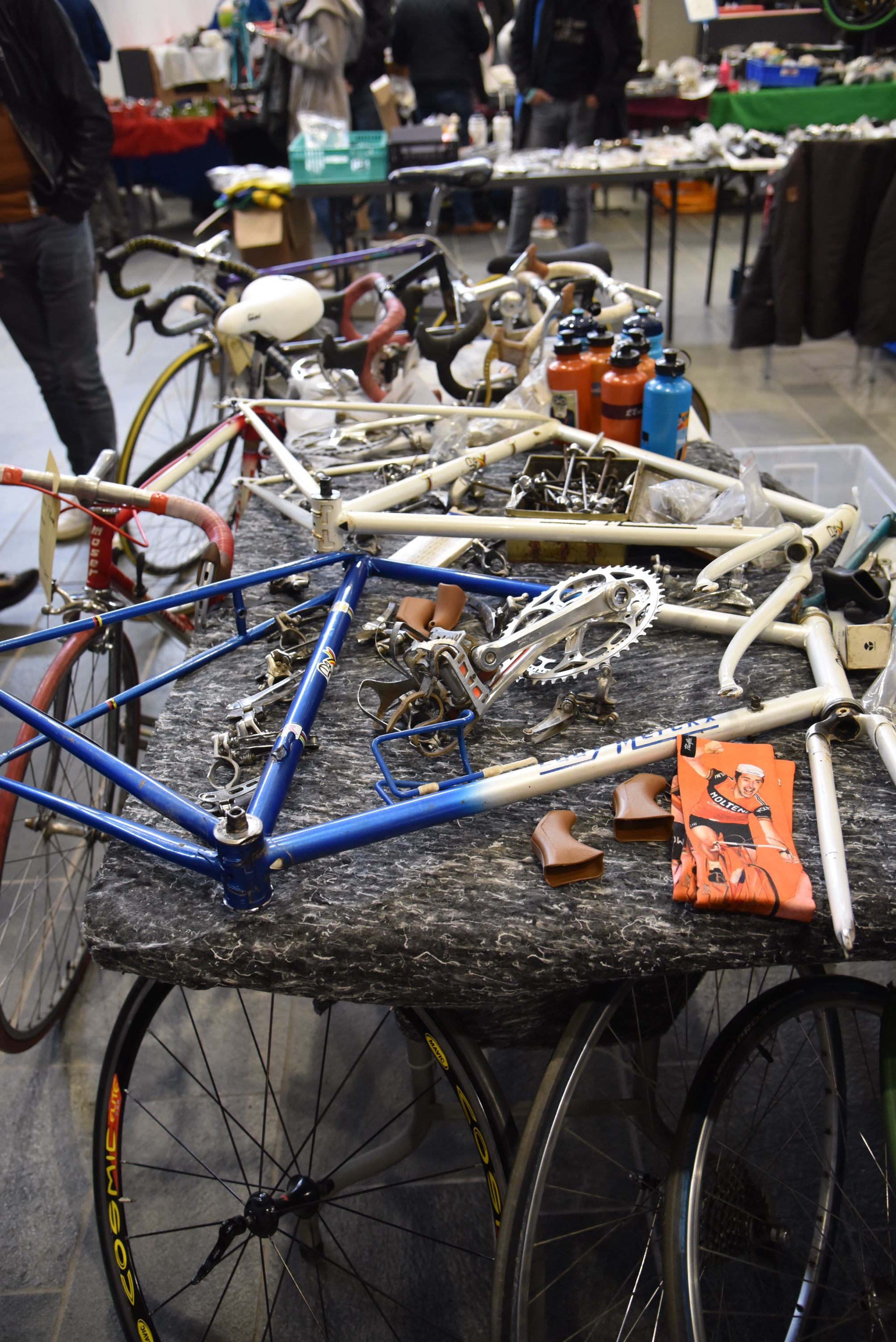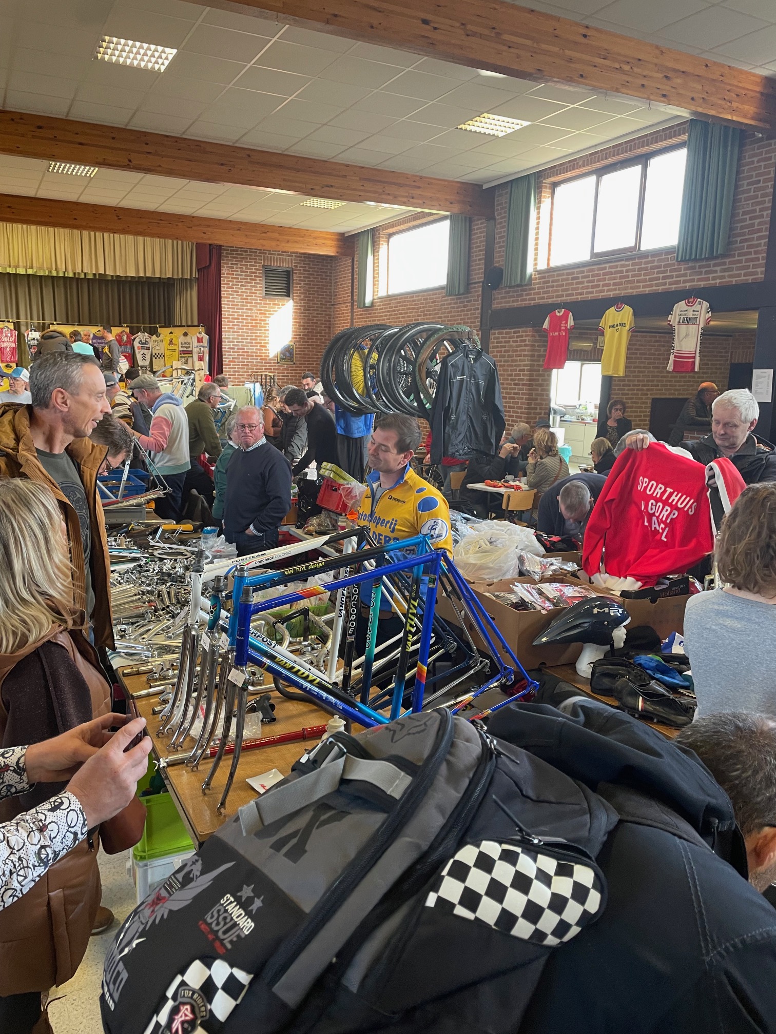 Werner wie immer unterwegs nach speziellen kleinen Teilchen, die mir beim durchstreifen der Gänge überhaupt nicht auffallen, Thomas öffnete den Blick auf das ein oder andere komplette Rad und ich versuchte, meine Einkaufsliste abzuarbeiten. Auf den Börsen ist es doch immer wieder so, wie bei IKEA. Das, was man sich vornimmt, ist nicht da und trotzdem hat man zum Schluss den Einkaufskorb voll. So arbeitete ich mich wieder nach dem gleichen immer wiederkehrenden Schema vor. Erst ein grober Überblick durch alle Stände, hier und da das ein oder andere im Blick behalten, hinterher dann doch wieder fluchen, weil man es nicht wieder findet und dann einige Teile erstehen, bei denen man sich dann hinterher fragt, ob sie nun an die Rahmen passen die man noch zu Hause hängen hat oder ob sie einen Weiteren benötigen, damit Komponenten und Rahmen die beste Harmonie ergeben. Ein komplettes Rad nach meinem Beuteschema (Britisch und aus Reynolds 531) war nicht in Sicht. So ein Schnäppchen wie in GeeL konnte ich in Dessel nicht finden. Allerdings hatte sich mein Rucksack zufrieden gefühlt und der Tag hat sich für mich gelohnt. Gab es vor Corona noch direkt neben der Halle, in der Börse stattfindet, die angeblich beste Pommesbude in der Region, so mussten wir diesmal mit Tomatensuppe vorlieb nehmen, da die angeblich beste Pommesbude der Region die Corona Zeit wohl nicht überstanden hatte. Das nächste Mal werden wir uns vorher informieren, wo wir den Börsenbesuch mit hervorragenden, belgischen Pommes krönen können.
