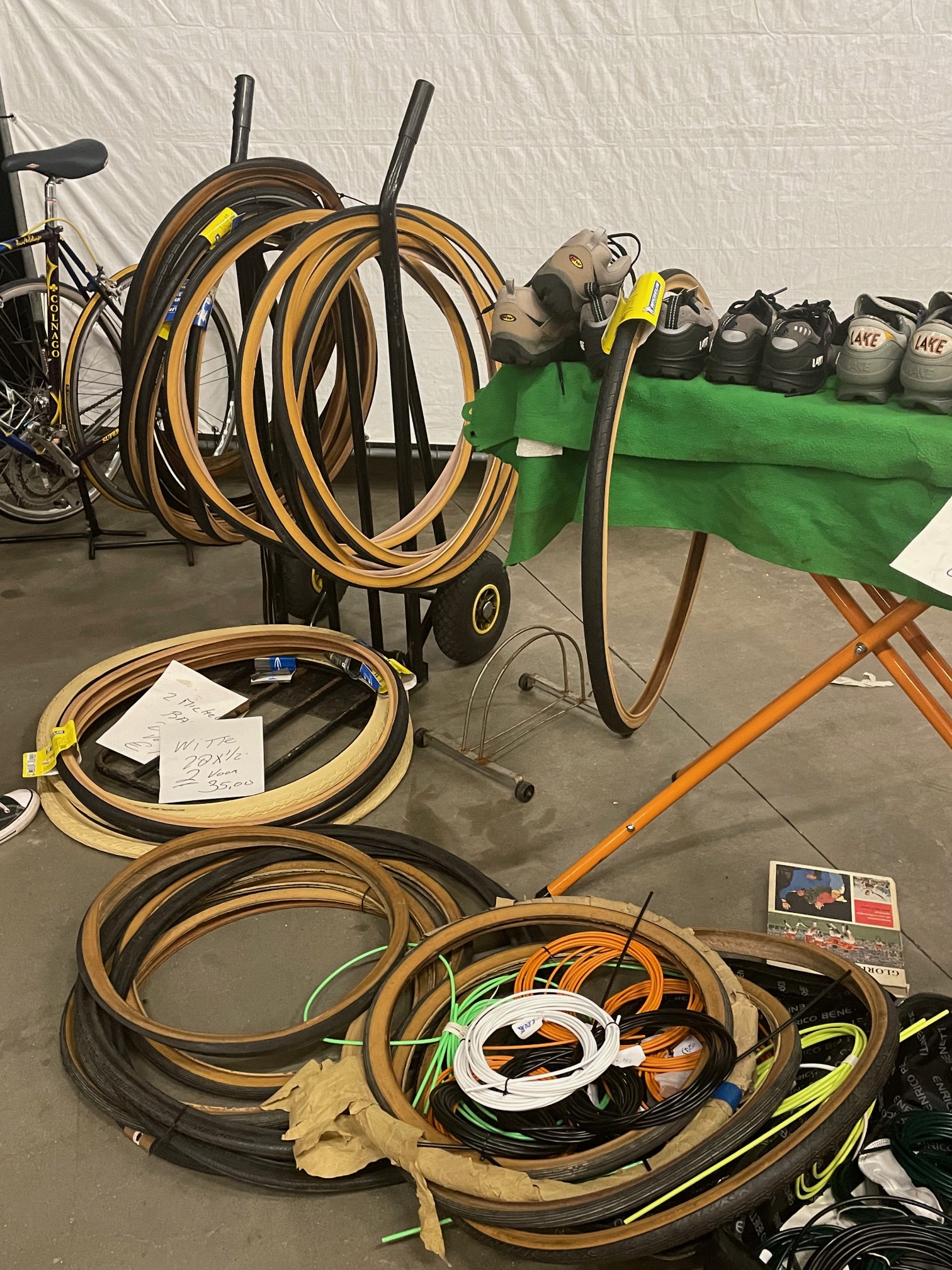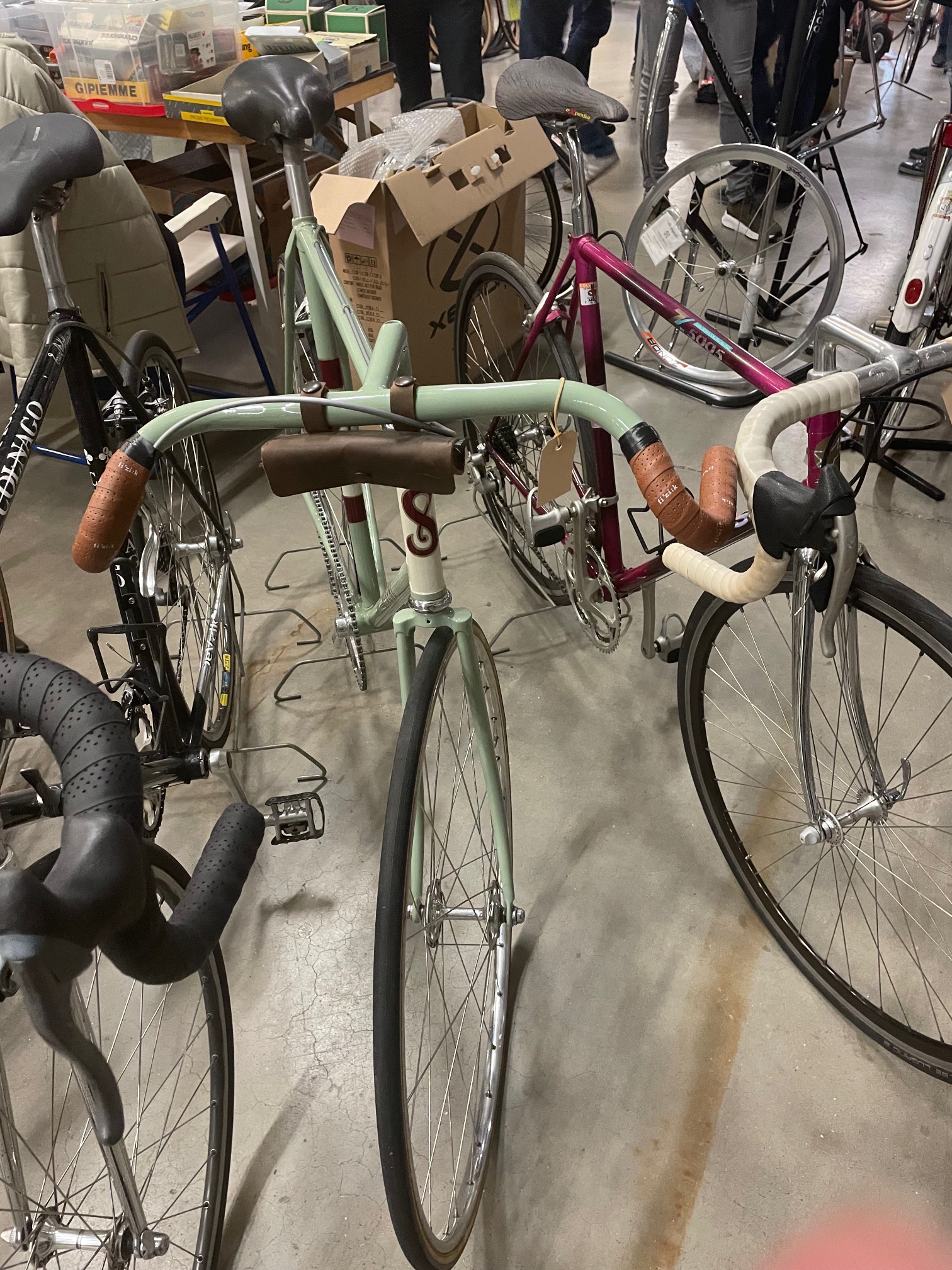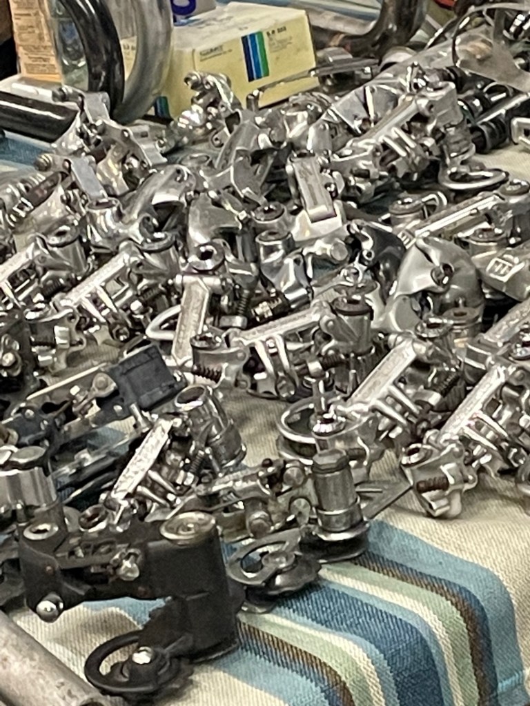 Die ersten Rundgänge durch die Gassen der Verkaufsstände zeigte eine bunte Mischung bekannten Gesichtern und für uns neuer Händler mit spannenden Angeboten. Ich hatte mir fest vorgenommen, keine kompletten Räder und keine Rahmen mit nach Hause zu bringen. Erst einmal müssen in die vorhandenen Rahmen aufgebaut werden und dafür benötigte ich noch einiges an Bauteilen. Insbesondere hatte ich mir vorgenommen mein TI Raleigh Replica mit Campagnolo Nuovo Record aufzubauen. Das Angebot an diesen Teilen war gut, die Preisspannen allerdings auch deutlich.