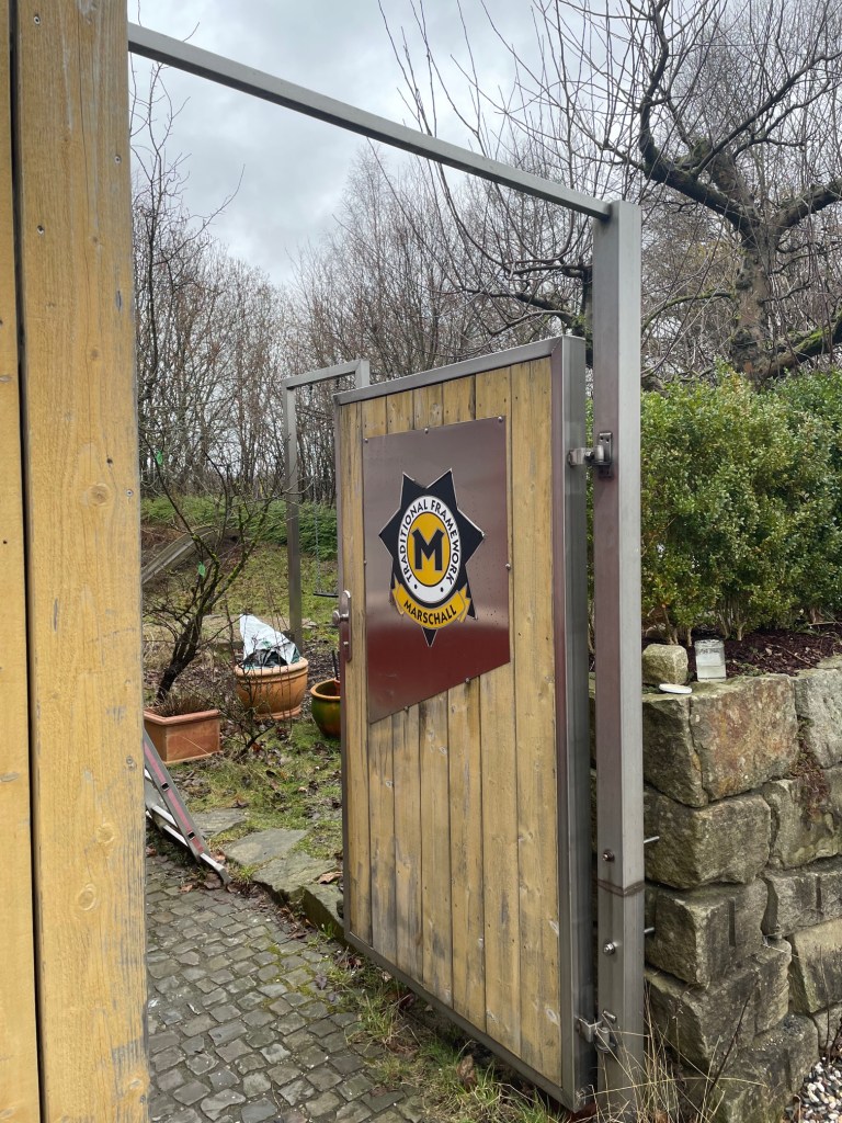 Das Navi führte uns in ein Gewerbegebiet und zu einem Gelände, das sich deutlich von den anderen Standard-Gewerbebauten abhob. Grundstückseinfriedung und Gebäude in kompletter Holzbauweise, intensive Durchgrünung des Grundstücks und die Gebäudeanordnung, die eher an eine Ranch erinnerten, setzten den Betrieb von den anderen Unternehmen ab. Der Volvo vor dem Grundstück und der Marschall-Stern am Tor zeigten mir jedoch, dass wir richtig waren und ich konnte in die heiligen Hallen oder besser in die Lackierstube von Uwe Marschall eintreten. Auf knappem Raum hingen zahlreiche Rahmen, teilweise Aufträge, teilweise die eigenen Rahmen des Meisters.