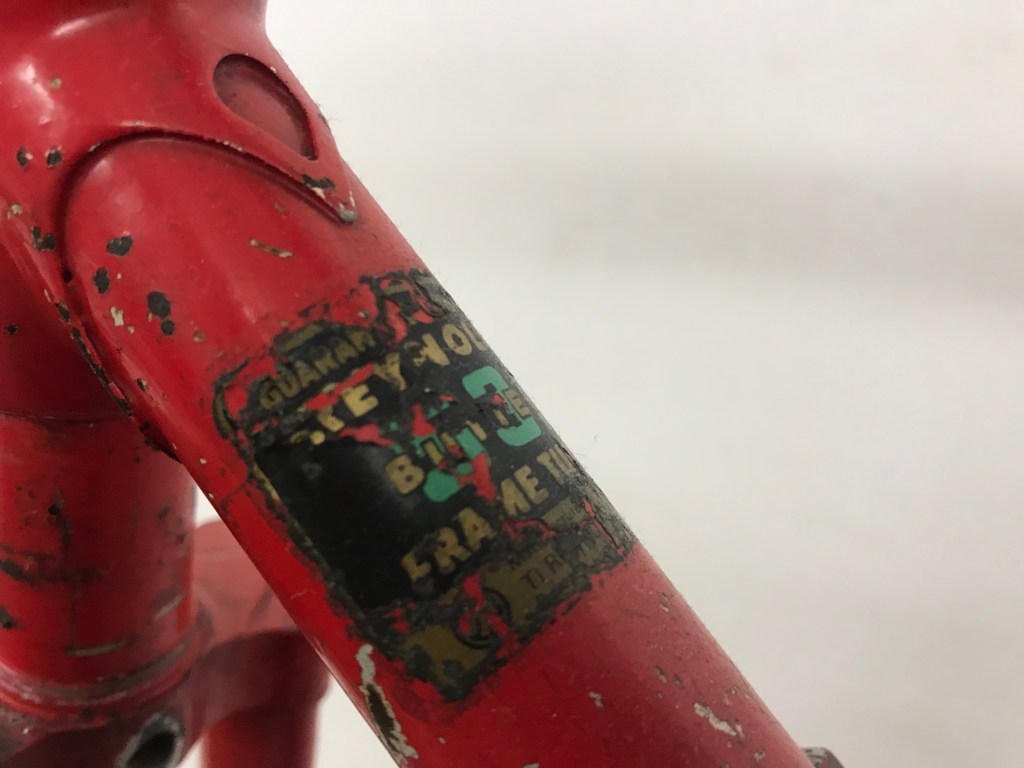 Der zweite Rahmen war ein Evans aus Mitte bis Ende 60er Jahre in einem dunklen Rot. Er wies deutlich weniger Kratzer auf, hatte dafür aber an einigen Stellen größere Lackschäden die auch erste Rostansätze aufwiesen. Entrosten und nachlackierten schien mir nicht der richtige Weg. Auch die Decals waren nicht mehr in gutem Zustand, so dass auch hier meine Entscheidung Neulackierung hieß.