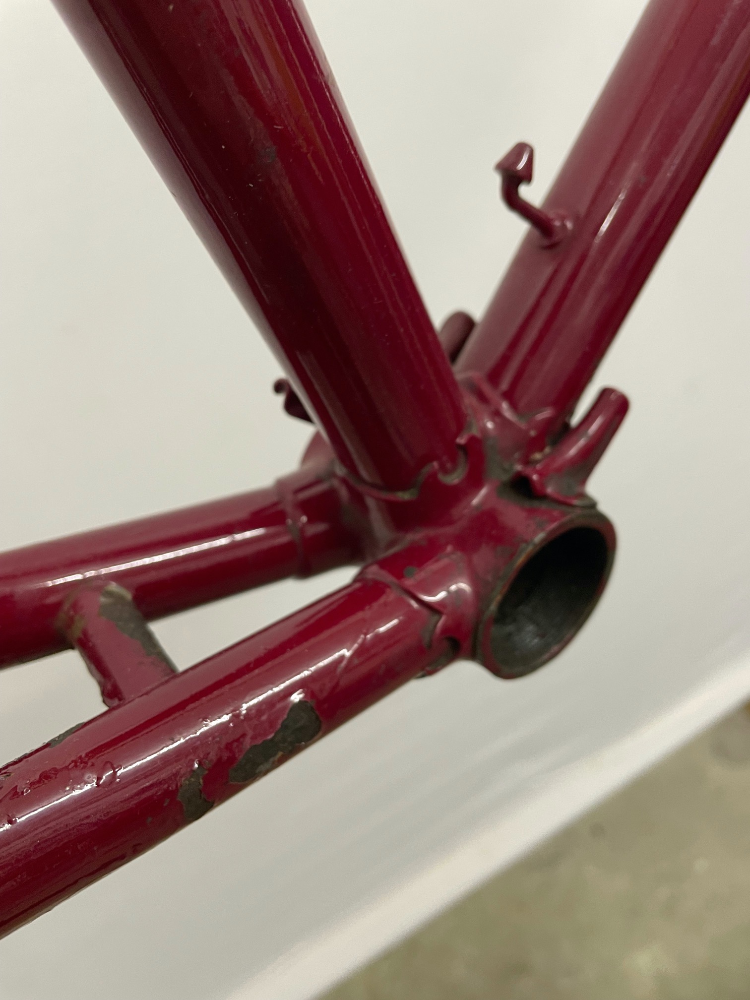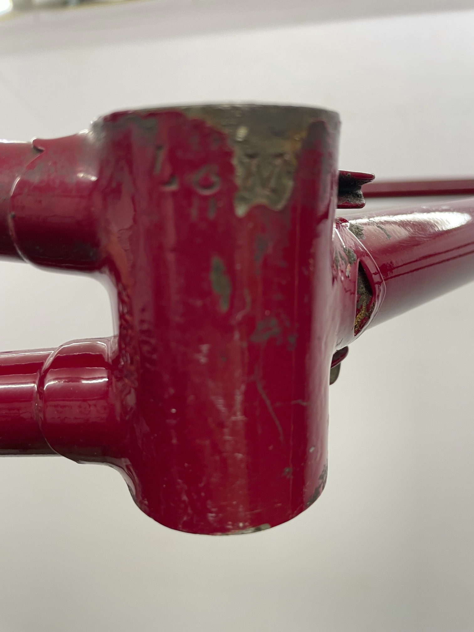 Der zweite Rahmen war ein Evans aus Mitte bis Ende 60er Jahre in einem dunklen Rot. Er wies deutlich weniger Kratzer auf, hatte dafür aber an einigen Stellen größere Lackschäden die auch erste Rostansätze aufwiesen. Entrosten und nachlackierten schien mir nicht der richtige Weg. Auch die Decals waren nicht mehr in gutem Zustand, so dass auch hier meine Entscheidung Neulackierung hieß.
