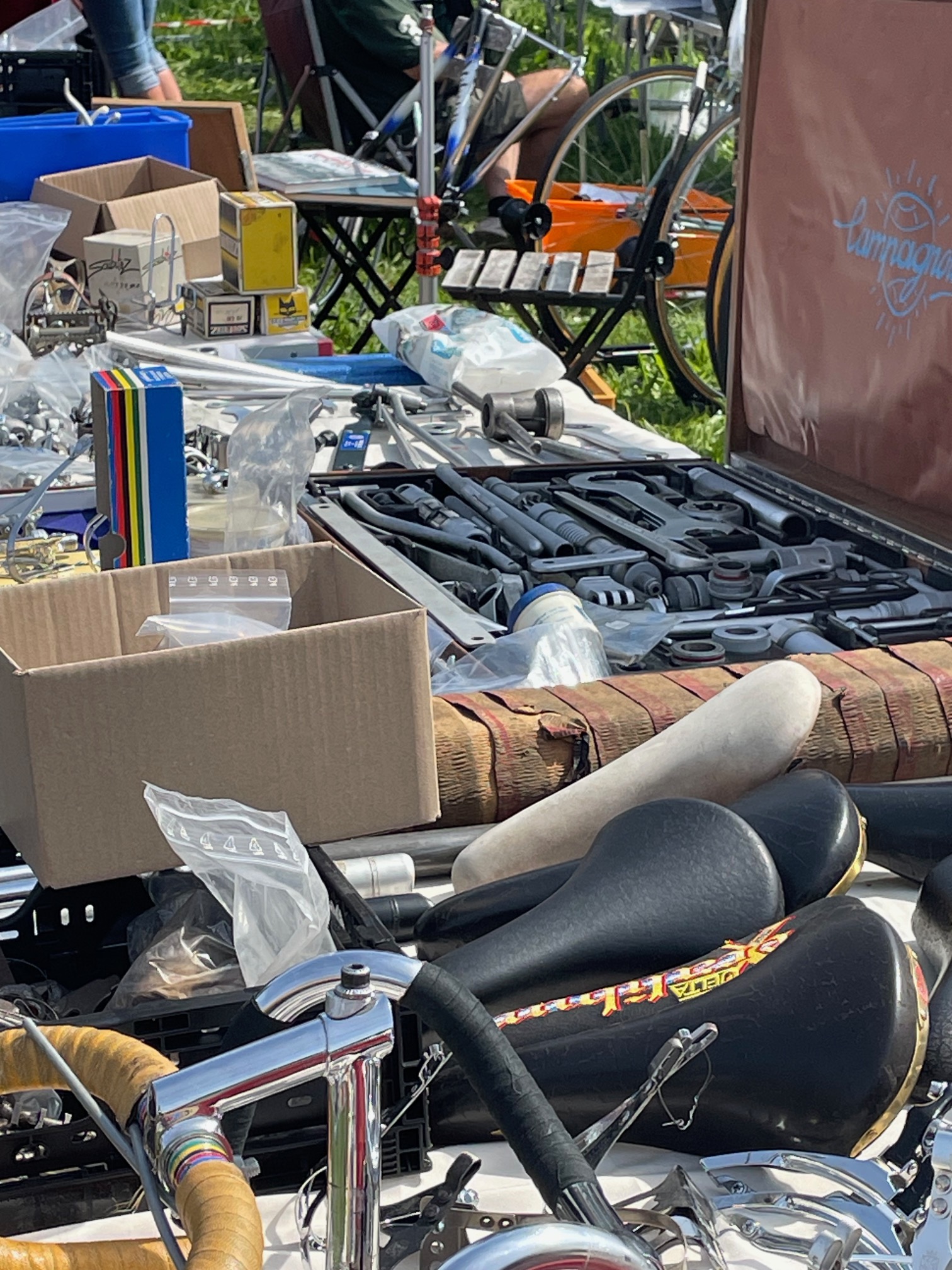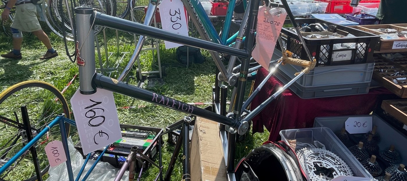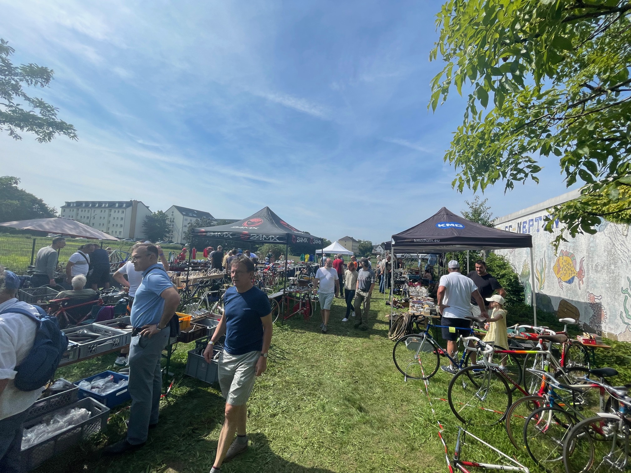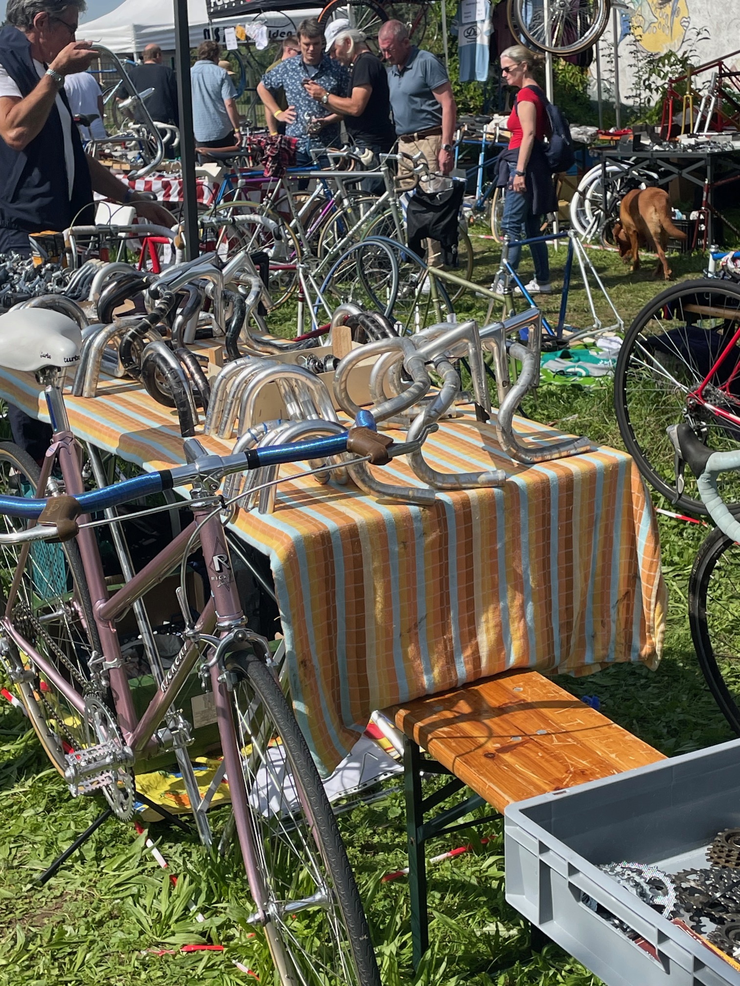 Genauso wichtig wie die Vervollständigung des Teilevorrats sind aber auch die vielen netten Gespräche mit anderen Verrückten der Stahlradszene. Da wird schonmal ein Bier ausgegeben, weil wir so bemitleidenswert aussehen ob unserer vollen Rücksäcke oder im Gespräch bekommt man doch noch den Hinweis auf genau das Bauteil, das man sich erhofft hat zu finden. Köln hat sich gelohnt und wird sicher zu einem festen Termin in meinem Kalender. Vielleicht in 2024 mit Ausfahrt.