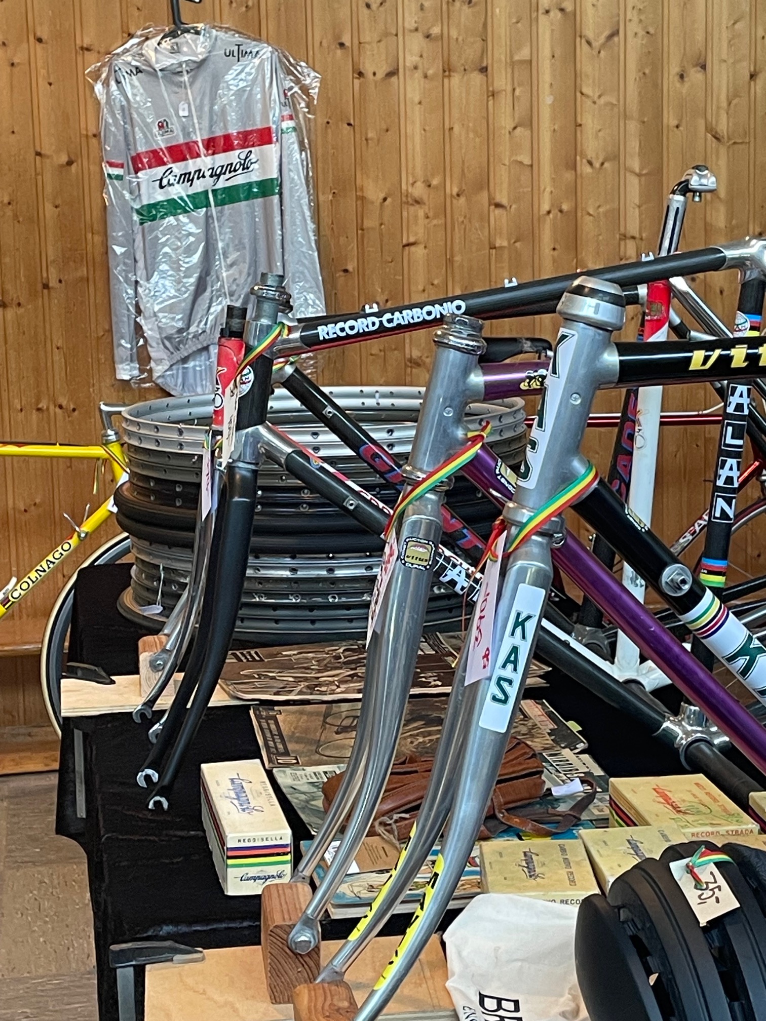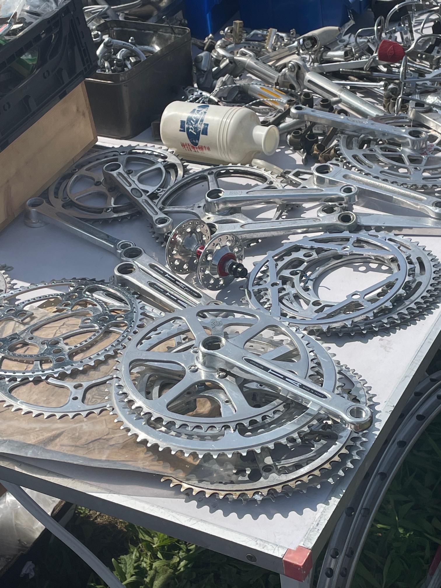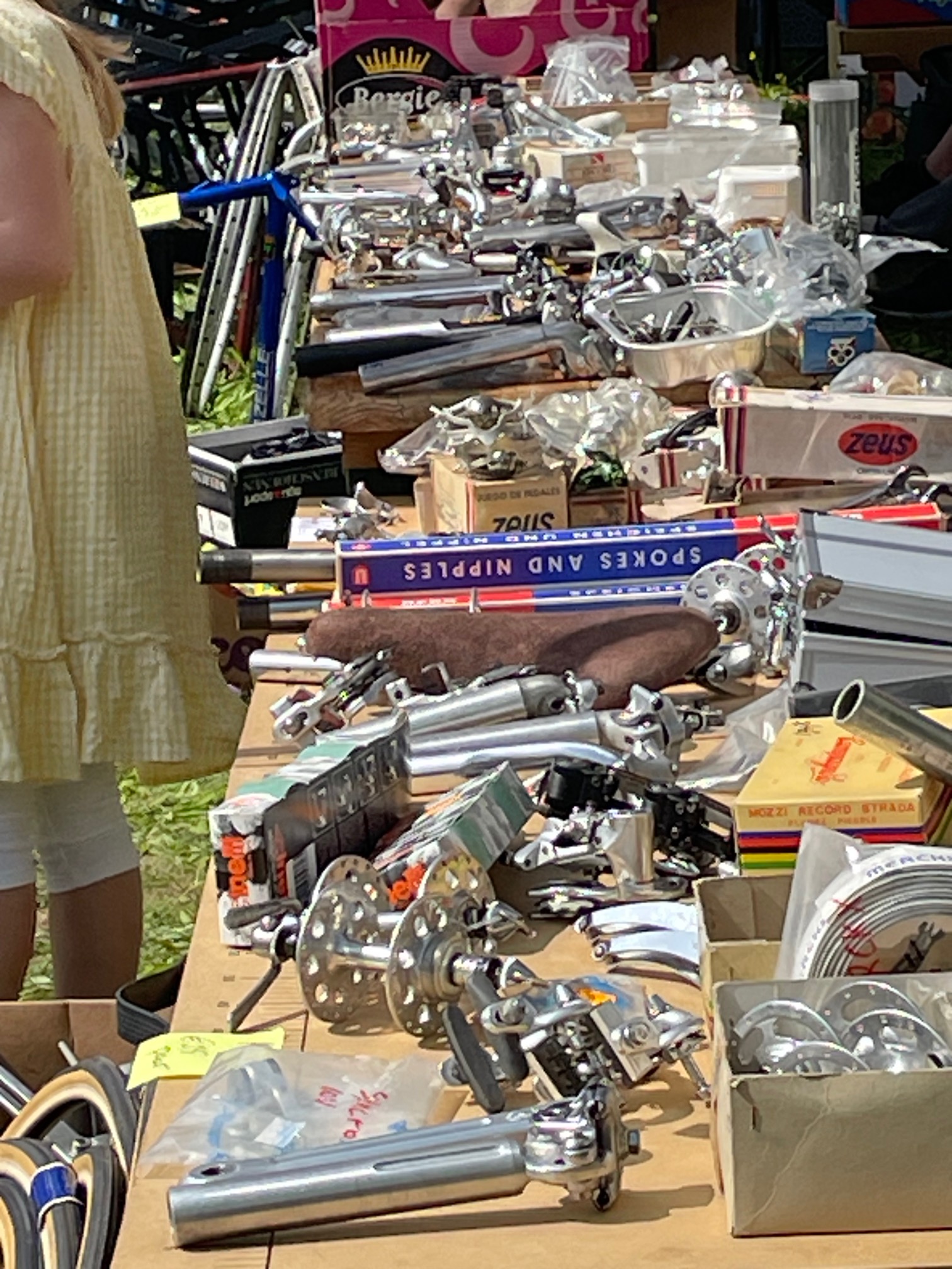 Genauso wichtig wie die Vervollständigung des Teilevorrats sind aber auch die vielen netten Gespräche mit anderen Verrückten der Stahlradszene. Da wird schonmal ein Bier ausgegeben, weil wir so bemitleidenswert aussehen ob unserer vollen Rücksäcke oder im Gespräch bekommt man doch noch den Hinweis auf genau das Bauteil, das man sich erhofft hat zu finden. Köln hat sich gelohnt und wird sicher zu einem festen Termin in meinem Kalender. Vielleicht in 2024 mit Ausfahrt.
