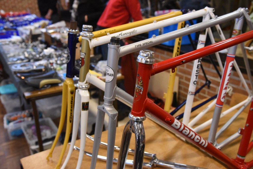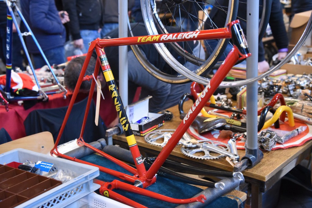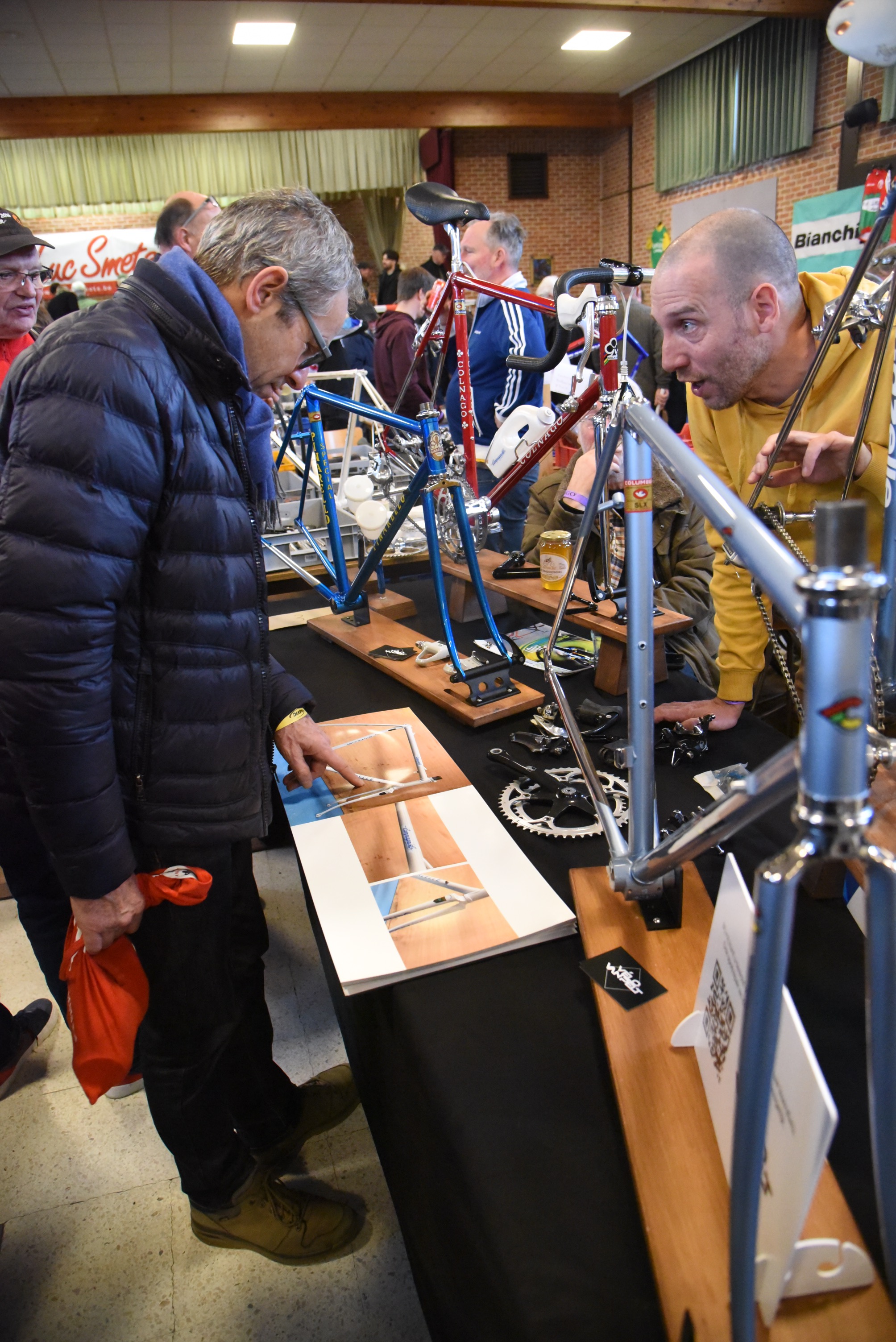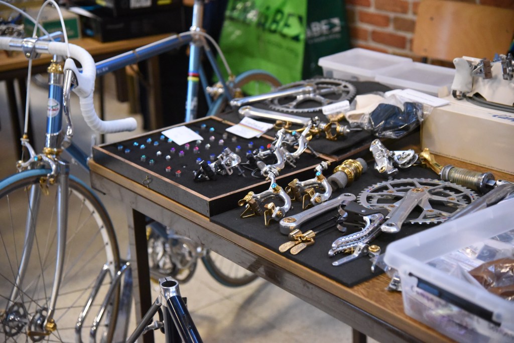 Viele Händler haben ihren Stammplatz, so auch die französischsprachigen Händler im Raum neben der Theke. Unter ihnen findet man auch immer Ian Da Costa mit seiner großen Auswahl an Decals. Am Nebenstand fand ich dann auch den ersten Artikel der nicht auf meine Einkaufsliste stand, zwei Modolo Bremsgriffe in nahezu neuwertigen Zustand. Zwar war der Preis nicht gerade niedrig, unverschämt hoch im Vergleich zu den Internet-Buchten allerdings auch nicht. Mit diesem Kauf war jedoch auch die Entscheidung gefällt, dass der goldene Raleigh SBDU TT Rahmen mit Modolo Bremsausstattung aufgebaut wird. Somit steht auf der Einkaufsliste für die nächsten Börsen ein Satz Modolo-Bremsen. In den Rucksack wanderten dann noch Staubkappen mit Campagnolo Logo.