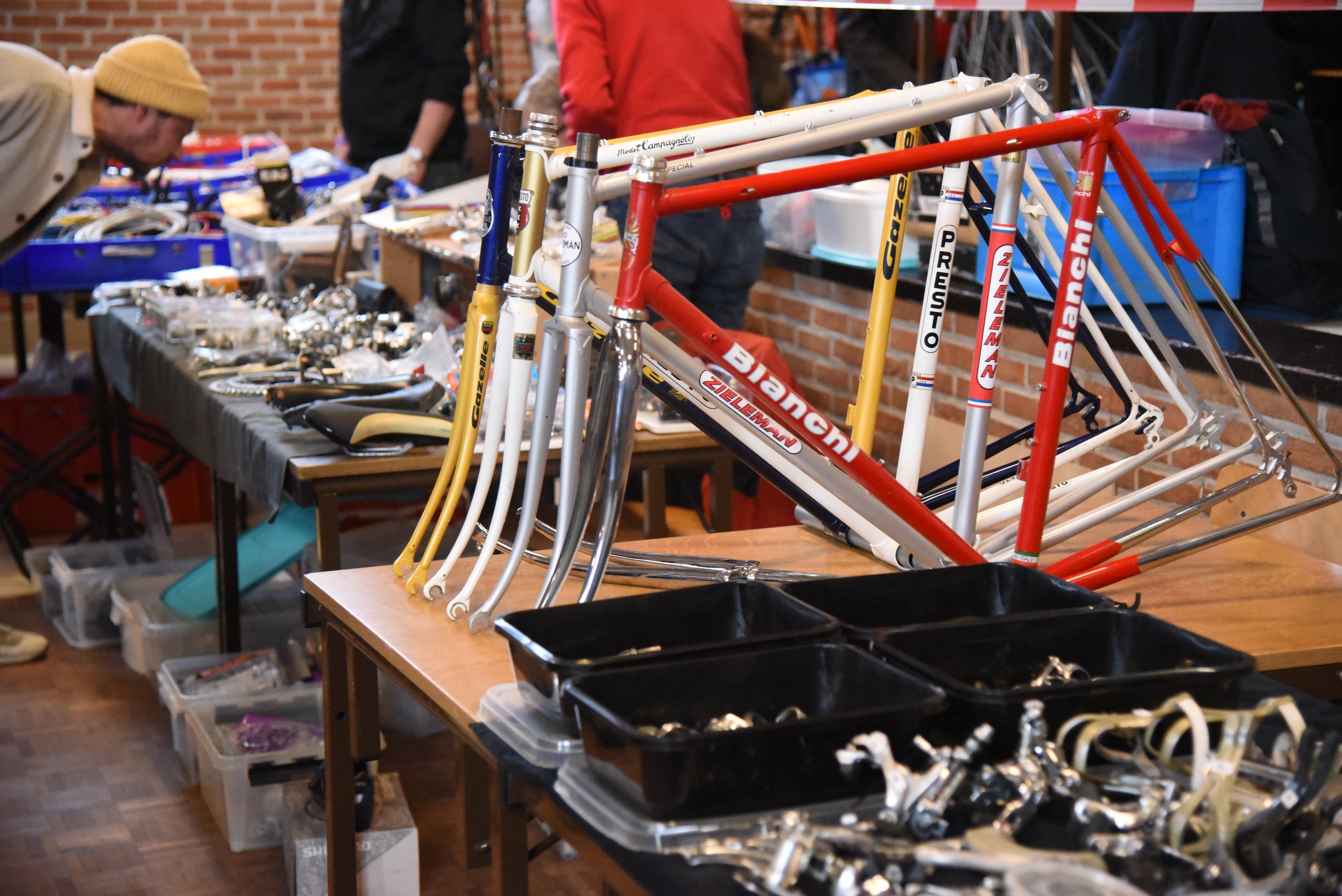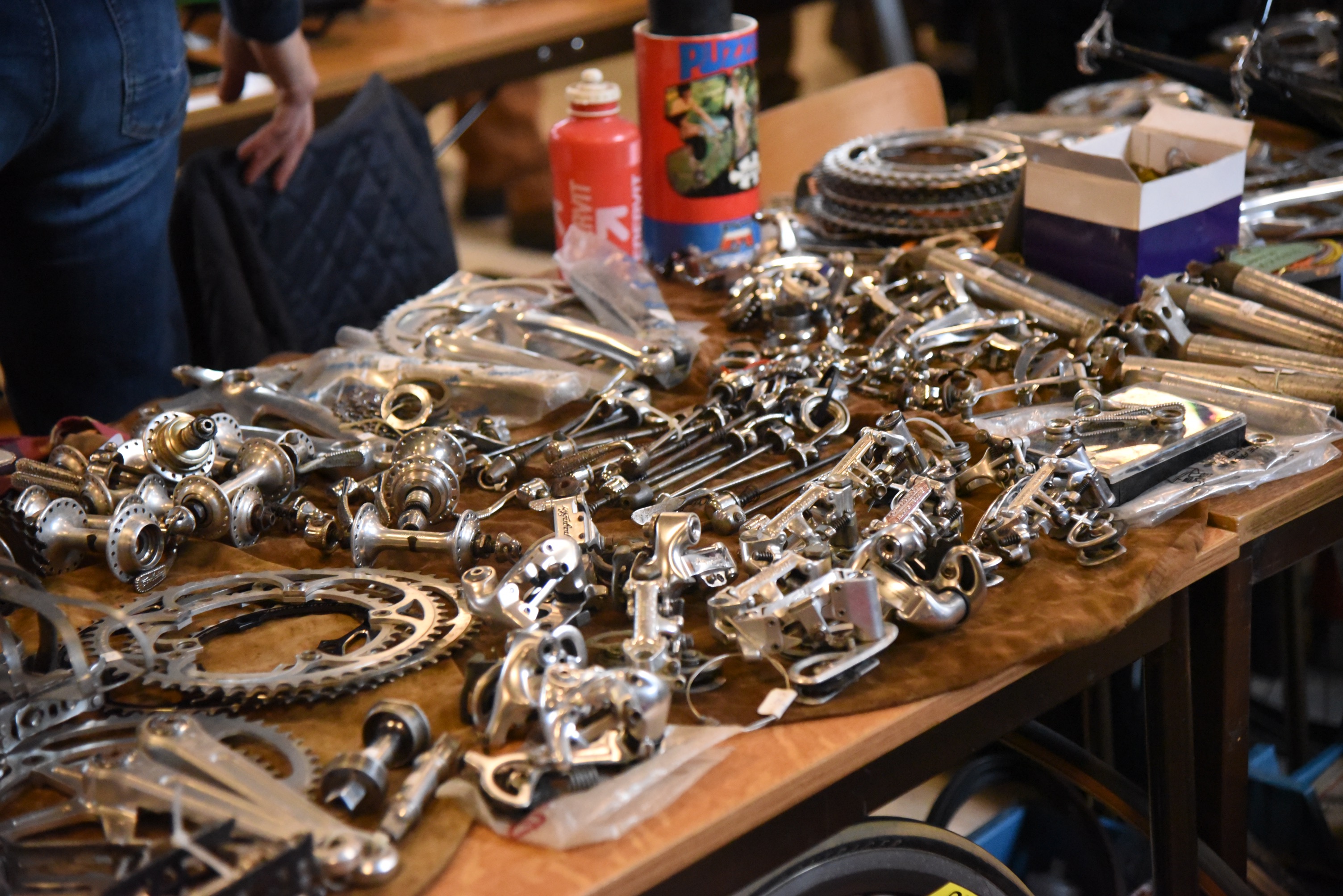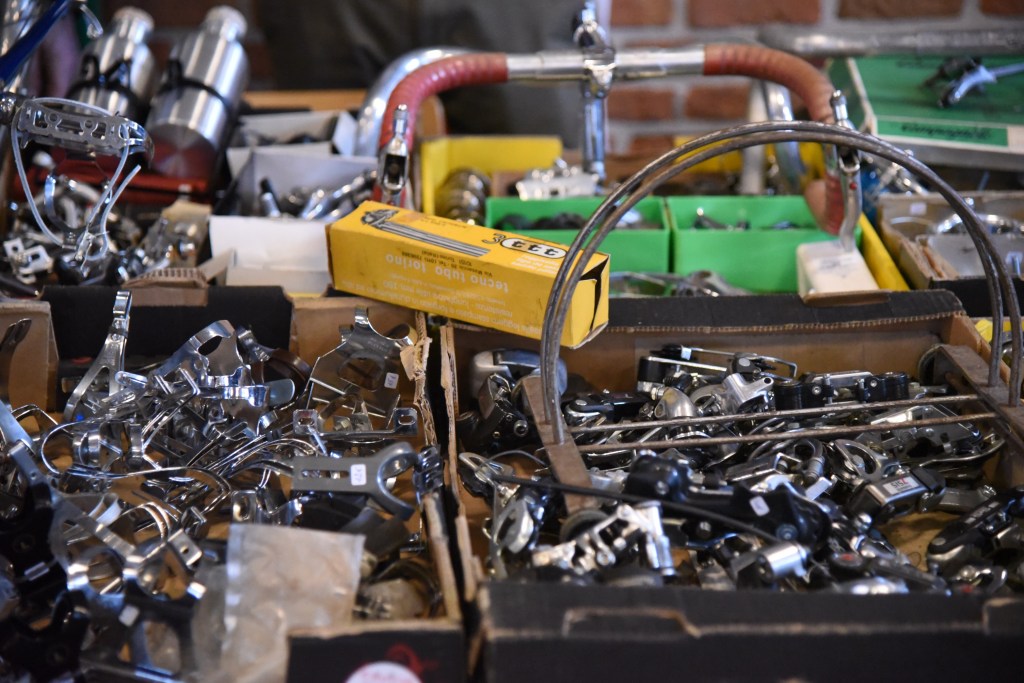 Was mich immer wieder verwundert ist, dass die Teile aus den siebziger und achtziger Jahren noch schier endlos dargeboten werden. Schaltungen, Vorbauten und Sattelstützen liegen wohl geordnet nebeneinander oder unsortiert auf Haufen oder in Kisten.