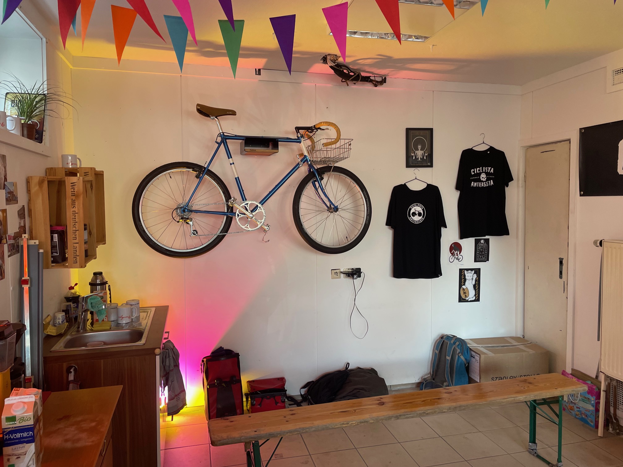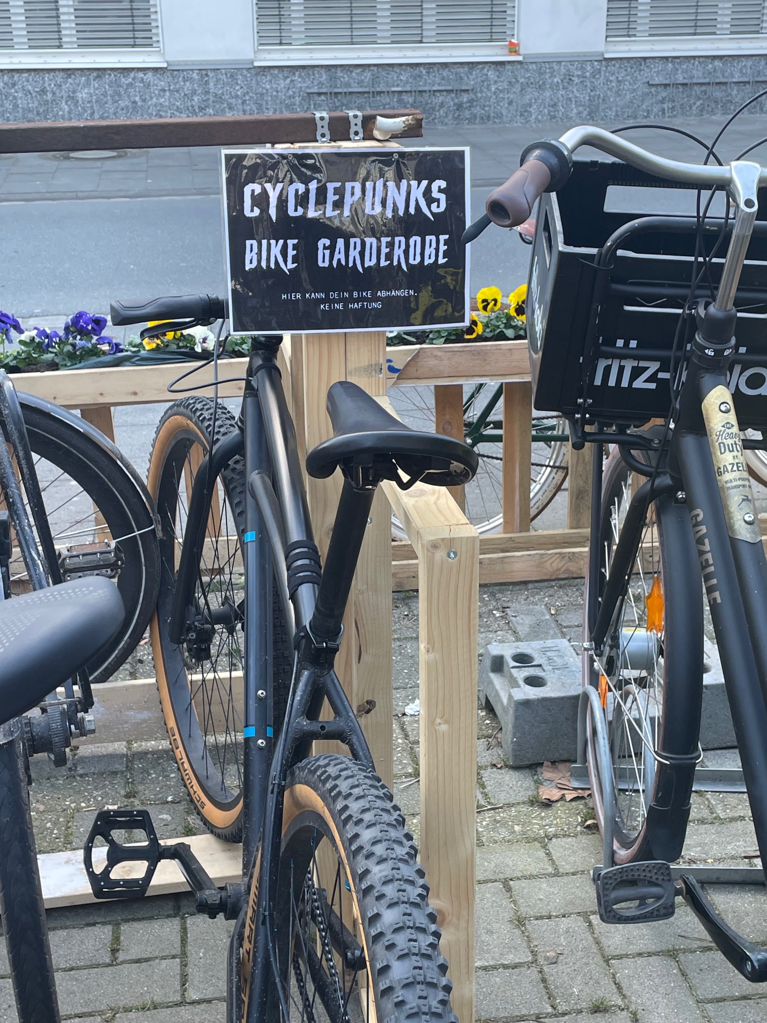 Zwischendurch gab es genügend Gelegenheit, über Räder und Aufbauten zu fachsimpeln. Besonders gefreut hat mich, dass ich endlich einmal Gelegenheit hatte, mich mit Frank Glanert über dessen Ambitionen auszutauschen,. Wichtig war ihm immer sowohl schon in Varel wie auch nun in Oldenburg einen konsumfreien Bereich zu bieten, um mit den Menschen zum Thema Fahrrad und Radverkehr ins Gespräch zu kommen. Die Konzerte, Lesungen, die offene Fahrradwerkstatt oder hier das Altbaukriterium bieten hervorragende Gelegenheiten dafür. Immer wieder kommen Menschen vorbei, um einfach mal hinein zu schauen nur zu zu hören oder in die Diskussion einzusteigen. Da das Frankys für viele auf dem Weg zum Bahnhof liegt, bitte Des. an vor ragende Ort, um immer wieder neue Menschen kennen zu lernen. Das Frankys ist nicht nur ein no Profit Ort, sondern kostet Frank Geld. „Andere kaufen sich ein neues Auto. Ich miete eine leer stehende Tankstelle“ sagte Frank zu mir. Vor allem geht es ihm nicht darum allein Veranstalter zu sein, sondern möglichst viele Partner für die Sache zu begeistern, die Programmpunkte übernehmen. So sind die Cyclepunks mit ihrem Showroom ein Partner wie auch Yannik und Jay als Veranstalter des Altbau Kriteriums mit dem Team Almost Dead.