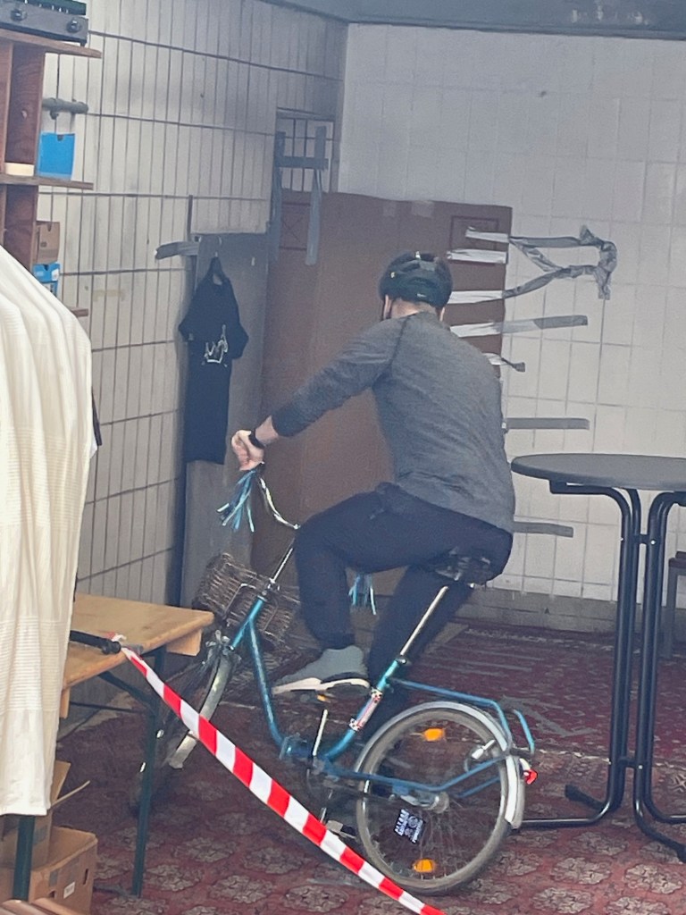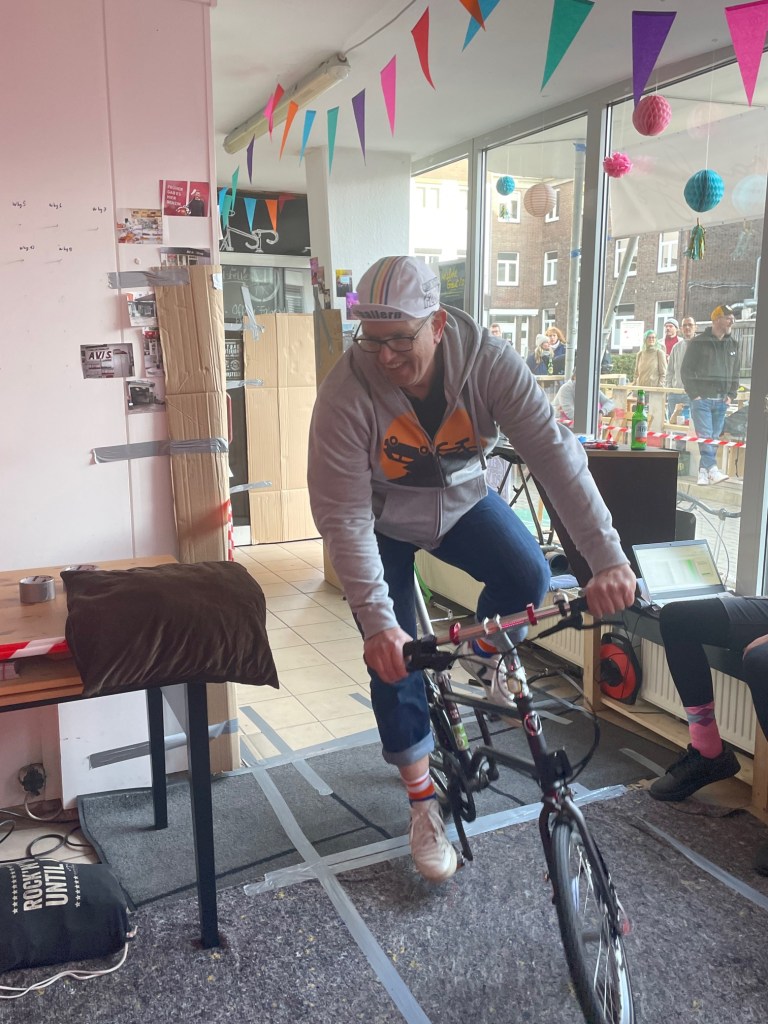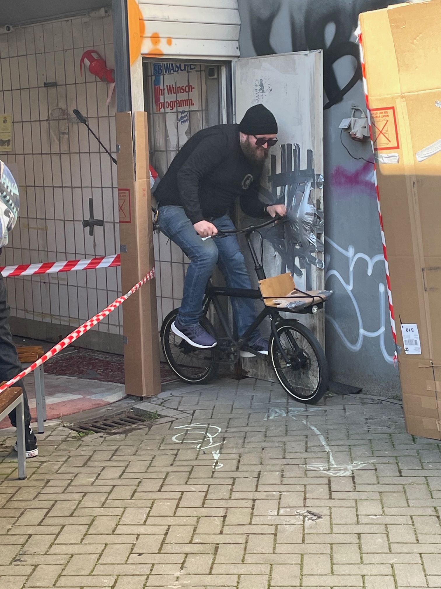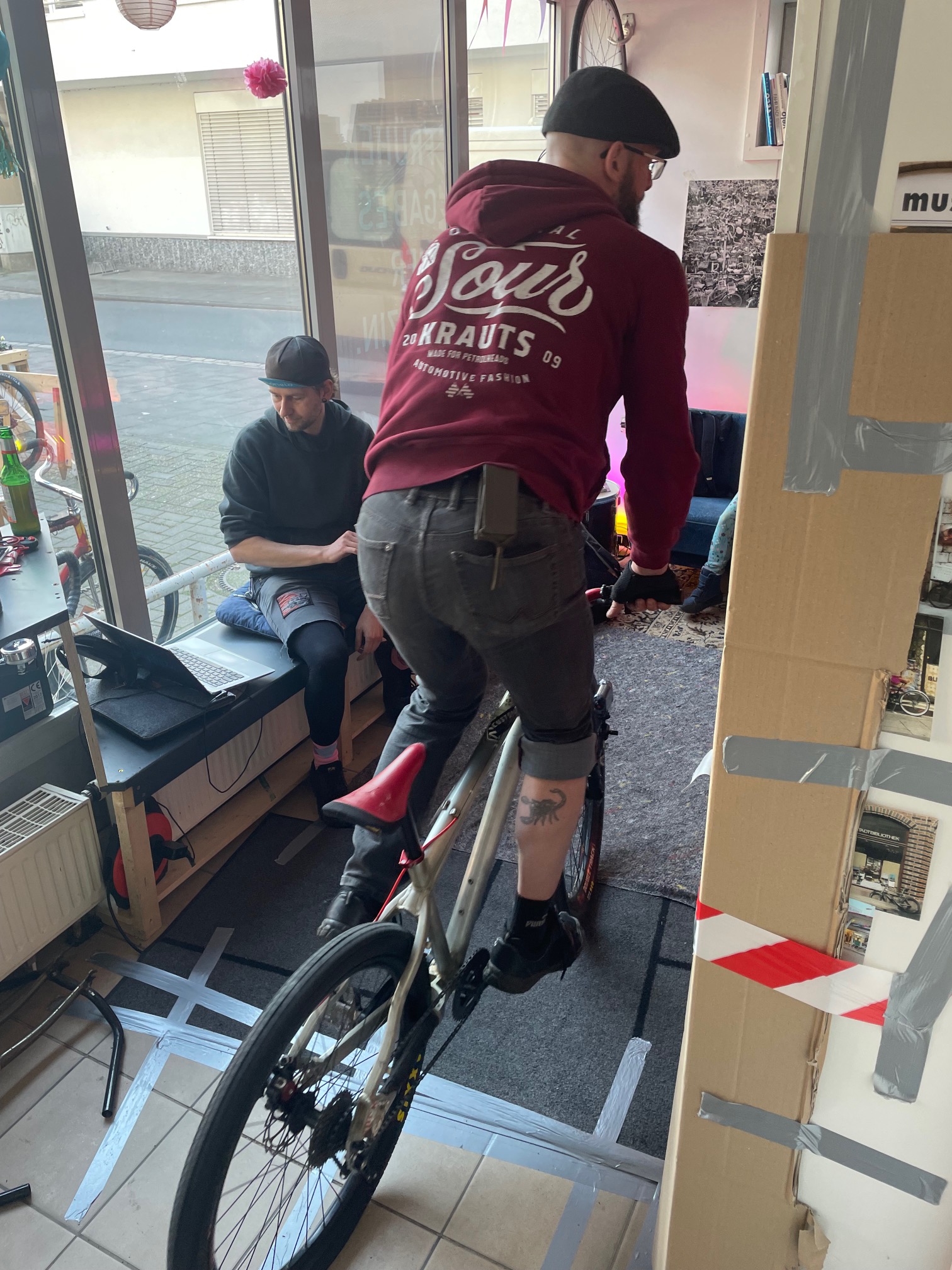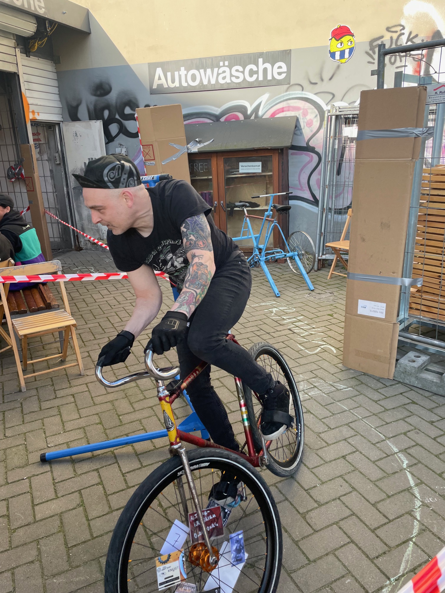 Kurz nach zwei entschieden alle, nun sei genug trainiert und der Ernst des Lebens können beginnen. 25 Fahrer hatten sich gemeldet am Criterium teilzunehmen. Gefahren wurde einzeln zwei Minuten und gezählt wurden, die in dieser Zeit erreichten Runden. Abgezogen wurden. Fehler wie Sperrflächen im Parkour überfahren oder mit dem Fuß abgestürzt. Extreme Fehler wie Beschädigung des Gebäudes oder Ähnliches kam zum Glück nicht vor. Alle Fahrer hatten im ersten Durchgang den Parkour im Uhrzeigersinn zu befahren, um dann in einem zweiten Durchgang das ganze gegen den Uhrzeigersinn noch einmal zu bestehen. Es ging die unterschiedlichsten Radtypen an den Start von Rennrädern über Fixies bis hinzu Falträdern wie Brompton oder Vello. Im ersten Durchgang zeigte ein Fahrer mit seinem Bauer Kunst Fahrrad, die beste Leistung. Es zeigte sich das diese Rahmenform mit einer nahezu eins:eins Übersetzung auf einen so engen Parkour durch Türen, um Tische herum und zwischen Absperrungen hindurch hervorragend geeignet war. Aber auch die anderen Radtypen lagen nicht besonders weit hinter dieser Vorgabe von acht Runden. Es zeigte sich sehr schnell, das es ein enges Rennen werden würde.