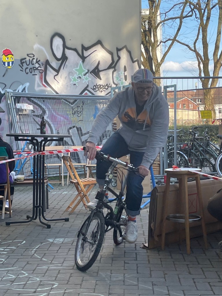 Am Samstag fand etwas ganz anderes statt, nämlich das 7. Oldenburger Altbaukriterium. Zwar war mir ein Altbaukriterium schon bekannt, in denen man mit dem Rad durch Wohnungen, Büroräumen oder andere Gebäude Rennen oder nach Zeit fährt. Da ich aber wie schon gesagt diese kleine Tankstelle kannte, war mir nicht wirklich klar, wie das dort funktionieren sollte. Ab 12.00 fanden die Trainingsrunden statt. Als wir so gegen 13.30 Uhr dort eintreffen war mir klar, dass das Training auch absolut notwendig war. Und um es gleich zu sagen: ich wäre kläglich gescheitert dort eine fehlerfreie Runde mit einem Rennrad oder Brompton hinzubekommen und dann auch noch Rundenzeiten vor zu geben, die konkurrenzfähig wären.