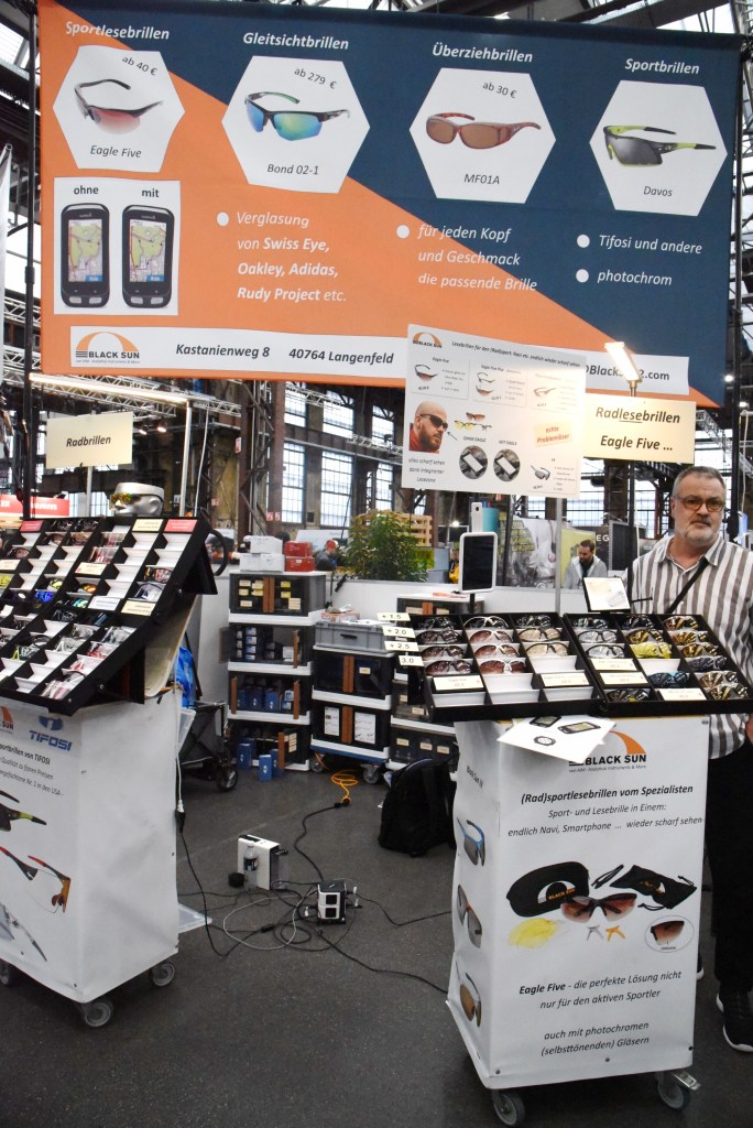 Vorbei an einigen Ständen, denen ich noch gerne einen Besuch abgestattet hätte geht es Richtung Ausgang und doch bleibe ich noch an einem kleinen Eckstand und dem Begriff „Überbrillen“ hängen. Als Brillenträger und noch dazu mit Gleitsichtgläsern, komme ich immer wieder in den Konflikt wie ich in der Abendsonne (die Morgensonne ist mir meist zu früh) vernünftige Sicht behalte. Meine Sonnengläser zum Aufstecken sind mir zu unsicher auf dem Rad und die letzte Sonnenbrille hat schon lange nicht mehr die richtigen Sehstärken. Eine Sonnenbrille, die so geformt ist, dass sie sicher über meiner eigentlichen Brille sitzt scheint mir genau das Richtige. Zwei / drei Modelle ausprobiert und die nächste Ausfahrt ist gesichert.