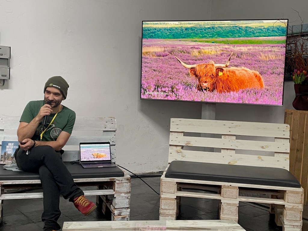 Nachdem ich am Frühstücksbuffet schon meine 1000 Schritte gemacht hatte, war ich pünktlich um kurz vor 10 in den Hallen am Areal Böhler. Ich habe immer etwas Schwierigkeiten mich durch die wartende Menge zu drängen und meinen gelbes Bändchen mit dem daran baumelden Ausweis hoch zu halten, aber sonst wäre ich nicht pünktlich zum ersten Vortrag in der Bloggerlounge gewesen. Und das war auch genau das Problem für Markus Stitz (und auch für mich im zweiten Slot). Markus Vortrag Route YC – ein Paradies für Radfahrer an der Küste von Yorkshire begann um 10.00 und genau auf diese Minute öffnete die Messe für das Publikum. Bis sich ein größerer Teil der Besucher in die Kaltstahlhalle und zur Bloggerlounge vorgearbeitet hatte, waren die ersten Slots vorbei. Aber schließlich war es das Publikum, dass den spannenden Vortrag mit fantastischen Bildern von Markus verpasste. Mich lassen die Fotos bis heute nicht los und ich überlege wann ich die Chance habe, Teile der Strecke abzufahren.