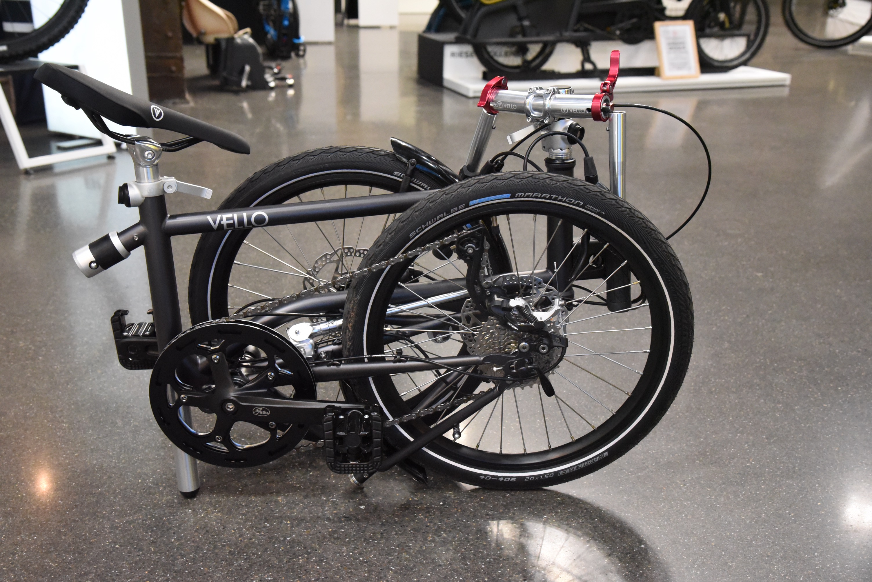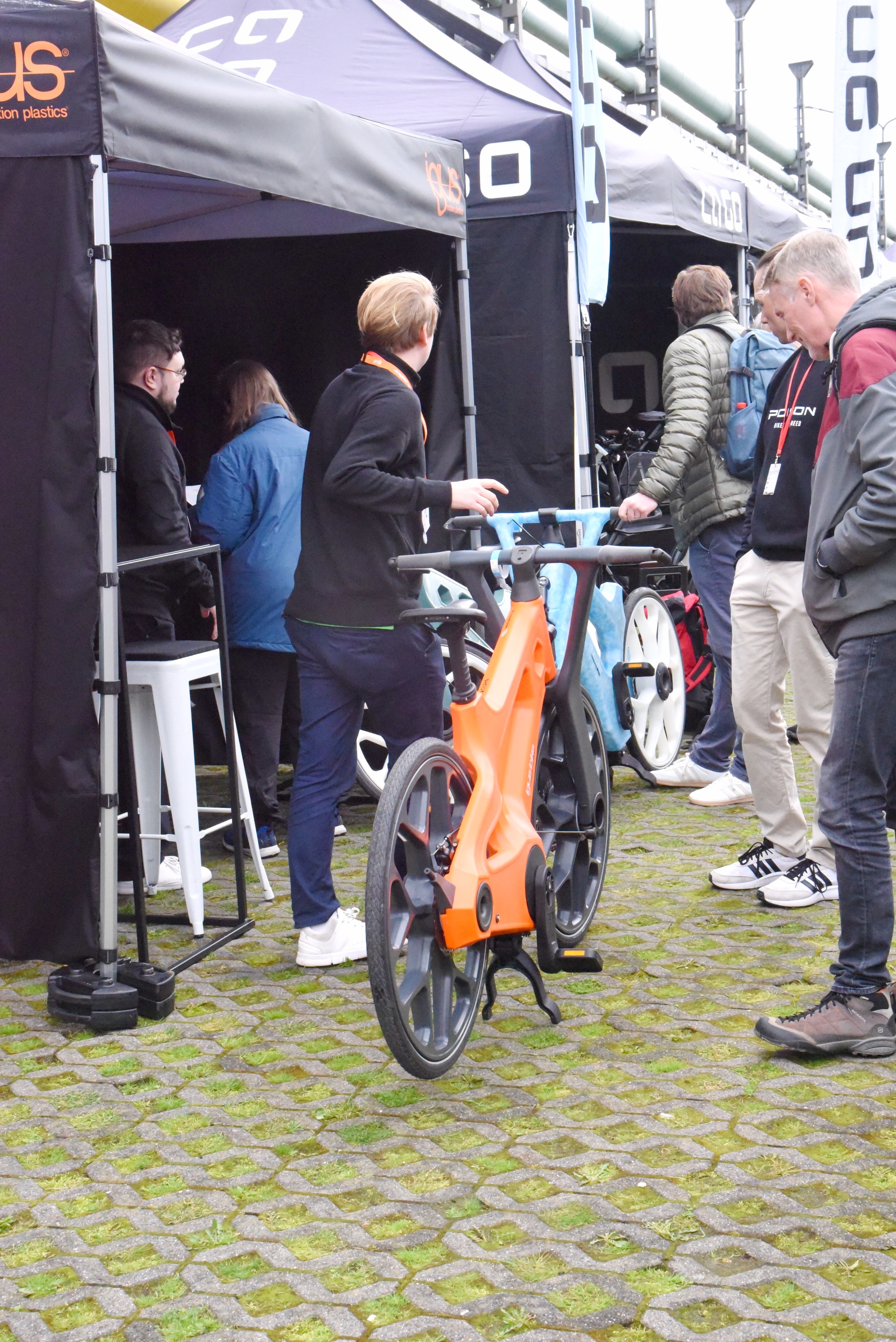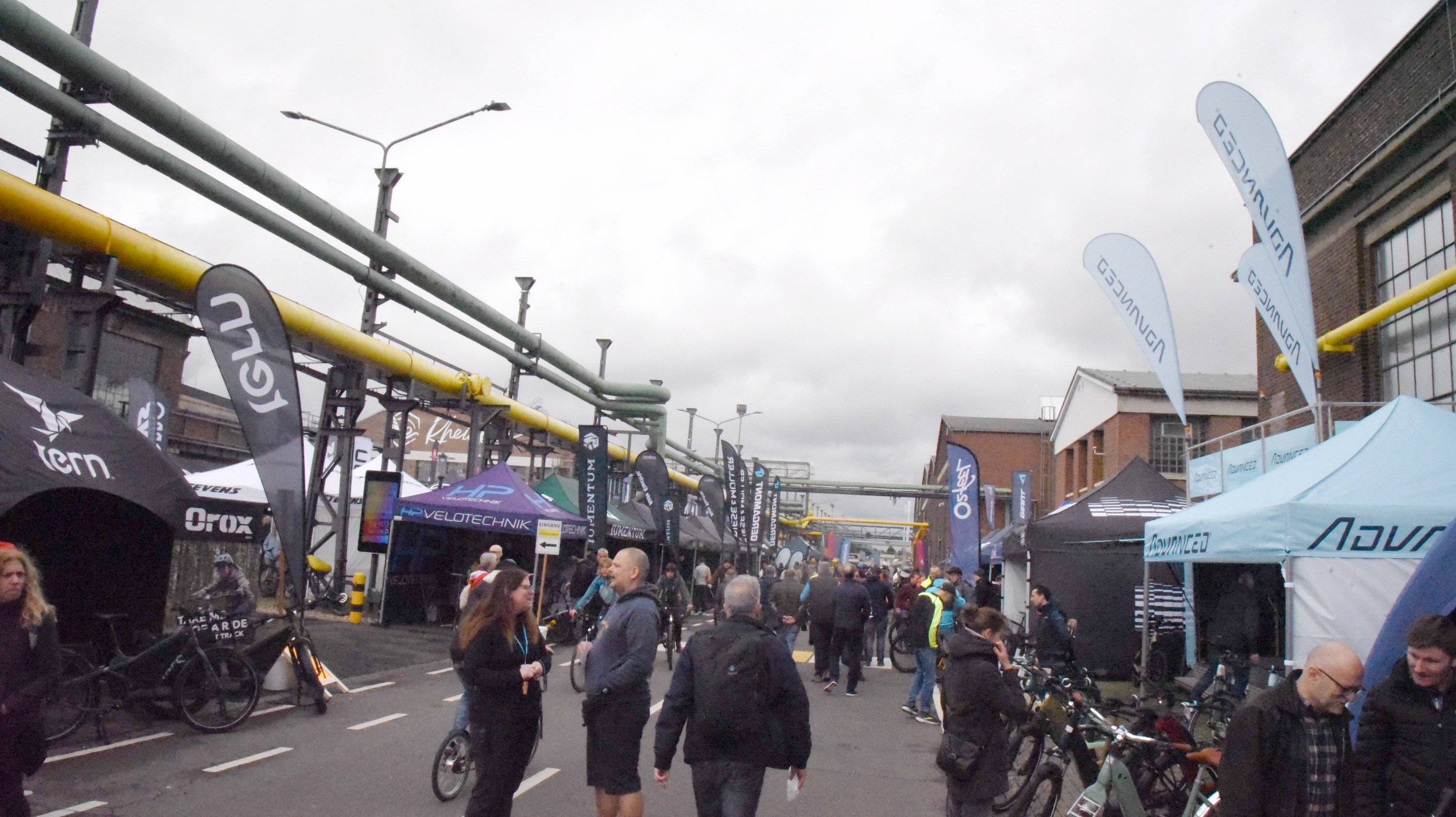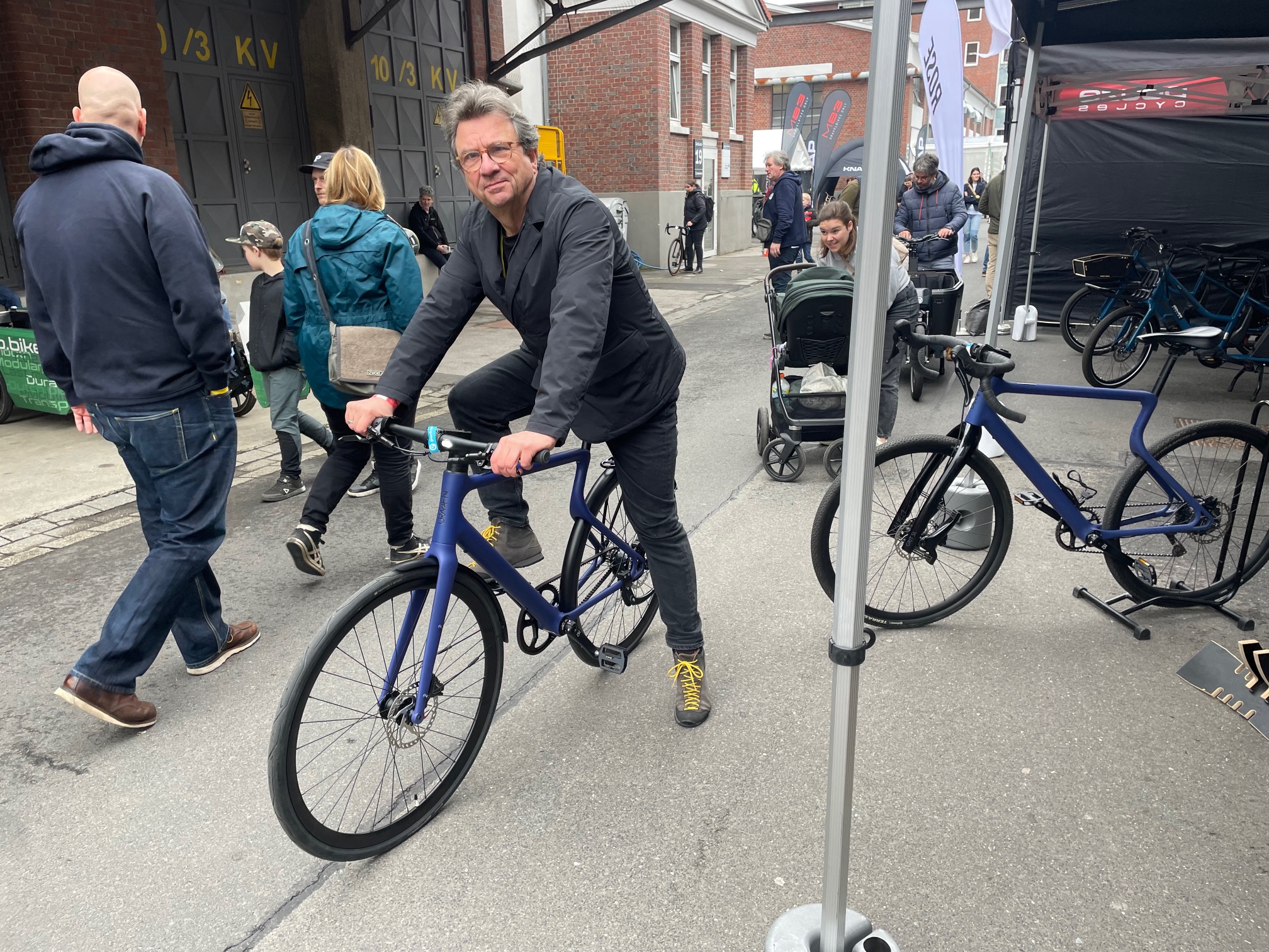 Den verbleibenden Vormittag wollte ich noch für ein paar Aussteller nutzen, die ich am ersten Tag ausgelassen hatte. Darüber hinaus war das Wetter jetzt wesentlich besser für das Außengelände und einer Testfahrt geeignet. So führte mich mein erster Weg zu Vello-Bike. Ich hatte vor einigen Jahren von Valentin Vodev, dem Entwickler des Vello in Wien die gelegenheit bekommen das Rad ausgiebig zu testen. Nun interessierte mich, ob das Gute noch weiter zu entwickeln war oder ob es etwas ganz anderes entstanden ist. Und es war etwas anderes entstanden: Vello goes Lastenrad. Das Vello Sub erinnert zwar durch die Formensprache und die Geometrie an das Ur-Vello bietet aber durch den verlängerten Radstand Platz für Lasten oder zwei Kinder. Allerdings ist es nicht faltbar, was bei der Funktion allerdings auch wenig zielführend ist.