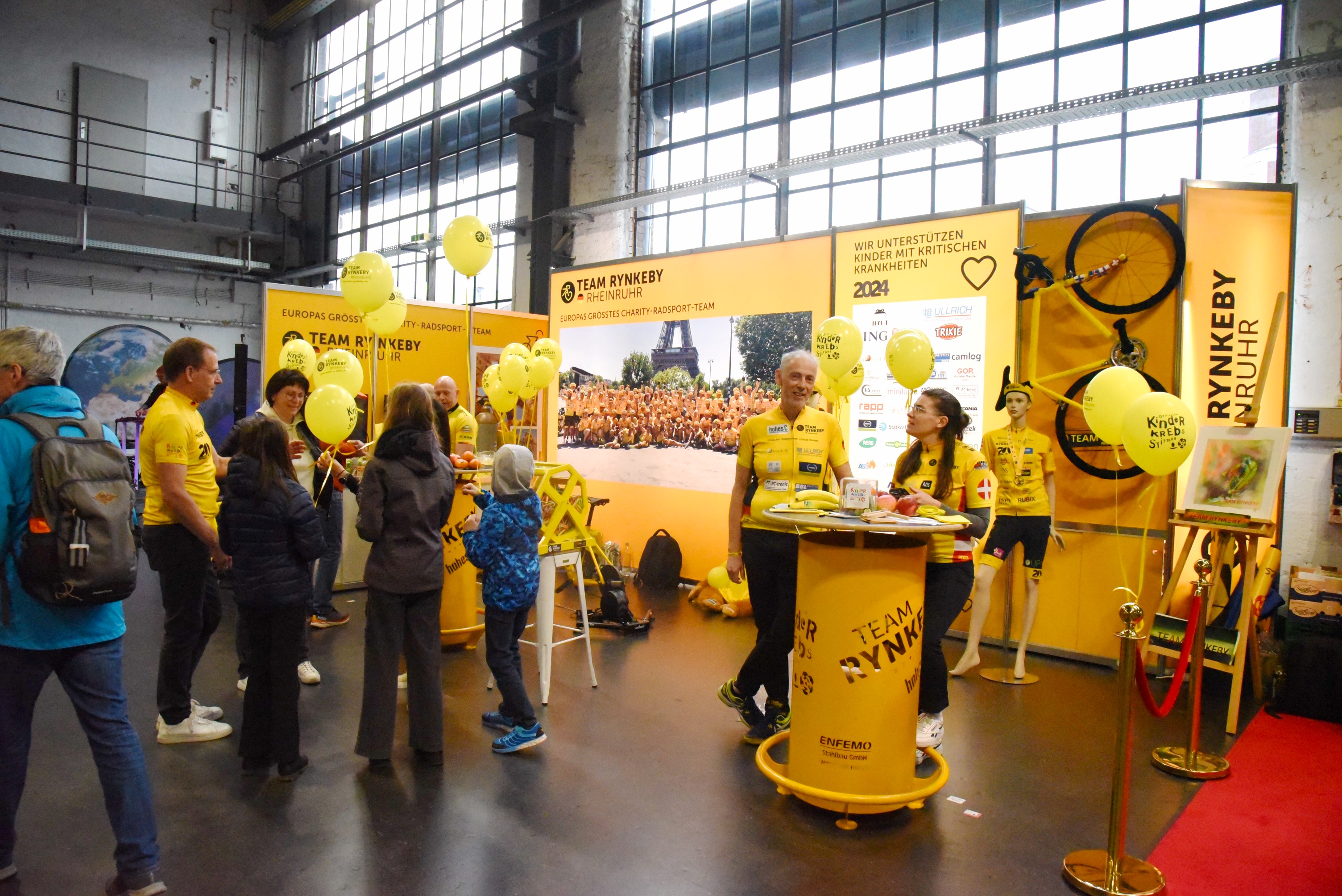 Nun wurde es leider schon Zeit für mich um rechtzeitig zum abendlichen Konzert wieder in Osnabrück zu sein. Allerdings hatte ich bereits am Vortag einem Vertreter vom Team Rinkeby Rheinruhr zugesagt an ihrem Stand vorbei zu schauen. Das Team Rinkeby ist aus einer anfänglichen Tour nach Paris von 11 Dänen zu einer internationalen Wohltätigkeitsorganisation geworden. In zahlreichen Ländern gibt es mittlerweile Teams, die mit ihren Radtouren Spenden sammeln. Das deutsche Team unterstützt mit ihren Spenden die Kinderkrebshilfe. Allein im letzten Jahr konnten mehre Millionen Euro erradelt werden. Die leuchtend gelben Teamtrikots und die gelabelten Räder fallen auf. Im Sommer geht die internationale Sternfahrt nach Paris. Kann es eine bessere Kombination aus eigener Fitness, Spenden sammeln und internationaler Freundschaft geben. Wo man auch immer einen Rynkeby-Fahrer/Fahrerin sieht, kommt man sofort ins Gespräch.