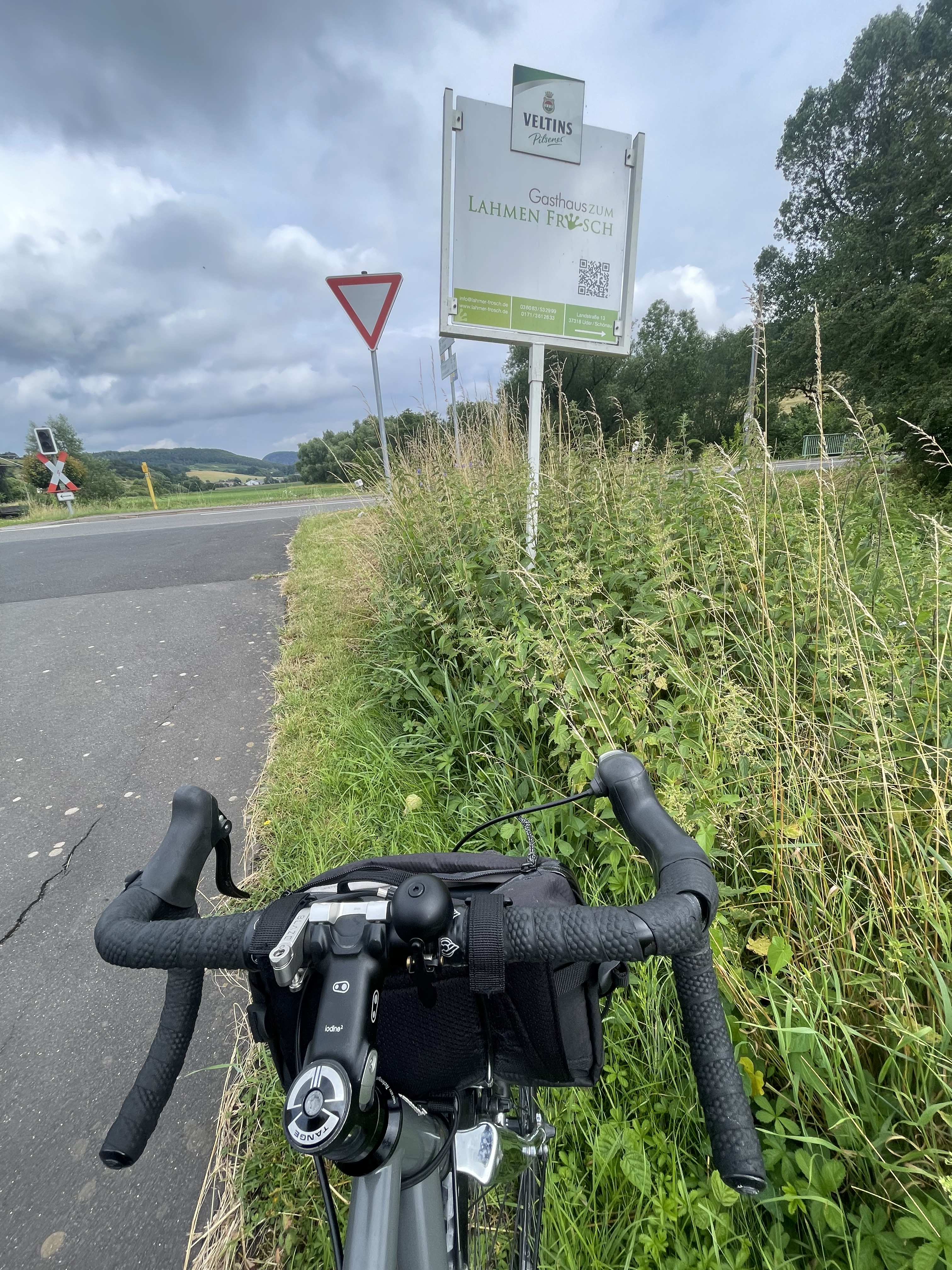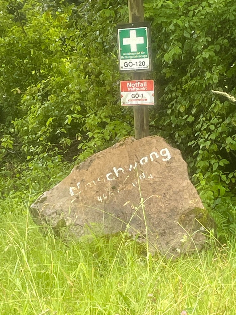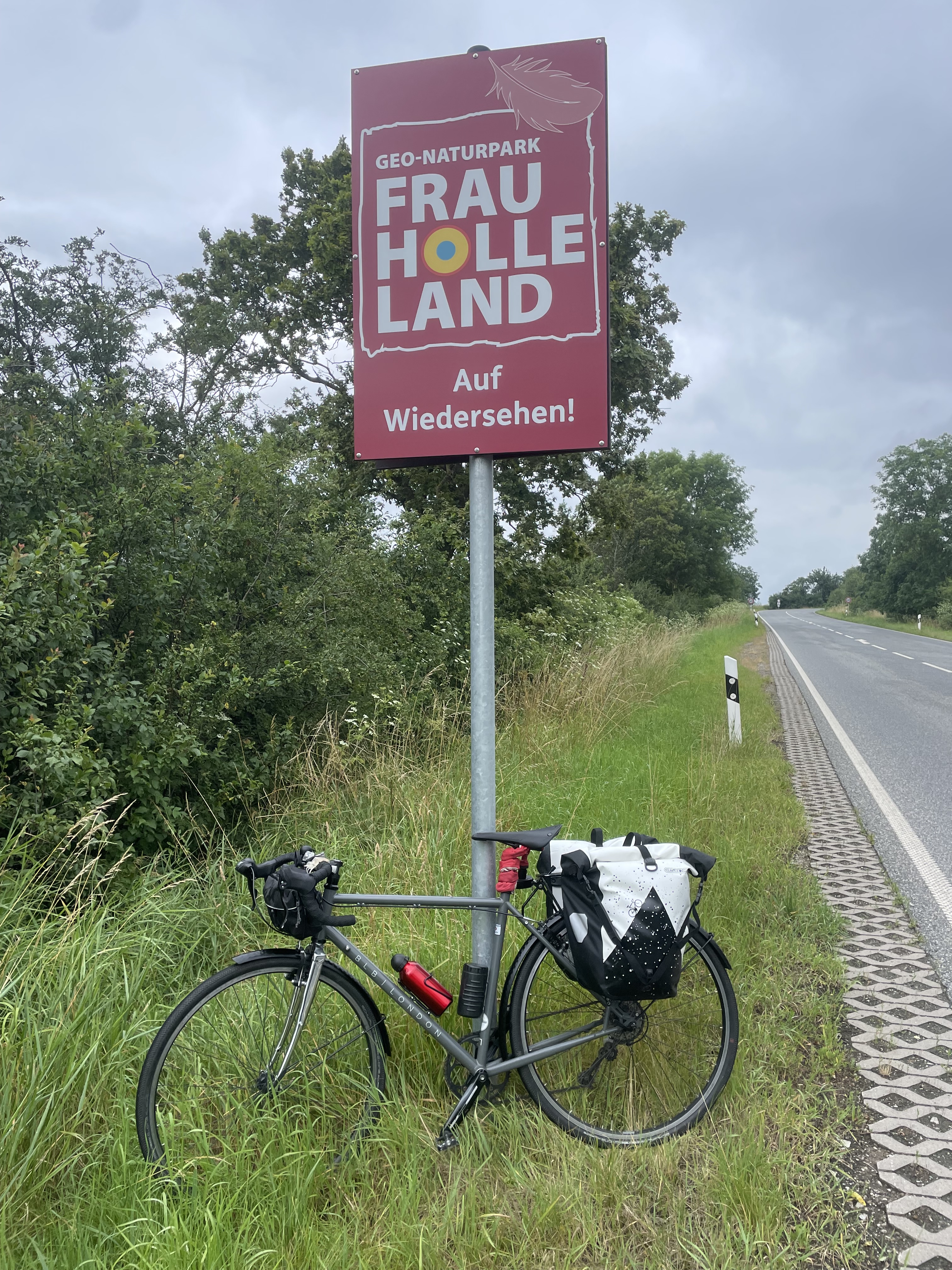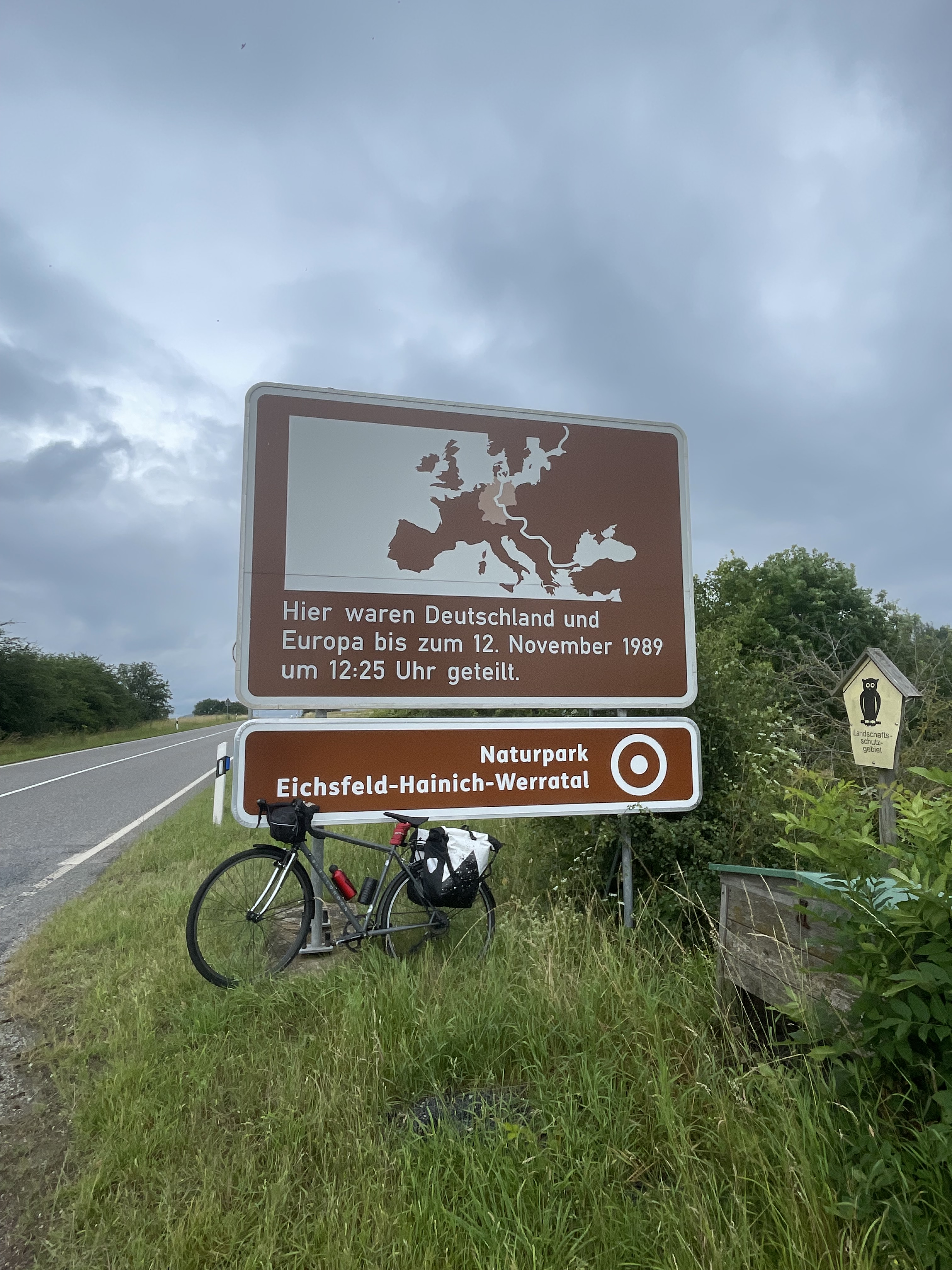 Der Regen ließ nach, allerdings erst einmal nur um anscheinend abzuwarten, ob wir aus der Hütte auch wieder hervorkommen. Kaum saßen wir auf dem Rad schien er an Intensität wieder etwas zu steigern. Entschädigt wurden wir jedoch durch eine etwa 10 km lange Abfahrt, in der richtig Strecke gut gemacht werden konnte. Witzenhausen kam näher und damit unsere spontan eingeplante Mittagspause in der schönen Fachwerkstadt. Kurz vorher kreuzten wir noch die ehemalige Grenze zwischen den beiden deutschen Staaten, die heute durch ein großes Schil markiert werden muss, da sie sonst nicht mehr erkennbar ist.