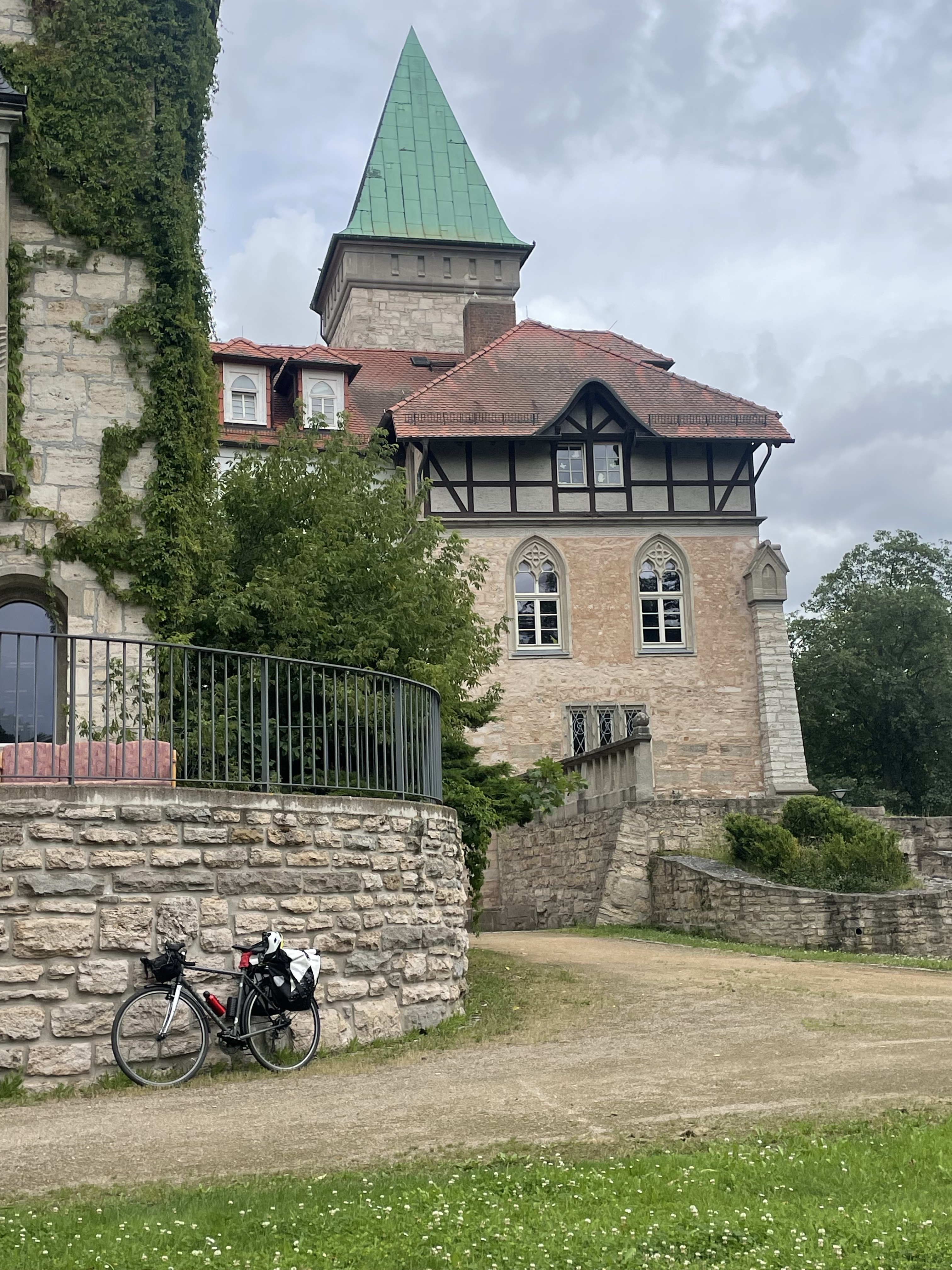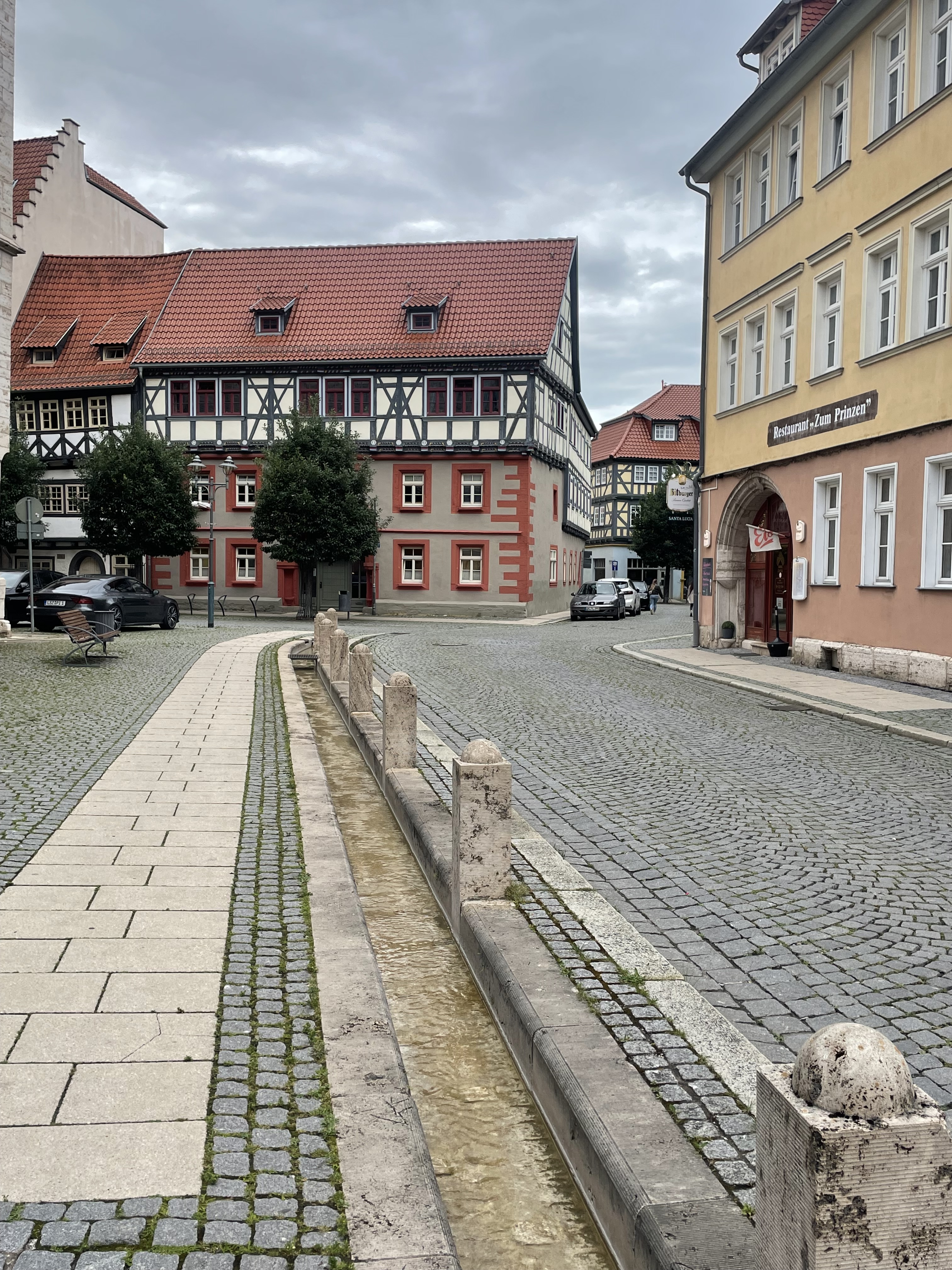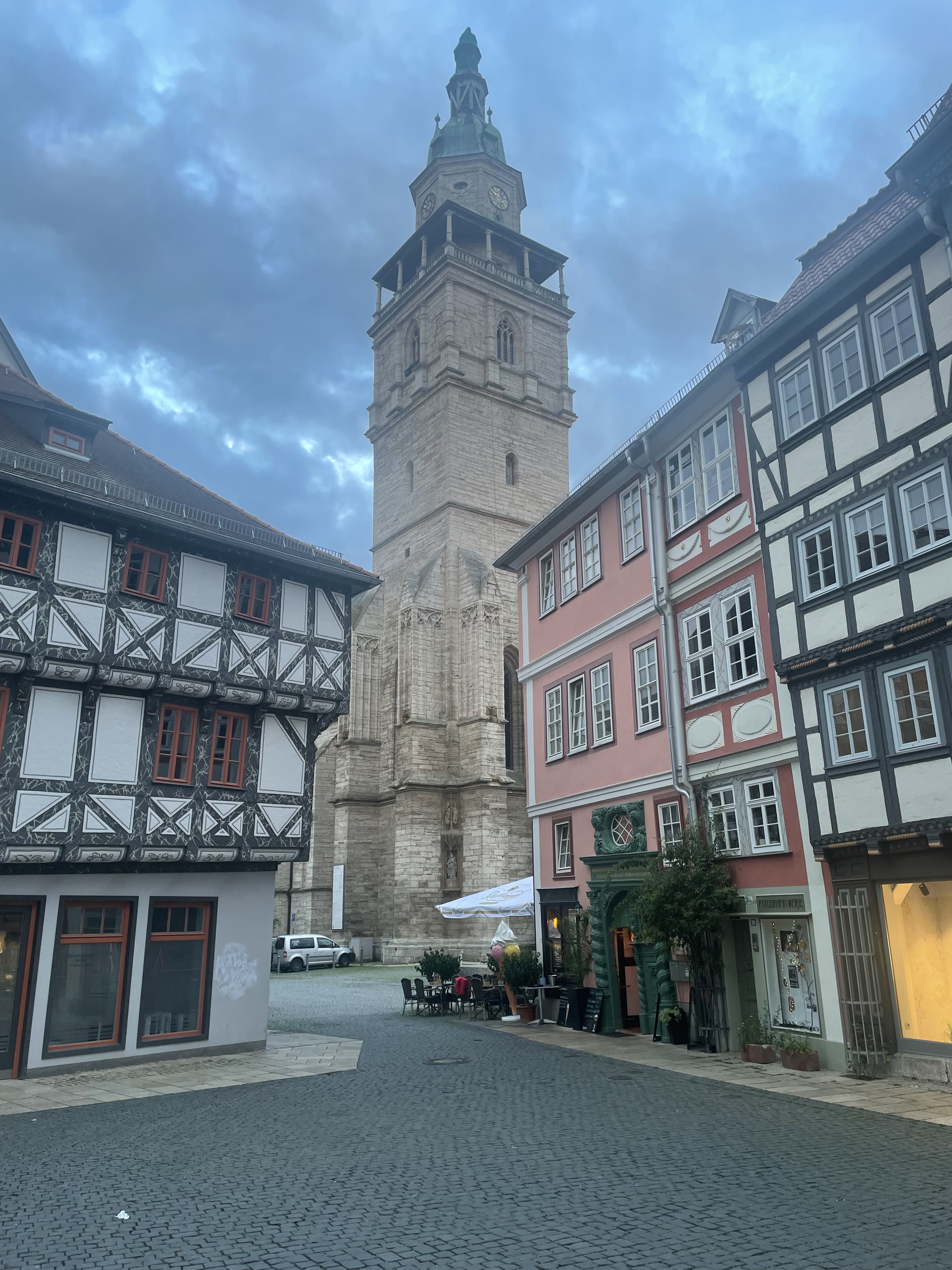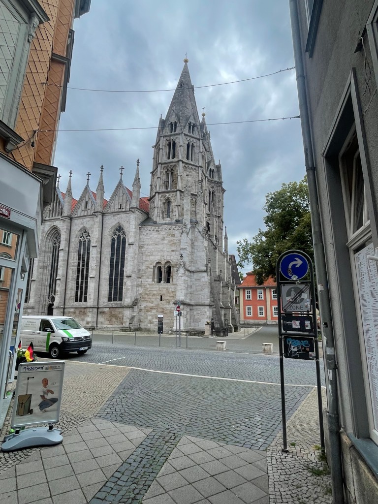 Während wir in der Fußgängerzone auf unser Mittagessen warteten, kam mir zum ersten Mal die anstehenden Landtagswahlen in Thüringen in den Kopf. Die Menschen laufen durch die Straße man kommt auf den Gedanken ab zu zählen. Ab zu zählen danach, dass wohl die Hälfte nicht zur Wahl gehen wird und von der zweiten Hälfte jeder Dritte eine rechtsradikale Partei wählen wird. Doch die Bilder, die wir in den kleinen und mittleren Orten bisher gesehen haben, geben für mich überhaupt keinen Grundher, so unzufrieden mit unserer Situation zu sein, um diese Menschen verachtende Partei zu wählen. Die Straßen und Gehsteige sind saniert, die historischen Gebäude renoviert und in lebendigen Farben gestrichen. Vor den Häusern stehen Mittel bis Oberklasse Fahrzeuge, die im Schnitt nicht älter als fünf Jahre scheinen. Was bewegt diese Menschen in einem Umfeld, dass nicht nur im Vorzeigezentrum, sondern auch in den Nebenstraßen der Orte zu entdecken ist, diesem Land gegenüber so verachten zu wählen. Übrigens, warum wegen eines schiefen Turmes nach Pisa fahren, wenn auch Mühlhausen einen Kirchturm zu bieten hat, der der Erdanziehung deutlich zugeneigt ist.