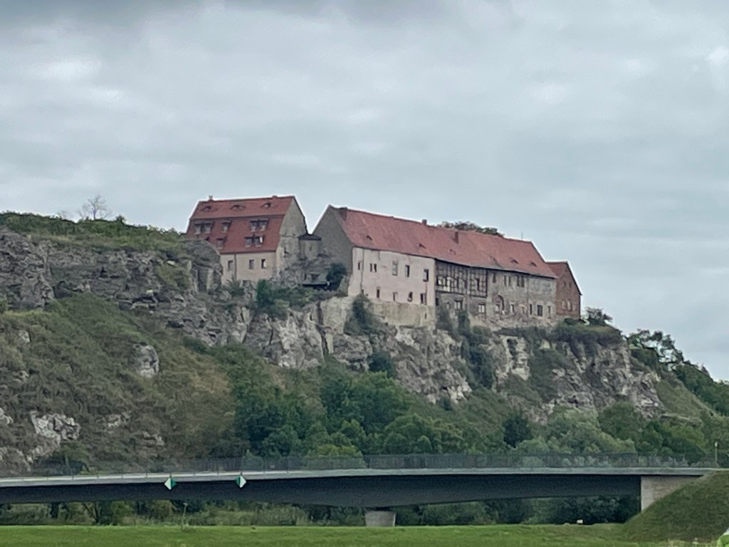Vorbei ging es an der Burg Wendelstein, die wir unter Schonung der Konstitution links liegen ließen. Die Strecke wird abwechslungsreicher, Wiesen und Felder wechseln sich ab mit Weinbergen und Sandsteinformationen. In Memleben machen wir einen Abstecher zum Kloster und zur Kaiserpfalz. Schließlich gehörte dieses Anwesen irgendwann mal meinem Uran, Kaiser, Karl dem Großen. Allerdings hat er bereits vor 794 die Kaiserpfalz mit den Ländereien dem Kloster geschenkt, ohne an seine zukünftigen Erbengenerationen zu denken. Der mit mir radelnde Jurist hat mir klargemacht, das eine Anfechtung dieser Schenkung wenig Erfolg haben würde. So schwingen wir uns wieder auf die Räder und weiter geht’s entlang der Unstrut.