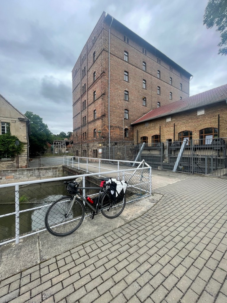 Am Fuße der Arche wurde für die Besucher ein hervorragendes Service-Gebäude errichtet, in dem wir auch unsere Räder samt Packtaschen einschließen konnten. Nach Kaffee und Kuchen und dem obligatorischen Foto über die Landschaft geht es weiter Richtung Nebra. Aber Nebra lassen wir links liegen und strampeln weiter nach Laucha. Die Mühle mit dem Wehr, das Rathaus und die Kirche bieten spannende Motive. Länger hält es uns allerdings nicht in dem Ort und weiter geht es entlang der Stadtmauer nach Freyburg. Kurz vor dem Ort kreuzen wir die Unstrut an der Zscheiplitzer Mühle. Hier können wir die Unstrut an der Stelle kreuzen, an der bereits Napoleon im Kampf die gegen die preußischen Truppen das Ufer wechselte. Ich bezweifle allerdings, dass es noch die gleichen Bohlen sind, die uns den Weg über das Wasser bahnen über die der Schimmel von Napoleon seine Hufe gesetzt hat.