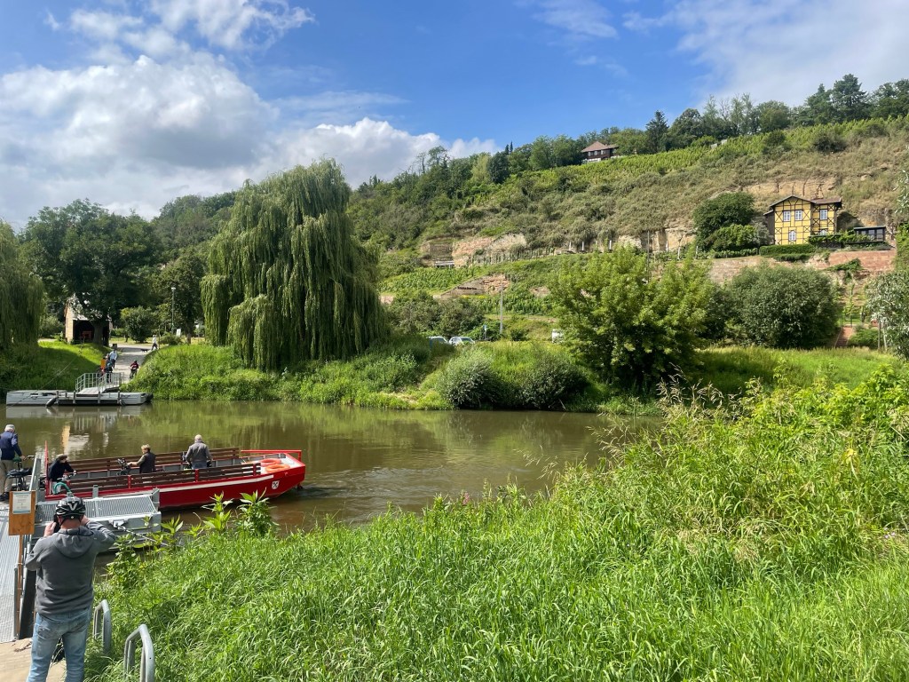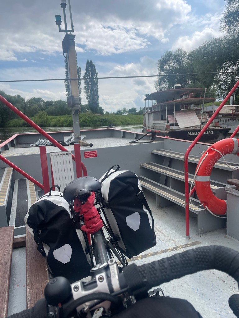 Unser Tagesziel ist nun nicht mehr weit. Kurz hinter Freyburg haben wir die Wahl, entweder die kürzere Strecke über die Landstraße oder den sich am Weinbergen entlangschlängelnden Radweg zu wählen. Die Wahl ist nicht schwer, vor allem, weil der Radweg nach Naumburg, direkt bei der Mündung der Unstrut in die Saale mit einer Fähr-Fahrt belohnt wird.