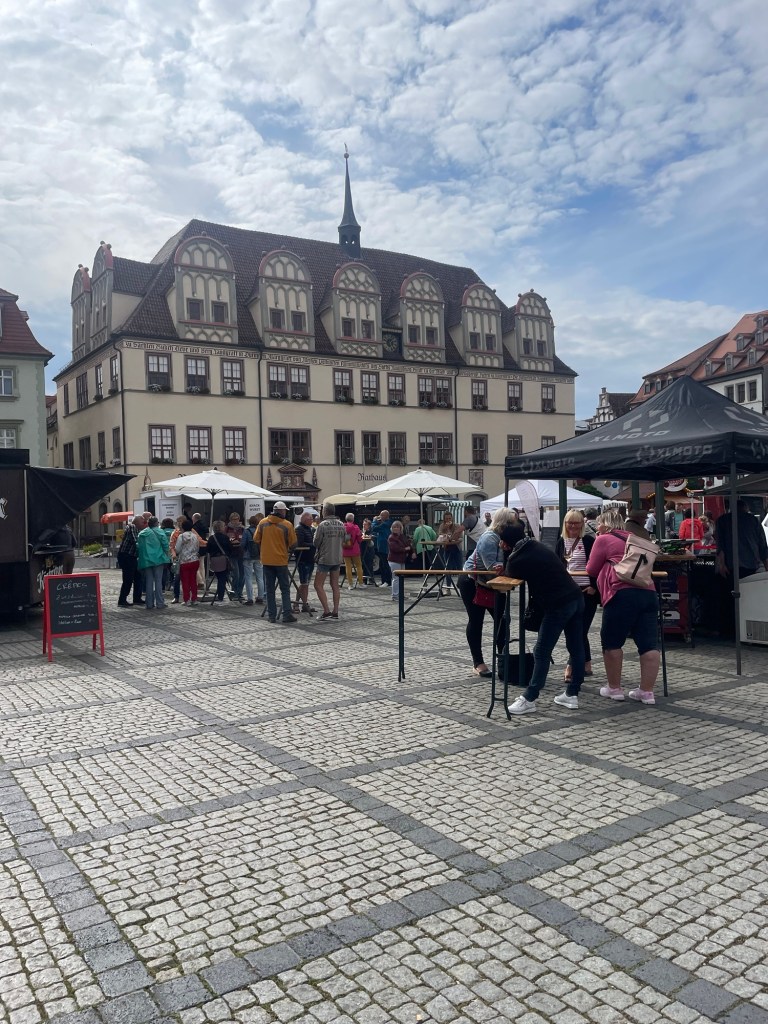 Der Tag endet mit ein/zwei Gläsern Wein vom regionalen Winzer auf dem Abendmarkt. Er erklärt uns, warum der Saale-Unstrut Wein in anderen Regionen so unbekannt ist. Es werden lediglich so viel Flaschen produziert, wie in der Region getrunken werden. Da man bei dem Winzer auch Wein bestellen kann, wird die Region wohl demnächst auf ein paar Kisten verzichten müssen. Morgen geht es dann auf die letzte Etappe nach Halle.