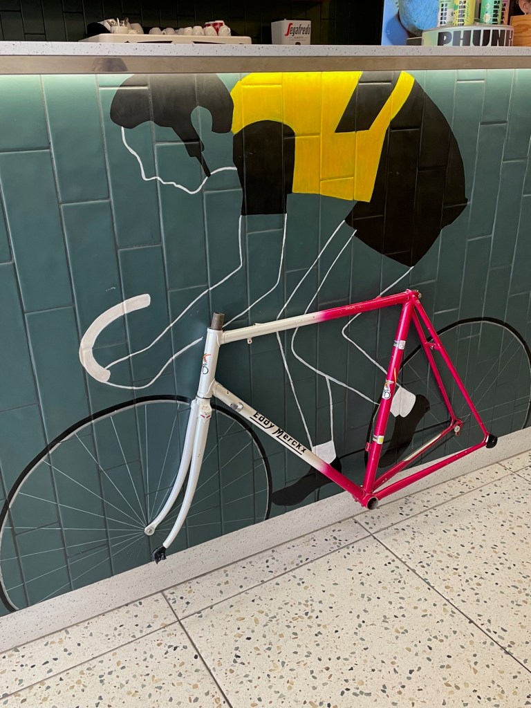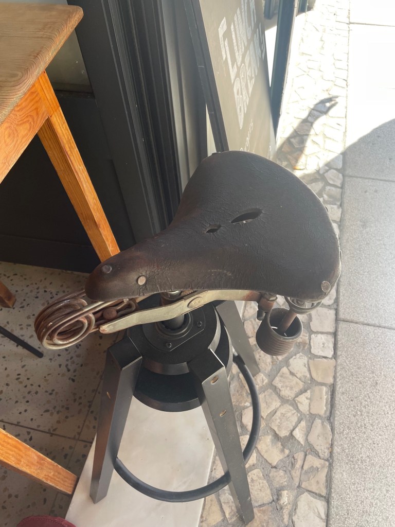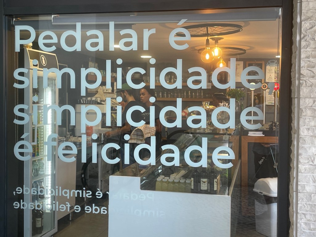 Das Grupeto Crais öffnet sich direkt zur Straße und bietet eine noch umfangreiche Speisekarte als das Groupeto Expo. Ich komme mit Pancakes Salted Caramell, Joghurt mit Früchten und einem Galão (portugiesischer Kaffee mit Milch) voll auf meine Kosten. Auch dieses Radcafé ist mit zahlreichen Fahrrad Accessoires ausgestattet. Trikots und Laufräder an den Wänden, im hinteren Teil Vitrinen mit Büchern und Radkomponenten. In der hintersten Ecke repariert ein benachbarter Fahrradhändler ein Rad, da er seinen Laden aufgeben musste und das Grupetto ihm „ Asyl“ gewährt hat.