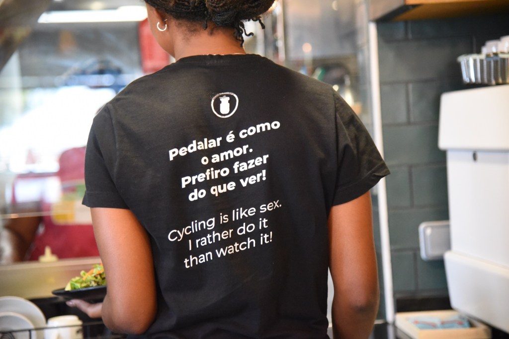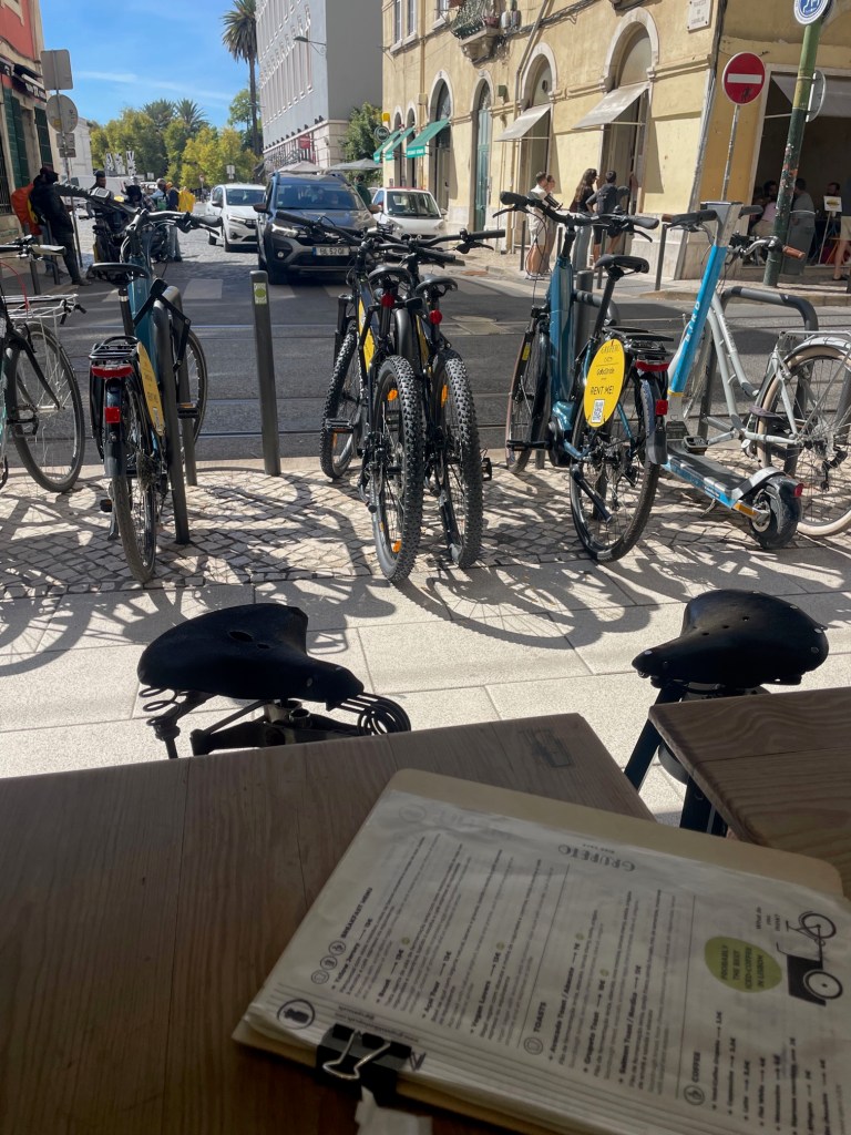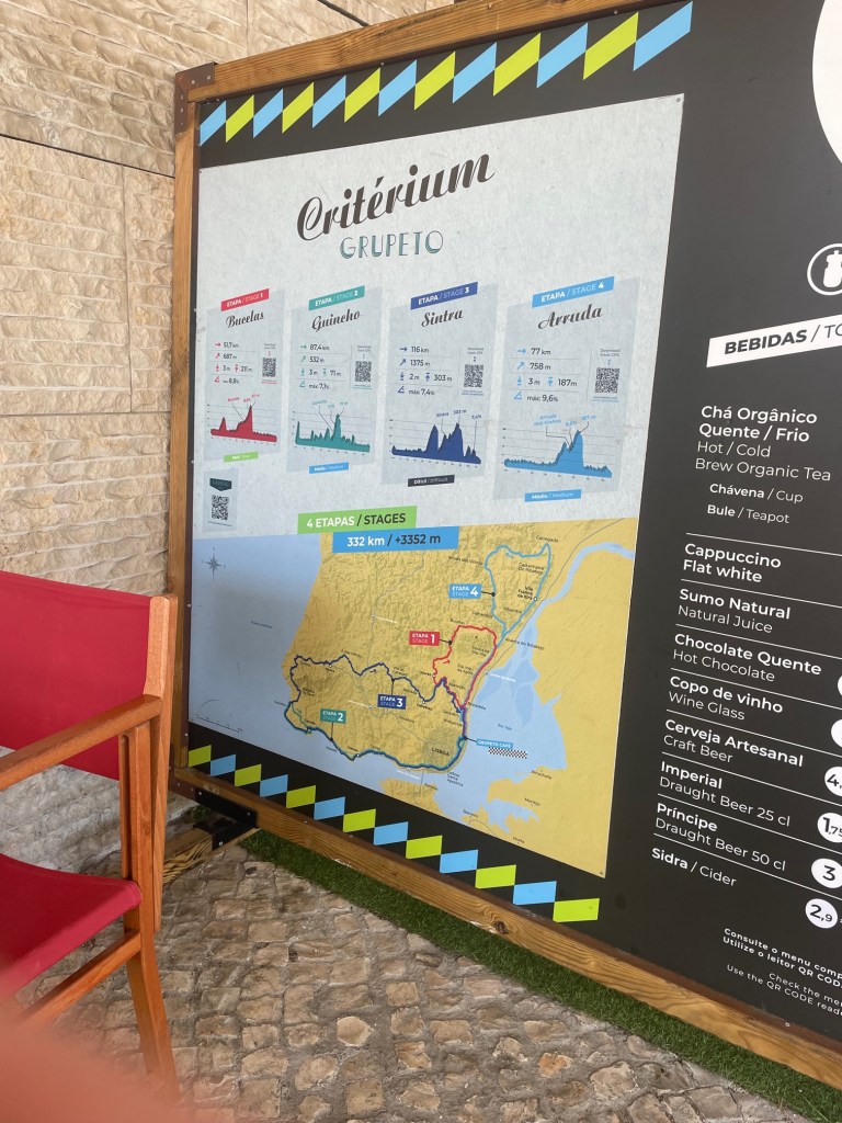 Auf einem großen Tisch sind mehrere spannende Routen rund um Lissabon dargestellt, von denen einige aufgrund der angegebenen Höhenmeter für mich wohl Illusionen bleiben werden. Levi, der uns super bediente und mit dem ich ins Gespräch komme, erzählt von den Routen entlang des Tejo, die auch für mich zu bewältigen seien. Er berichtet auch davon, dass insbesondere an den Wochenenden zahlreiche Rennradfahrer das Grupeto als Zwischenstopp wählen. Natürlich brauche ich für meine T-Shirts Sammlung des Original Grupeto-T-Shirt. Levi’s Kollegin trägt von diesem T-Shirt noch die Spezialvariante.