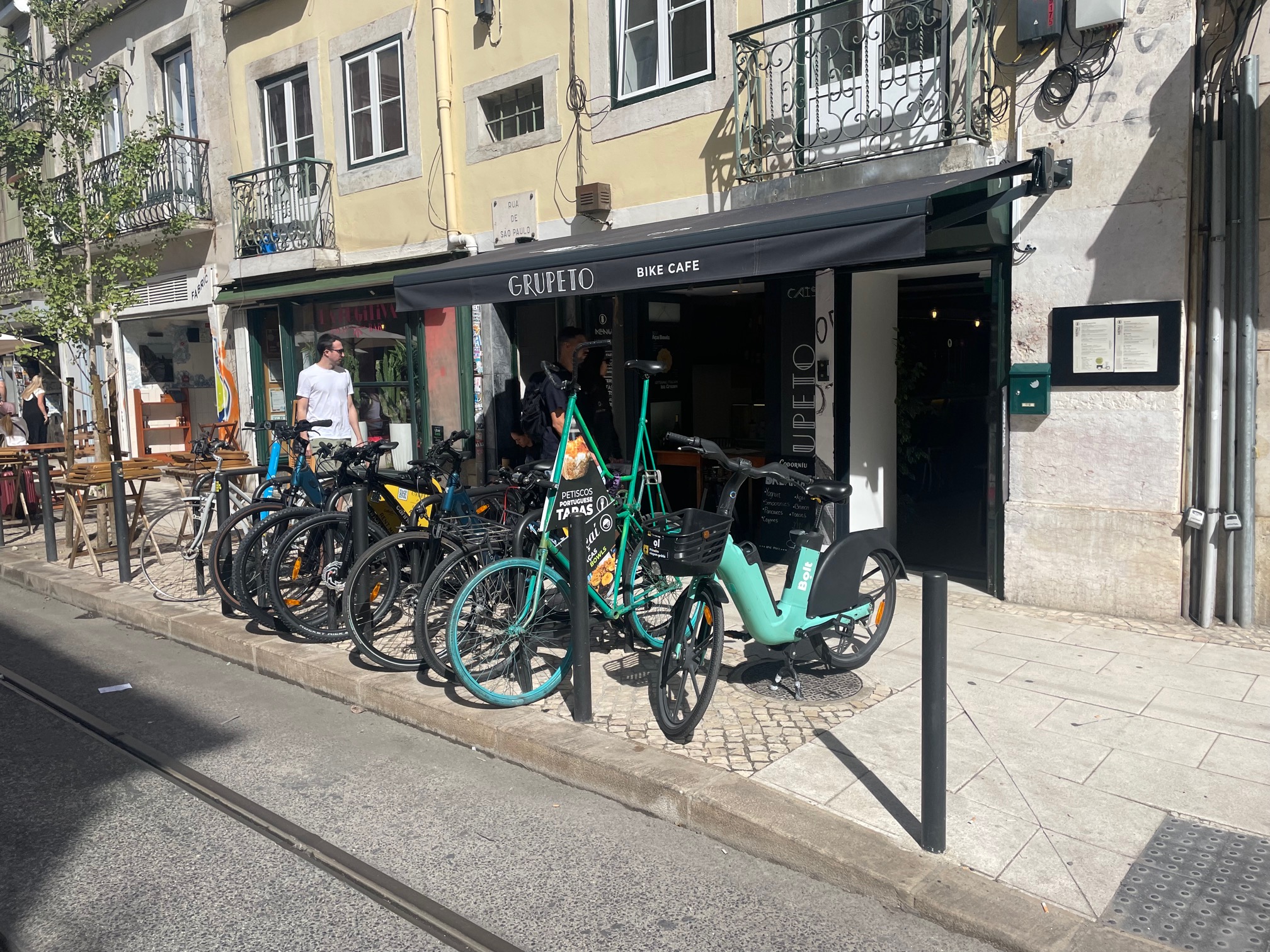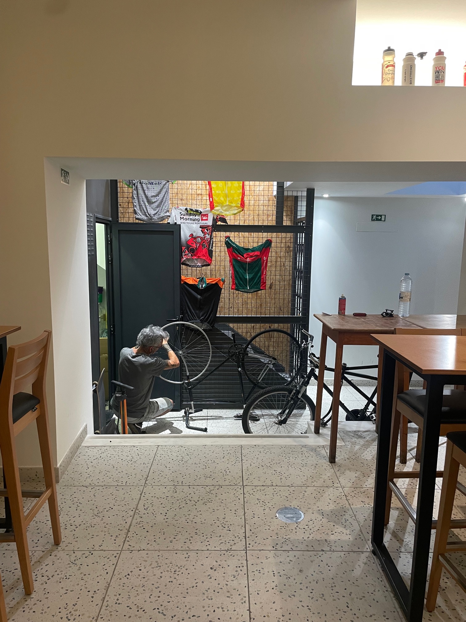 Das Grupeto Crais öffnet sich direkt zur Straße und bietet eine noch umfangreiche Speisekarte als das Groupeto Expo. Ich komme mit Pancakes Salted Caramell, Joghurt mit Früchten und einem Galão (portugiesischer Kaffee mit Milch) voll auf meine Kosten. Auch dieses Radcafé ist mit zahlreichen Fahrrad Accessoires ausgestattet. Trikots und Laufräder an den Wänden, im hinteren Teil Vitrinen mit Büchern und Radkomponenten. In der hintersten Ecke repariert ein benachbarter Fahrradhändler ein Rad, da er seinen Laden aufgeben musste und das Grupetto ihm „ Asyl“ gewährt hat.