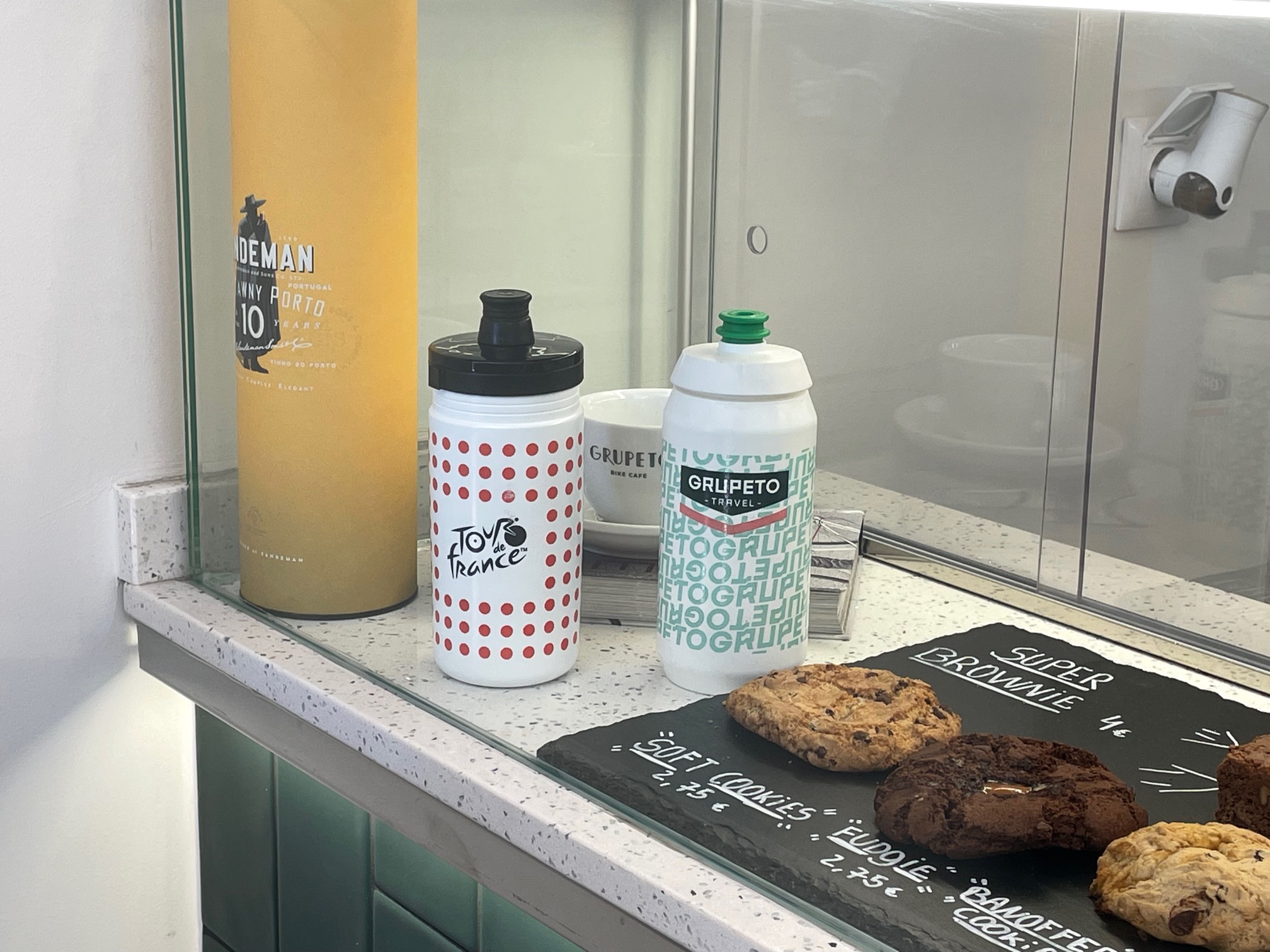 Das Grupeto (Portugiesisch für Grüppchen; im Radsport bei längeren Rundfahrten eine Gruppe von Fahrern, die sich bei Bergetappen am Ende des Fahrerfeldes bildet) lud mit schattigen Plätzen zu einem Kaltgetränk und Imbiss ein. Im Inneren dann viele Accessoires zum Radsport. An der Decke hängen Trikots und Laufräder, in die Theke ist ein Rennradrahmen integriert, und die Leuchten sind aus Laufrädern gefertigt.
