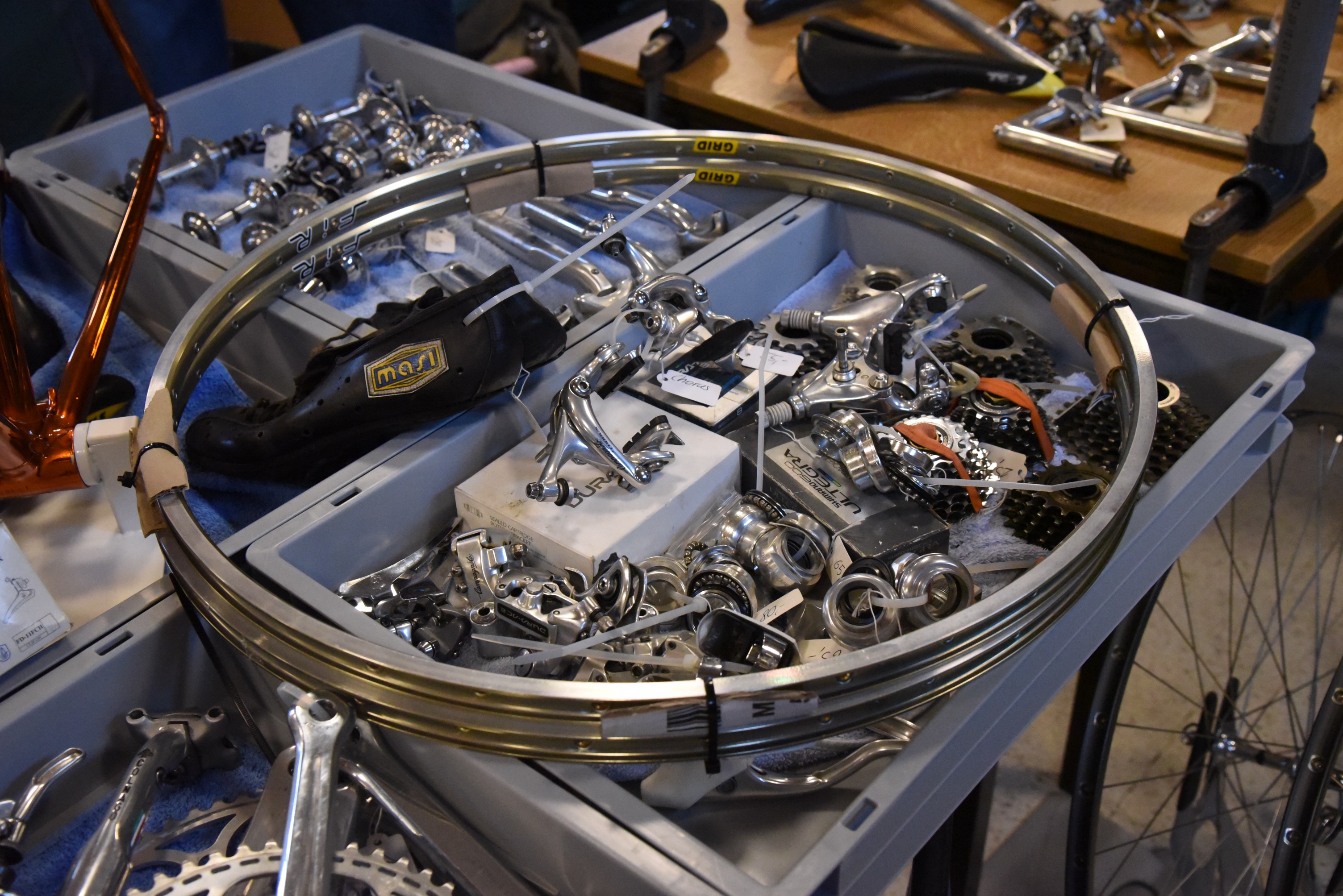 Überraschenderweise konnte ich meinen Einkaufszettel zu nahezu 90 % abarbeiten. Es fehlten zum Schluss nur noch ein paar Kleinteile. Den Satz Holzfelgen um den ich sicherlich zehnmal herumgeschlichen bin, habe ich zum Schluss dann doch nicht erworben. Ich weiß nicht, ob es mir in den nächsten Wochen leid tun wird, allerdings stehen erst einmal andere Rennrad-Aufbauten an, für die Holzfelgen fehl am Platz wären.