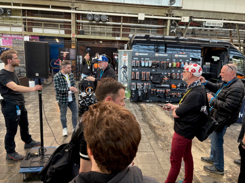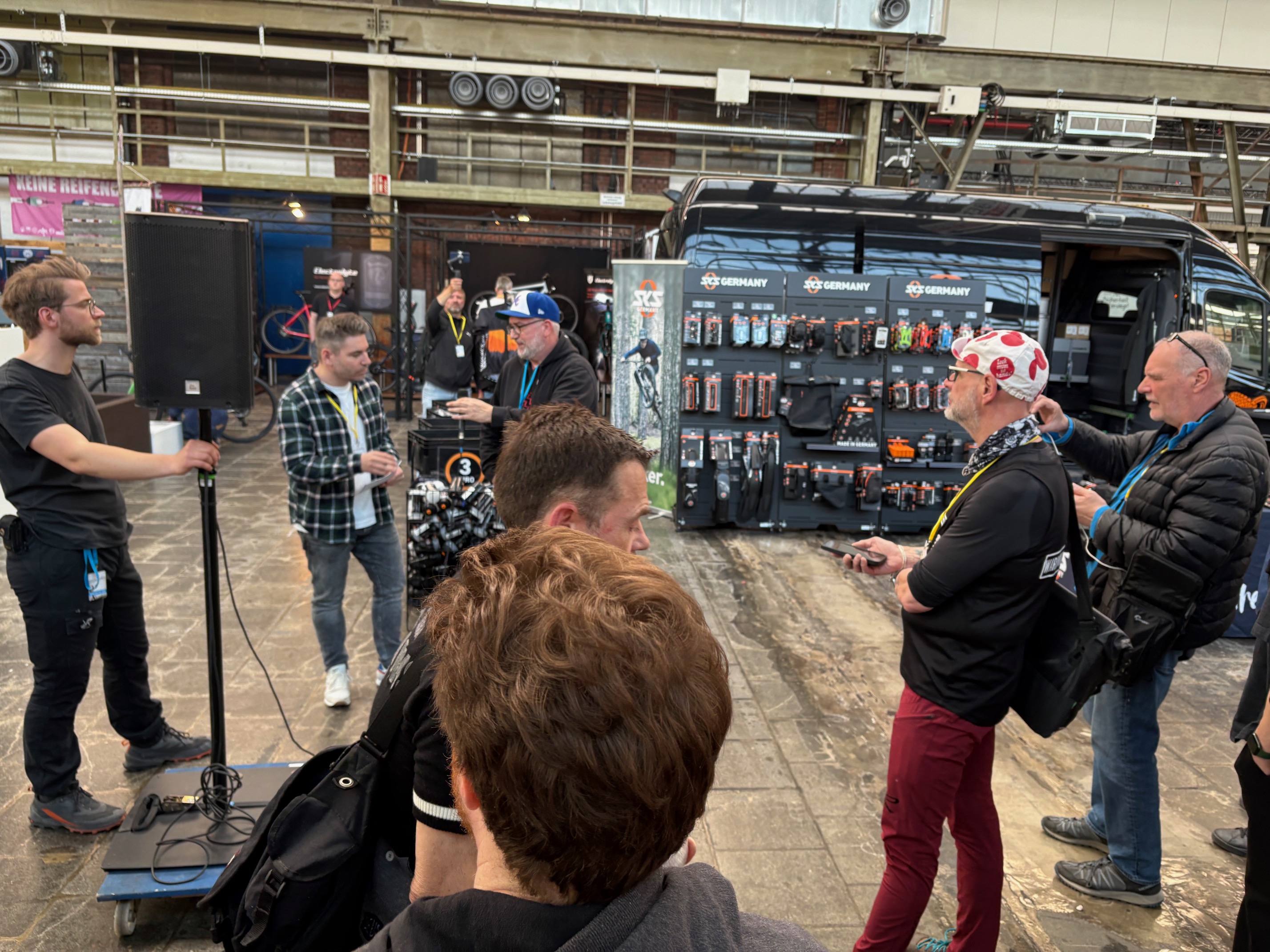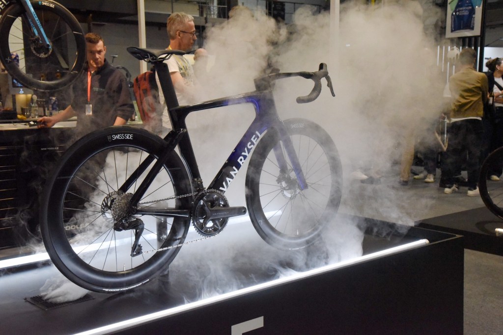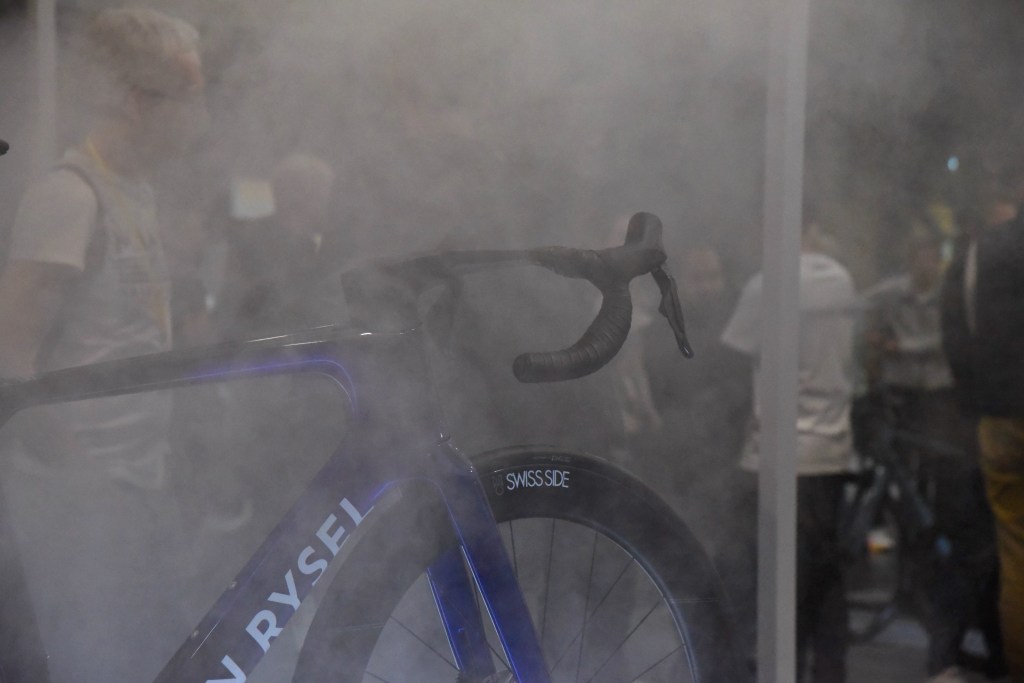 Schon zuvor hatte mich eine Mitarbeiterin der Marke Van Rysel zum abendlichen Event auf Ihren Stand eingeladen. In der Federnfabrik hat Van Rysel direkt in der Poolposition einen großen Stand aufgebaut. Mir war die Marke, die es seit 2019 gibt, bisher unbekannt. Der Auftritt auf der Cyclingworld Europe 2025 signalisiert mit seiner Größe den Aufbruch in die Profi-Liga. Als Tochter von Decathlon sitzt Van Rysel in französisch Flandern und damit in einer der radafinsten Regionen. In zentraler Position das neue RCR-F. Aus dem Podest steigt immer wieder Nebel hervor. Die Inszenierung verfehlt ihre Wirkung nicht. Der Stand ist durchgängig stark umlagert.