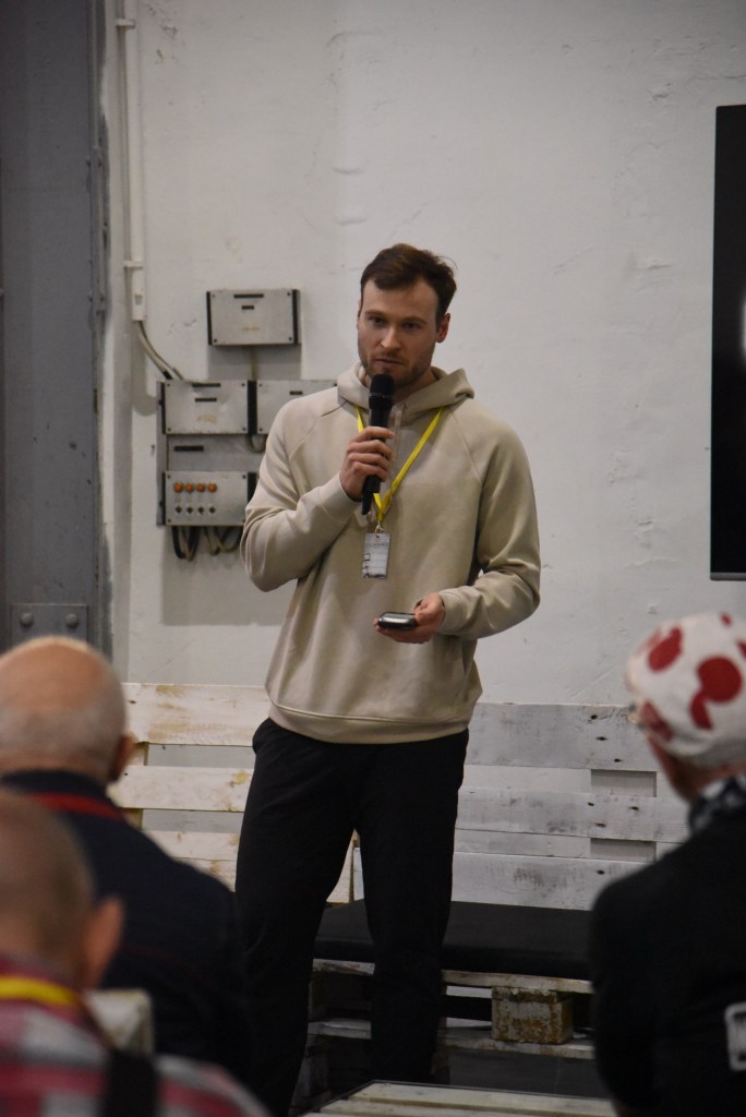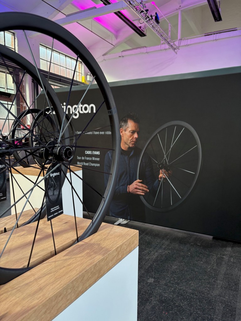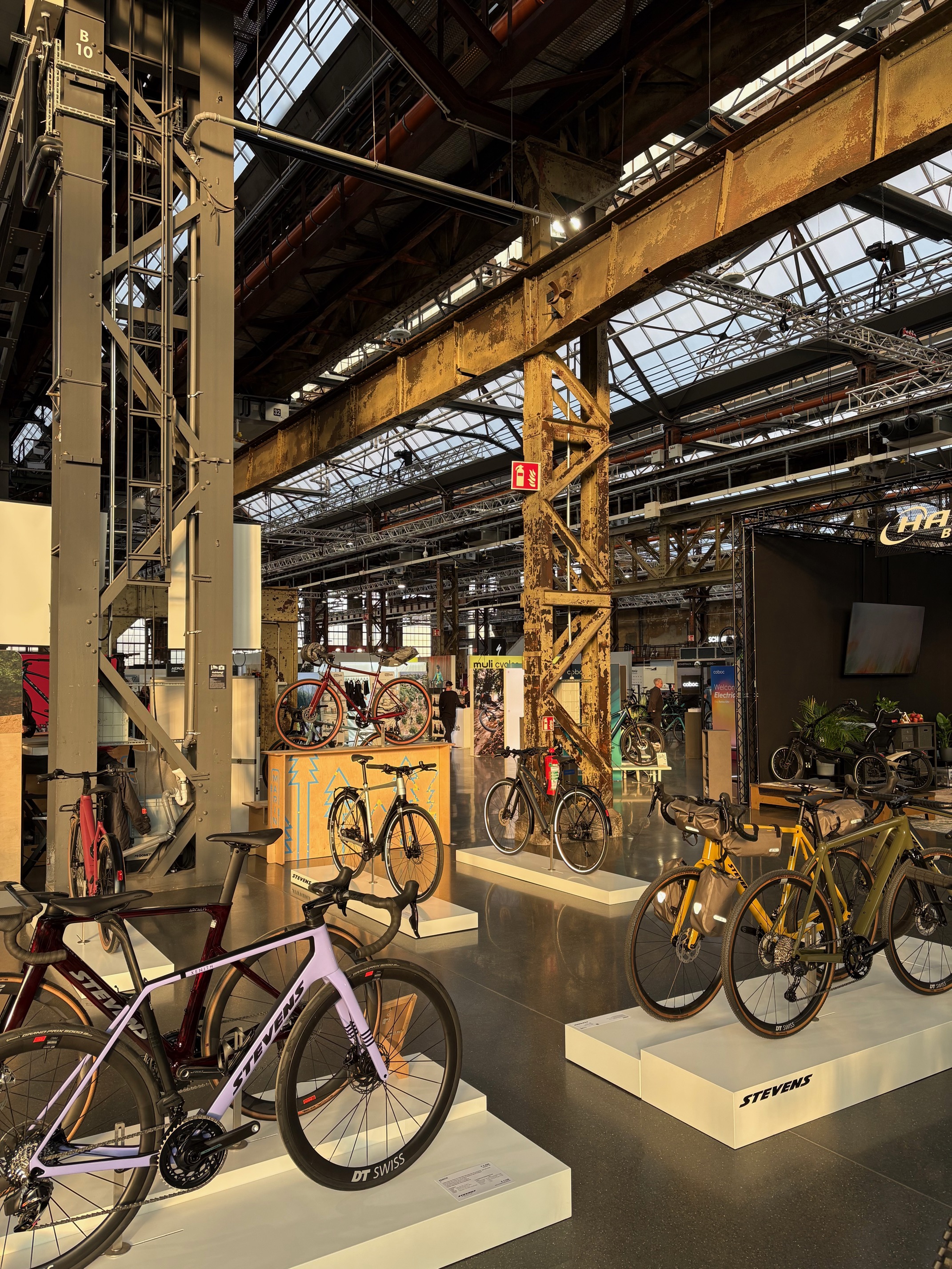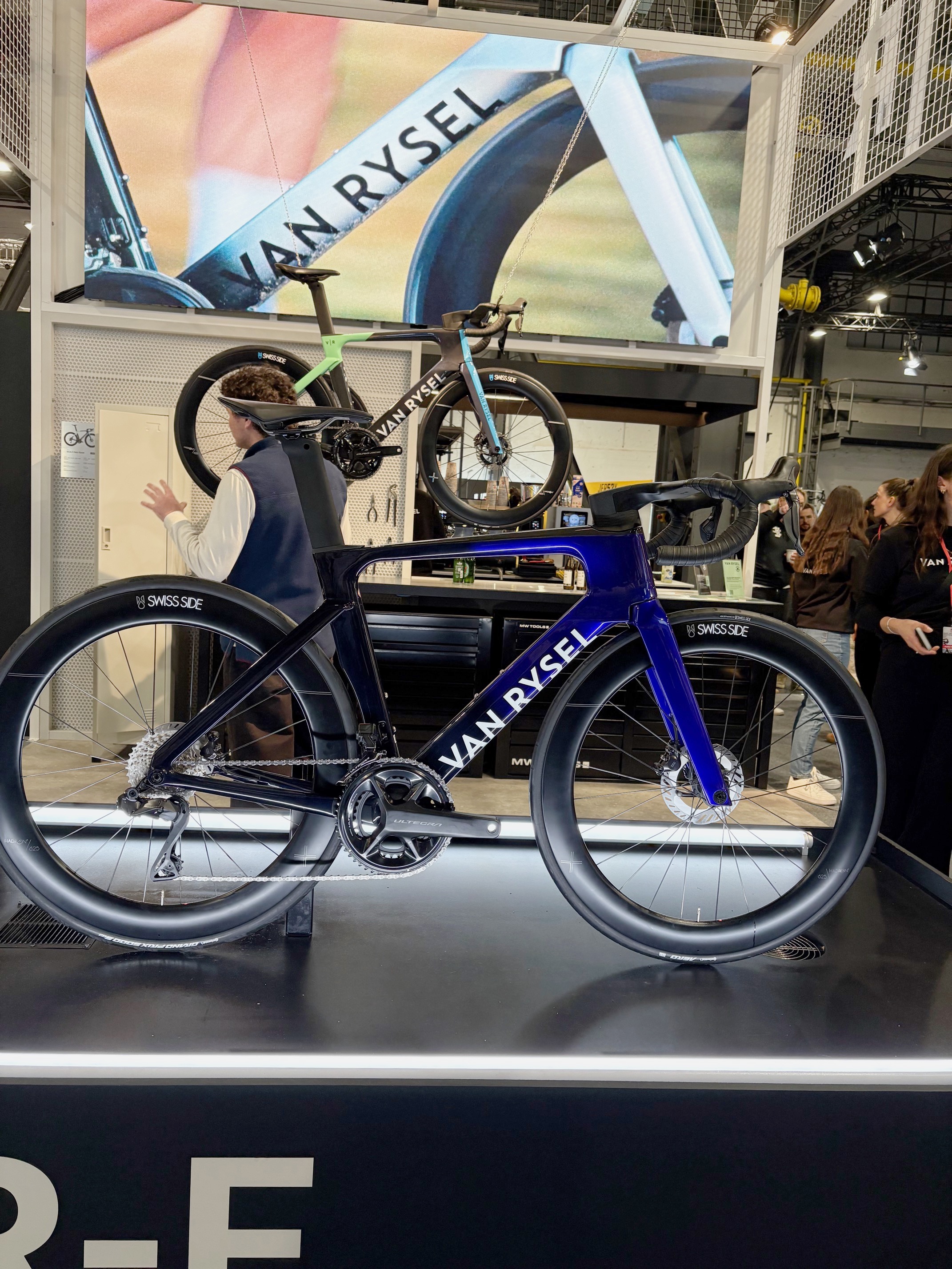 Schon zuvor hatte mich eine Mitarbeiterin der Marke Van Rysel zum abendlichen Event auf Ihren Stand eingeladen. In der Federnfabrik hat Van Rysel direkt in der Poolposition einen großen Stand aufgebaut. Mir war die Marke, die es seit 2019 gibt, bisher unbekannt. Der Auftritt auf der Cyclingworld Europe 2025 signalisiert mit seiner Größe den Aufbruch in die Profi-Liga. Als Tochter von Decathlon sitzt Van Rysel in französisch Flandern und damit in einer der radafinsten Regionen. In zentraler Position das neue RCR-F. Aus dem Podest steigt immer wieder Nebel hervor. Die Inszenierung verfehlt ihre Wirkung nicht. Der Stand ist durchgängig stark umlagert.