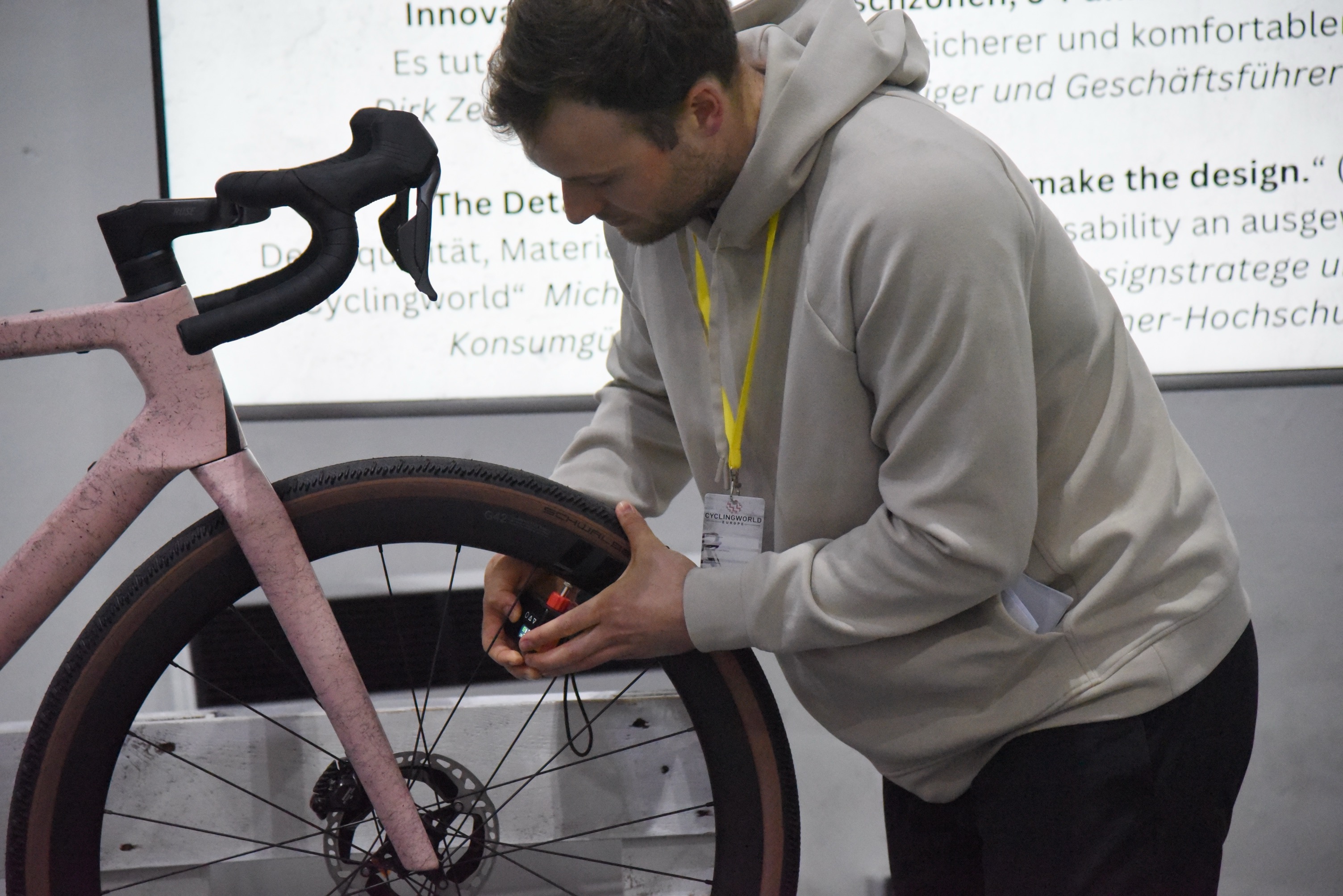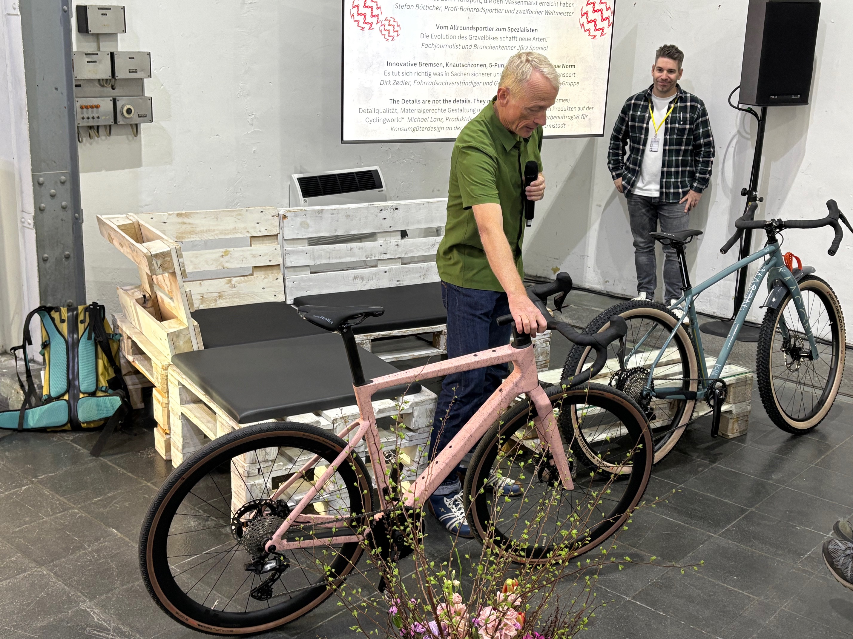 Der Presserundgang endete dann in der Bloggers-Lounge. In Einzelvorstellungenkonnte dort noch mal auf einige spezielle Produkte etwas ausführlicher eingegangen werden, als dies in der Präsentation der Preise möglich war. Auch wenn ich mich mit meinem Faible für ältere Stahlrennräder unter den zahlreichen Touren und Mountenbikes mit und ohne E-Antrieb manchmal etwas verloren vorkomme, erregt doch so manches neue Rad meine Aufmerksamkeit. So in diesem Jahr das Xlite 04 105 Di2 Advanced von Rose. Ich bin immer wieder überrascht, welche Innovationen zu einem passablen Preis von Rose herausgebracht werden. Leider traf ich in diesem Jahr Anatol Sostmann, Direktor Product & Brand Rose Bikes, nicht auf der Messe, der sonst immer ein hervorragender Gesprächspartner für die Szene ist.