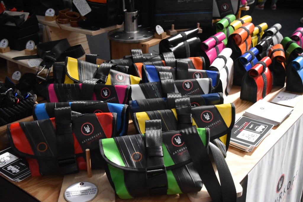 Eine ganz andere Art des Recycling bietet Arthur Kopf. Seine innovativen Produkte aus alten Schläuchen von Taschen über Schüsselanhänger bis hin zu Fliegen für die etwas feineren Fahrrad-Partys machen mich immer wieder neugierig. Die Notebookhülle aus recycelten Fahrradschläuchen tut seit ein paar Jahren einen guten Dienst und fällt insbesondere bei meinen Vorträgen immer wieder auf. Viele Taschen sind für Standardhalterungen am Rad ausgelegt und können so individuell eingesetzt werden. Der Stand füilt sich schnell und so überlasse ich Henry seiner Kundschaft.