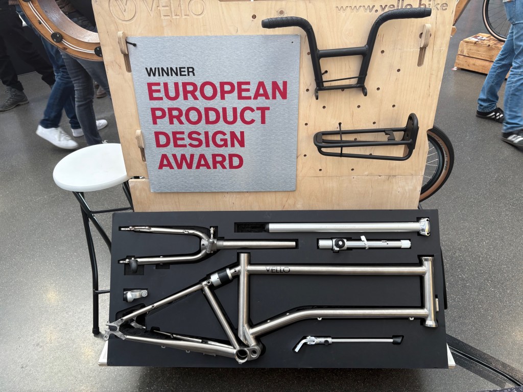 Eine sehr schöne Idee ist auch der Titan Bausatz des Vello Bikes für den Vello den European Product Design Award erhalten hat. In ihm sind alle Grundelemente das Vello Bike enthalten. Rahmen, Gabel, Sattelstütze und weiteren Kleinteilen, die speziell am Vello sind. Der Kunde kann dann die weiteren Elemente individuell zusammenstellen und sich sein ganz eigenes Vello Bike zusammenbauen. Die Serie ist auf 100 Stück limitiert und anscheinend ist es in unserer Gesellschaft mittlerweile so, dass das Wort „Limited“ ein absoluter Kaufanreiz ist. Man erzählte mir, dass sie selbst nicht damit gerechnet hätten, dass dies Sätze so schnell verkauft werden würden. Wer also noch sein individuelles Vello besitzen möchte, sollte sich beeilen. Ich schätze das einige dieser auch optisch gut verpackten Bausätze den Weg nie auf die Straße finden werden, sondern den van Gogh im Wohnzimmer von der Wand verdrängen.