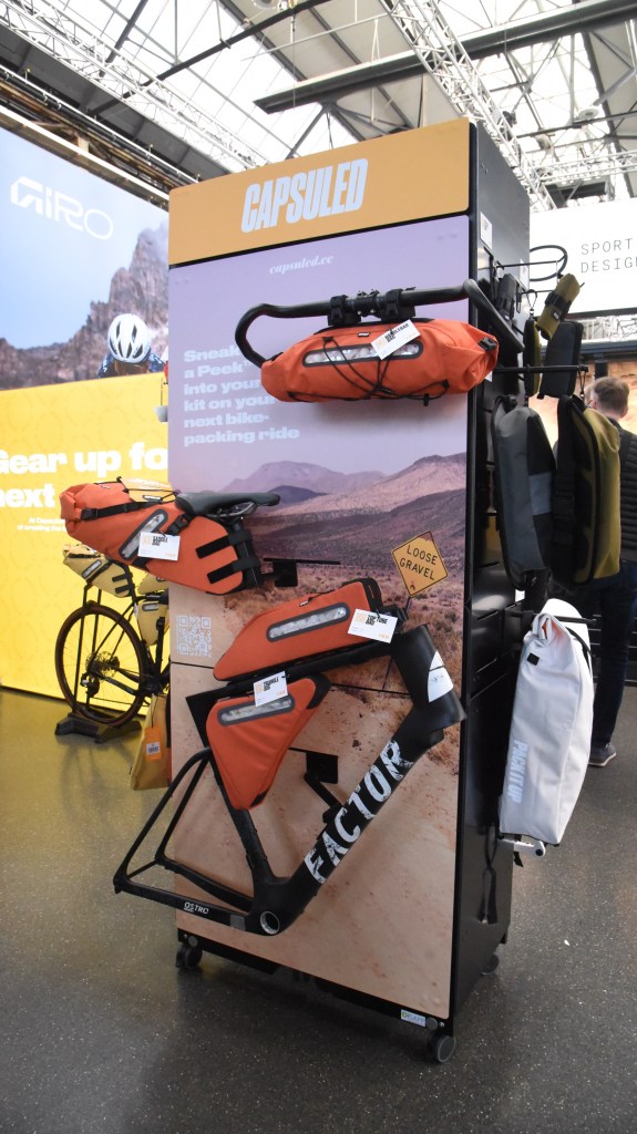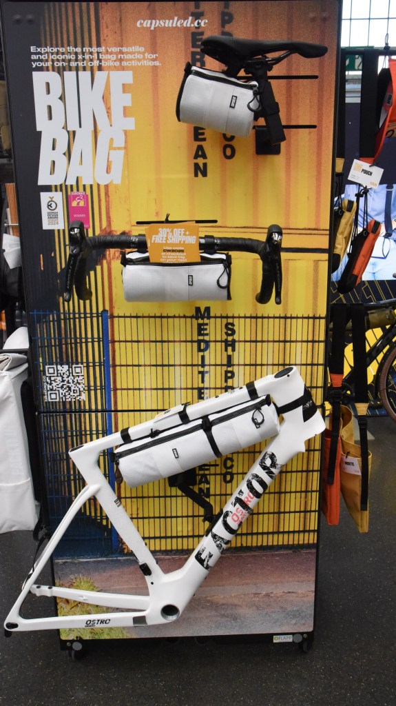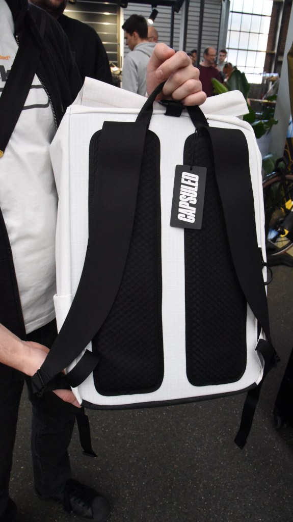 Die fest verschraubte Weinkiste auf meinem Hollandrad scheint out zu sein. Rucksäcke,Taschen und Rolls finden sich auf vielen Ständen. Die Materialien sind oft innovativ. Es wird auf Leichtigkeit und Reflektionen gesetzt. Capsuled wendet bei neuen Rucksäcken und Taschen besonders große Reflektionselemente an. Ich glaube, wir kommen nicht ohnehin uns als Fahrradfahren, insbesondere in den dunklen Tageszeiten durch auffällige Kleidung und Reflektionselemente an Rad und Ausstattung zu schützen, weil die, die uns gefährden, die Automobilindustrie immer mehr darauf setzt, dass ihre Fahrzeuge so gebaut sind, dass deren Lenker sicher bei Unfällen sind aber das Thema Rundumsicht überhaupt keine Rolle mehr spielt.