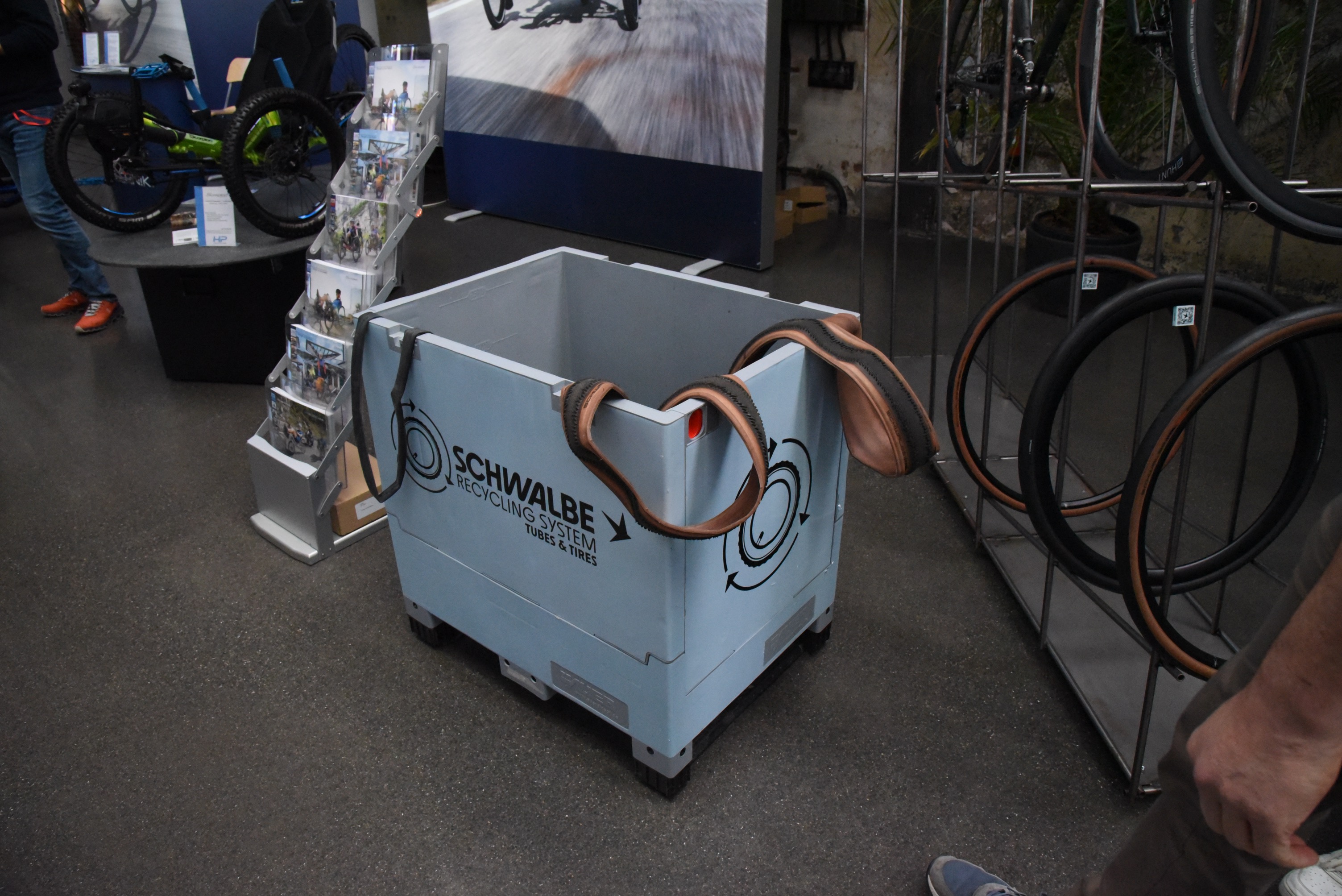 Nun bin ich schon seit gut einer Woche zurück von der Cyclingworld Europe 2025 und schaffe es leider heute erst meine Eindrücke vom zweiten Messetag zusammen zu fassen. Nach einem ausgiebigen Frühstück mit einigen Bloggern ging es bei wiederum strahlenden Sonnenschein zurück auf das Areal Böhler. Für diesen zweiten Messetag hatte ich mir vorgenommen, ein paar Anbieter aufzusuchen, die ich mittlerweile schon ganz gut kenne und nach Möglichkeit auch die ein und andere Probefahrt auf dem Testgelände zu machen. Gleich hinter dem Eingang fiel mir der Stand von „Me and My Bike“ auf. Ich weiß gar nicht warum, aber ich war ein paar Tage zuvor auf der gut gestalteten Internetseite dieses Radladens aus Düsseldorf gelandet. „Me and my Bike“ unterscheidet sich vielleicht gar nicht so sehr von vielen anderen Radläden, die ein breites Angebot aus Rädern und Zubehör bis hin zu Radleidung bieten hat bei mir aber eine sehr persönliche Eindruck hinterlassen. Ein Stück weiter steht eine Holzkiste im Weg. Alte Schläuche und Mäntel hängen über den Rand und stehen bei der Firma Schwalbe für ein ausgeklügeltes Recyclingkonzept. Schwalbe recycled Schläuche und Mäntel, um das Rohrmaterial für die Herstellung neuer Produkte wieder zu verwenden.