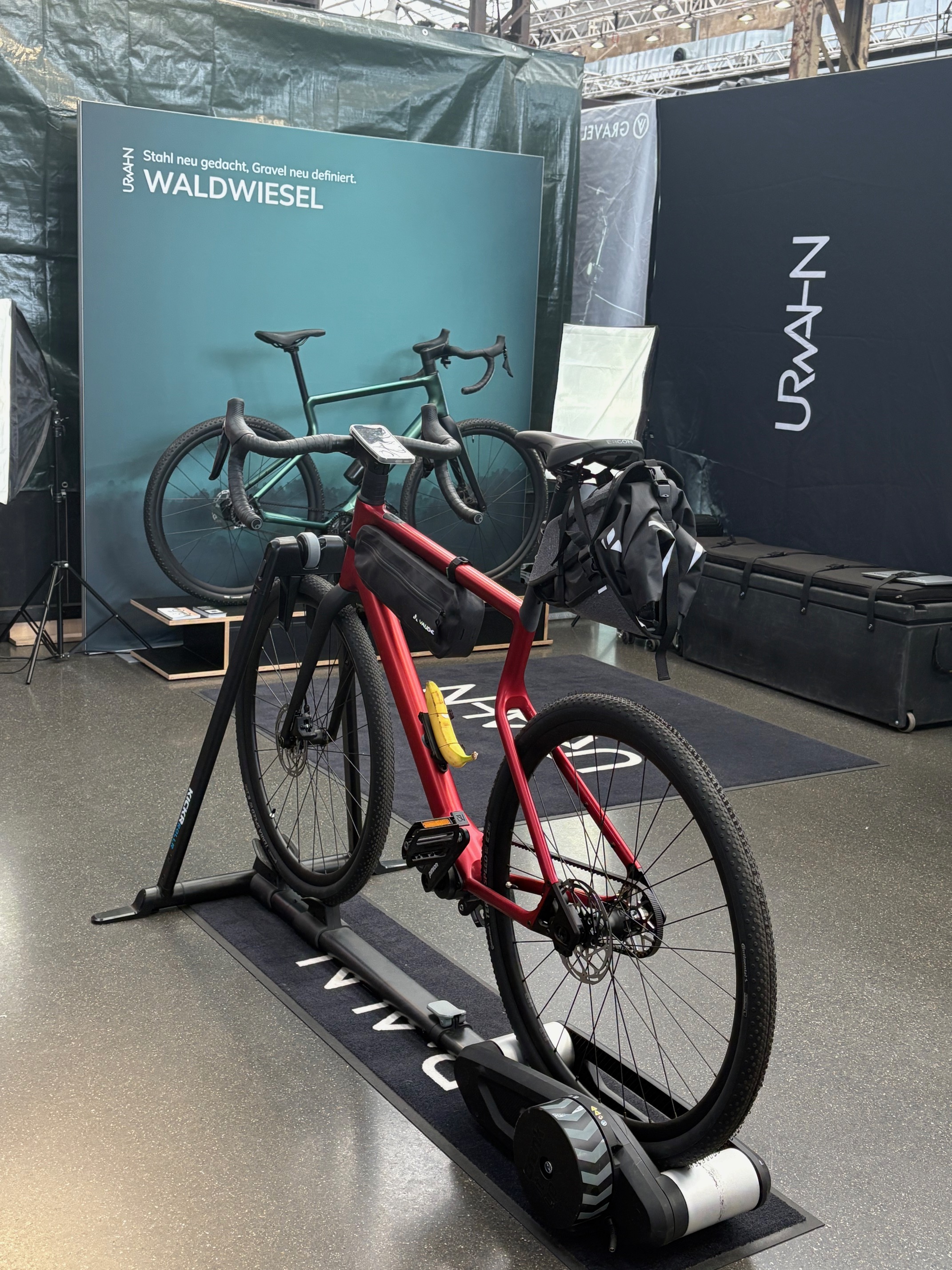 Anders kommen ein paar Hersteller wie zum Beispiel Urwahn daher, die es schaffen passable Akkuleistung so im Unterrohr unterzubringen, das es kaum auffällt. Die Knotenpunkte werden im 3D-Drucker hergestellt und mit den Rohren verklebt. Diese Produktionsform führt zu einem homogenen Rahmendesign und gefällt mir sehr gut, Wir werden zukünftig an vielen Stellen den Einsatz von 3D-Druckern erleben. Mir hat’s diesmal das Urwahn Waldwiesel angetan, ein auf Gravel ausgerichtet Bike mit oder ohne E-Antrieb und Piniongetriebe. Ich kann es nach dem Besuch des Messestandes auf dem Testgelände fahren. Auch wenn ich aus optischen Gründen kein Freund des Piniongetriebes bin, muss ich bei der Probefahrt feststellen, dass elektronische 9-fach Schaltung und Piniongetriebe mit dem E Antrieb hervorragend zusammenspielen. Das Rad verlangt nach mehr und so hoffe ich in nächster Zeit ausführlicher dieses Rad testen zu können. Früher warb BMW mit dem Spruch „nur Fliegen ist schöner“. Urwahn hat in abgewandelt in „Nie war Fliegen schöner“. Ich werde darüber berichten.