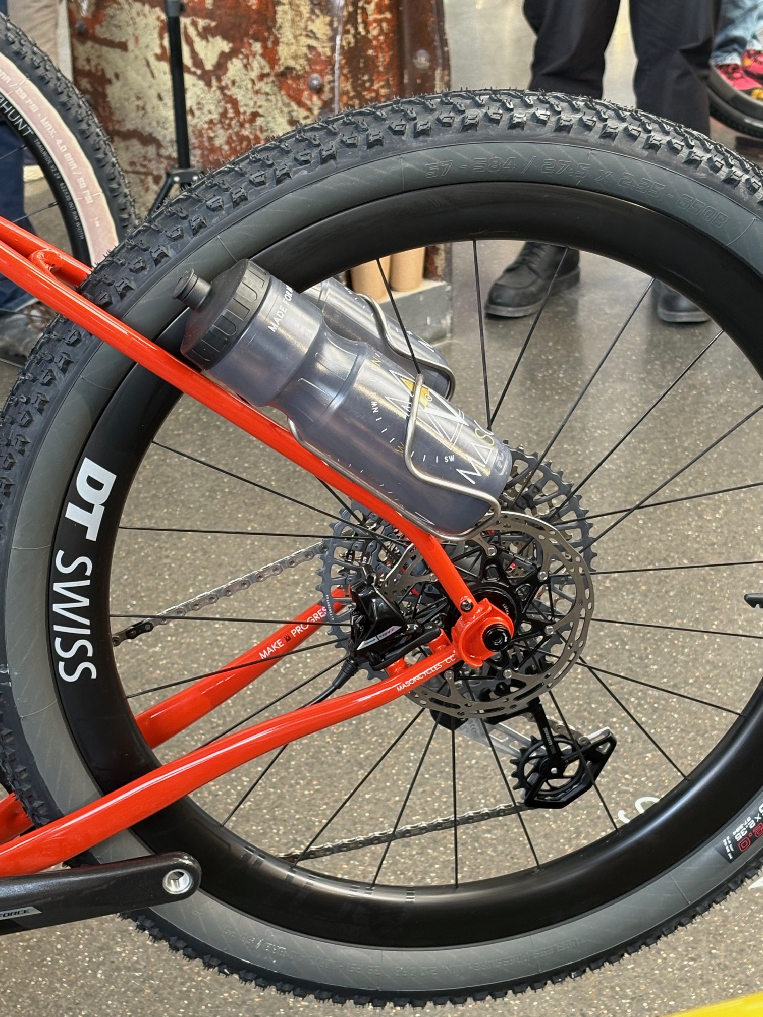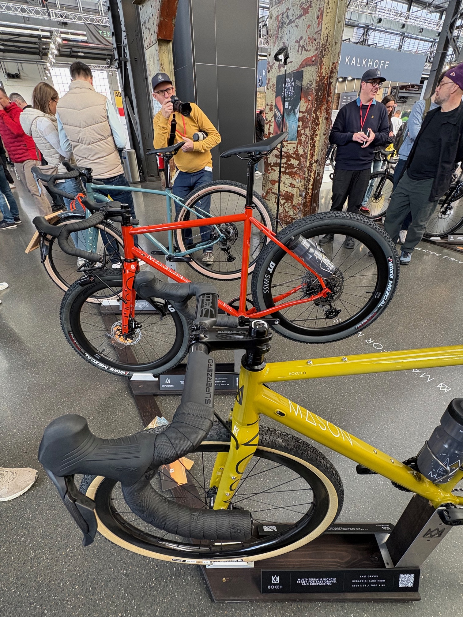 Zurück in der Halle komme ich noch bei Mason vorbei. Mason stellt auf der Cyclingworld sein Multicycle vor: breite Reifen, ein bequemen Lenker und vor allem eine Vielzahl von Befestigungspunkten für Bikepacking. Selbst für die Wasserflasche hat Mason eine besondere Position an der Sattelstrebe gefunden, wenn das Dreieck des Rahmens durch Bikepacking Taschen komplett gefüllt ist.